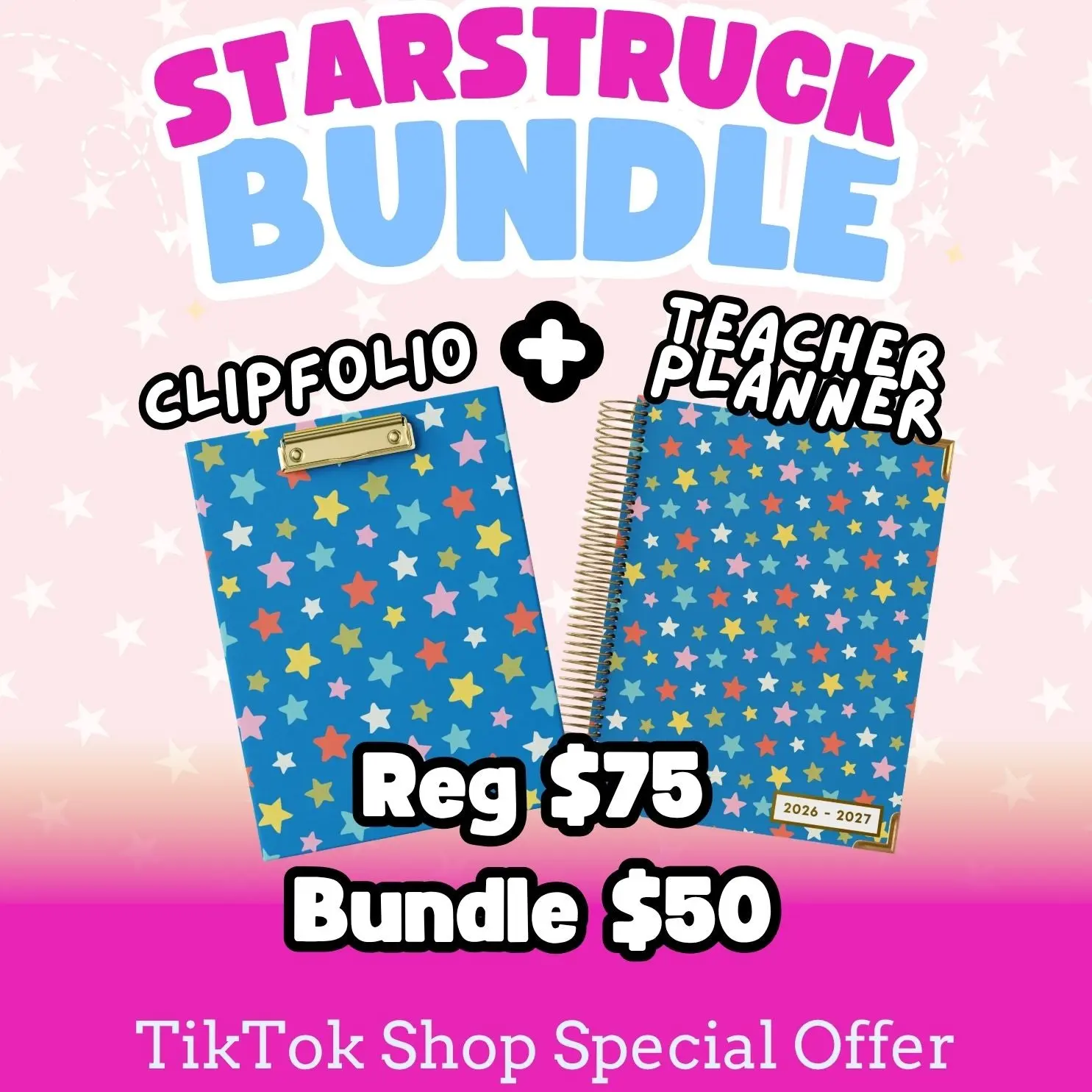 This bundle is available for a very limited time during the TikTok Flash Sale. It includes our Large Starstruck Premium Teacher planner and a Starstruck Clipfolio.