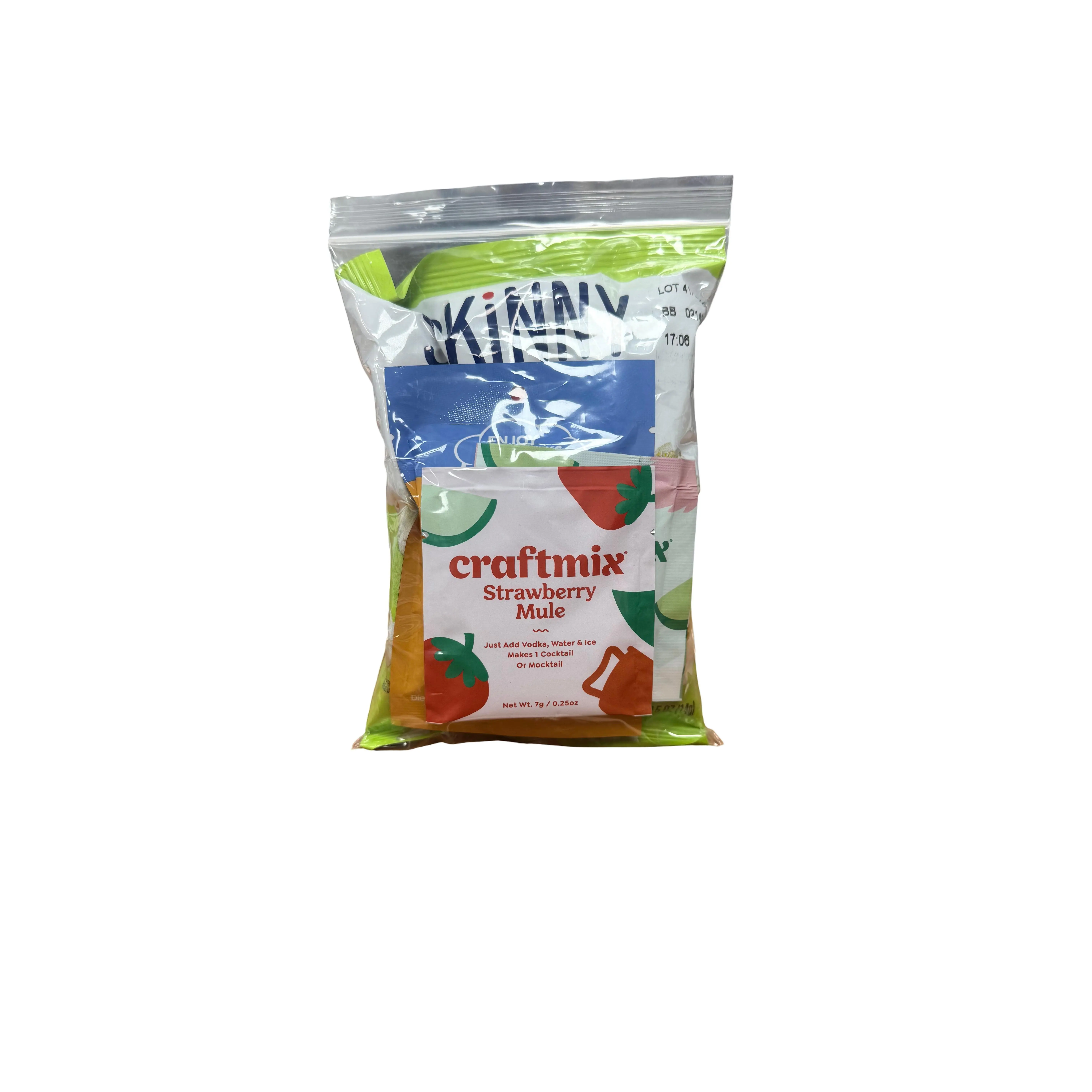 ·What You Get: Every Staying In Bundle comes with one pack of Skinny Pop popcorn, two Craftsmix cocktail mixes (just add booze and ice), and a pack of Before You Drink Gummies.