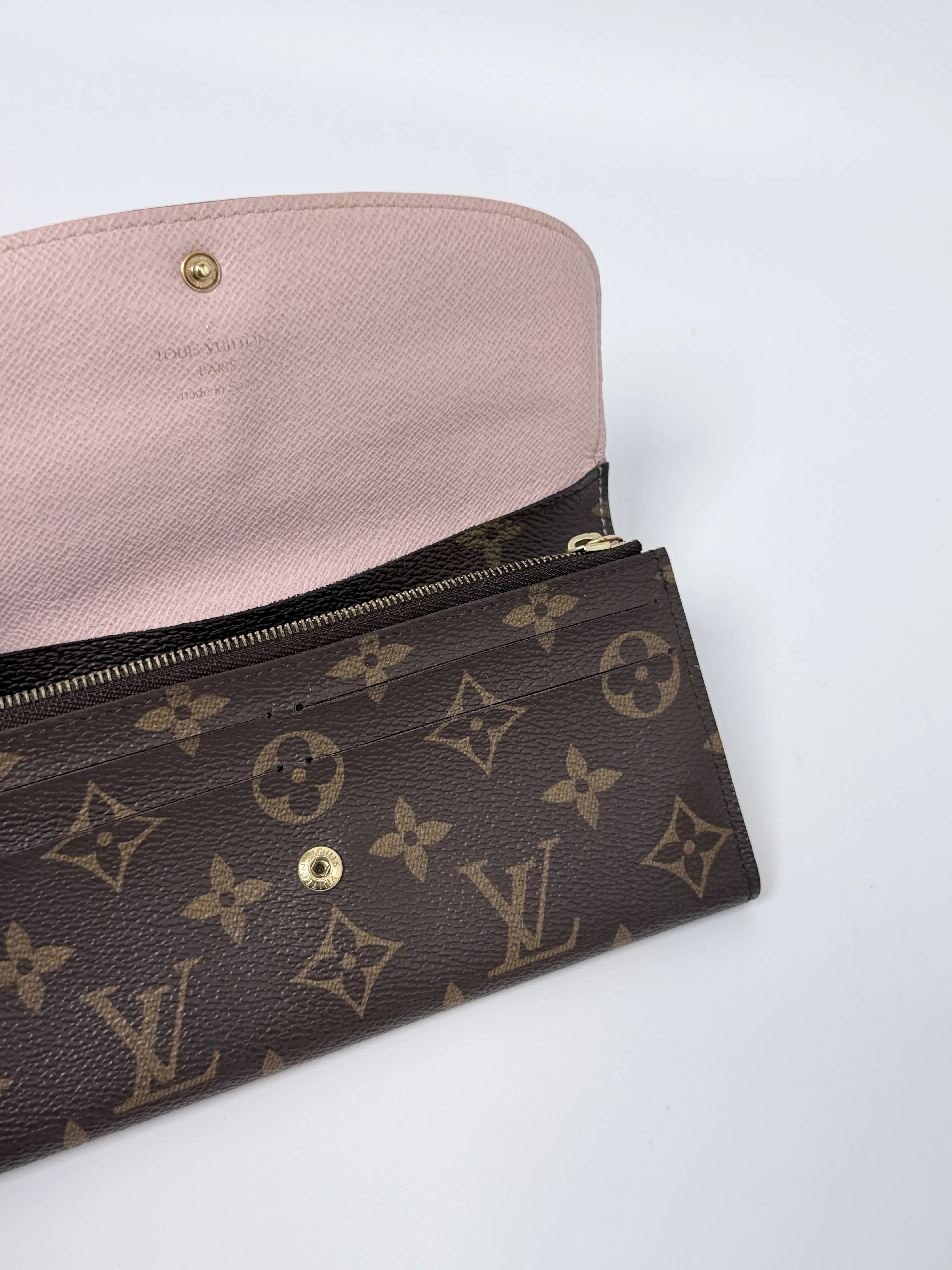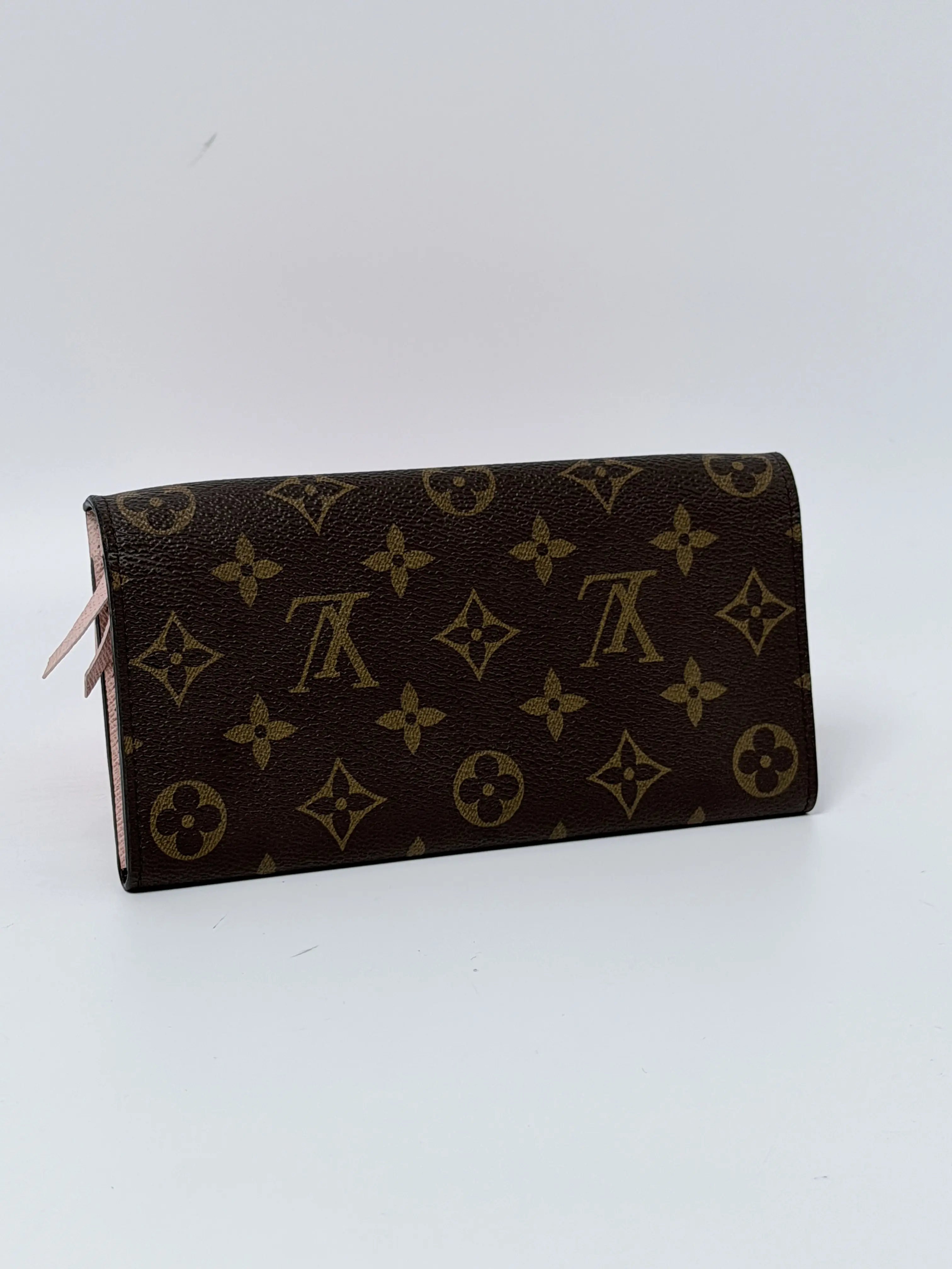 This authentic, pre-owned Louis Vuitton Emilie Wallet is a masterclass in combining elegance with practical design. Crafted from the house's iconic Monogram coated canvas, this wallet features a fresh, feminine update with a soft Rose Ballerine pink leather lining and a matching pink snap button. Its envelope-style flap opens to a well-organized interior that includes four card slots, two large flat pockets, and a central zipped coin compartment. This piece is slim enough to fit into most handbags while still providing ample space for cards and currency, finished with polished gold-tone hardware for a timeless luxury aesthetic.
