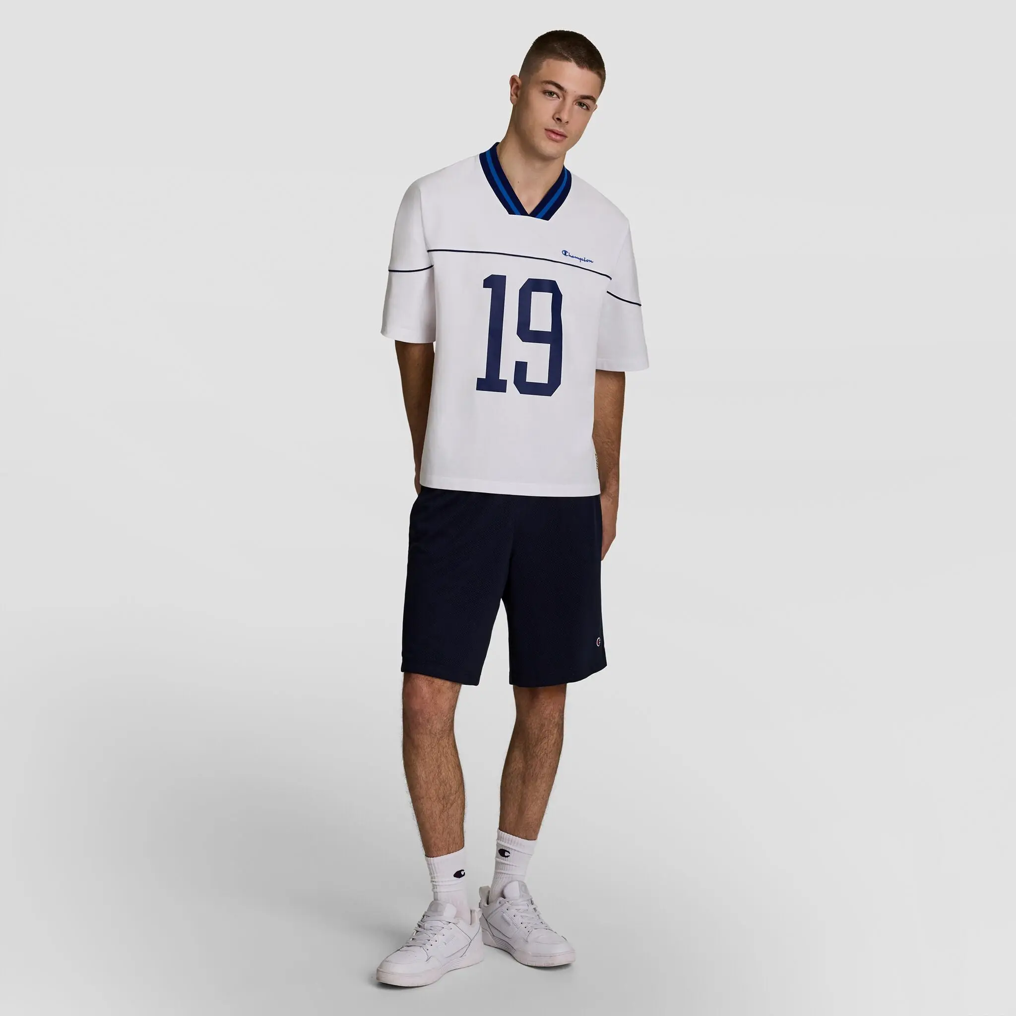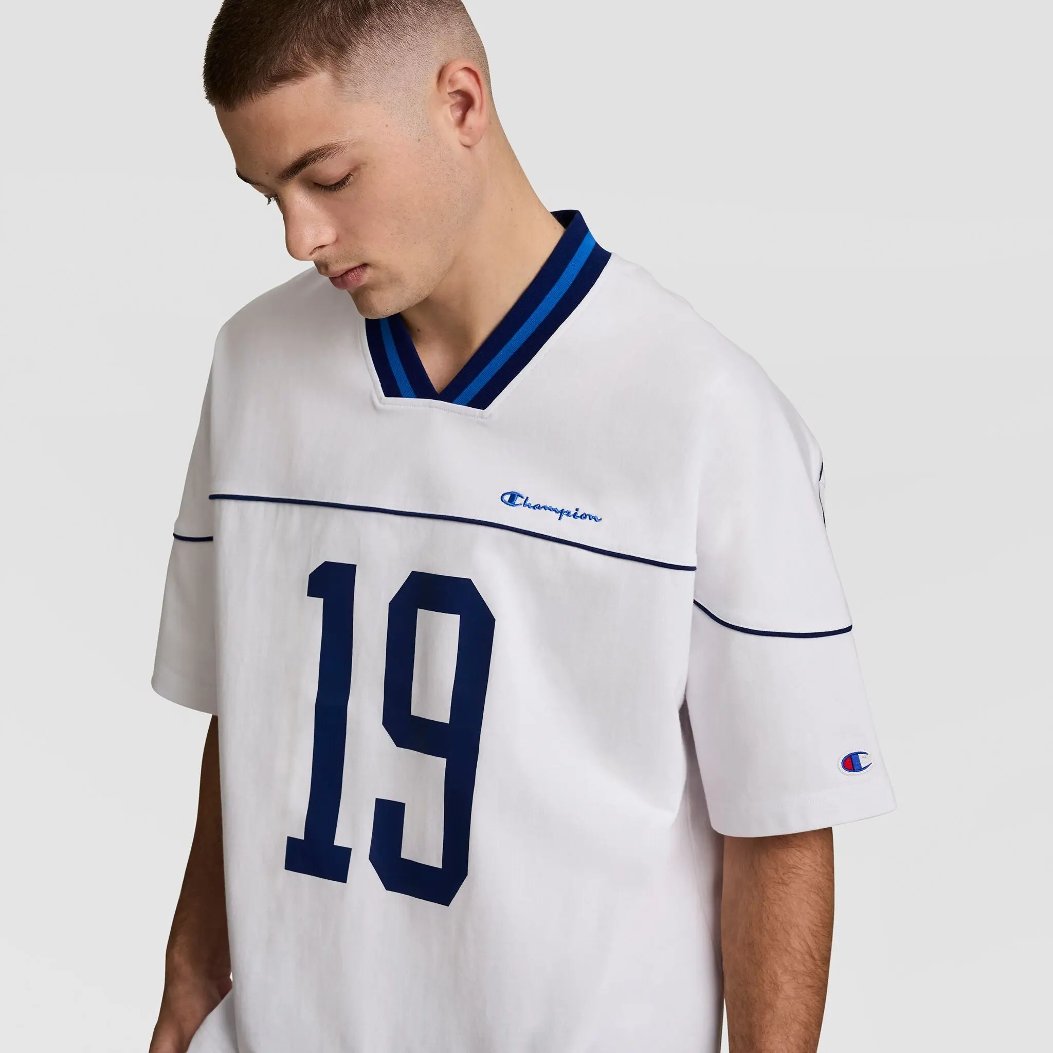 The Gridiron Football Jersey revives classic athletic style with a contemporary edge. Crafted from 100% polished silicon cotton jersey, this loose-fit V-neck features a bold “19” graphic and embroidered Champion script for an authentic gameday feel. Drop shoulders, contrast piping, and a yarn-dye rib neckline bring vintage attitude, while the jock tag and signature “C” patch lock in iconic sport heritage. It’s a statement piece built for the streets, inspired by the sidelines.