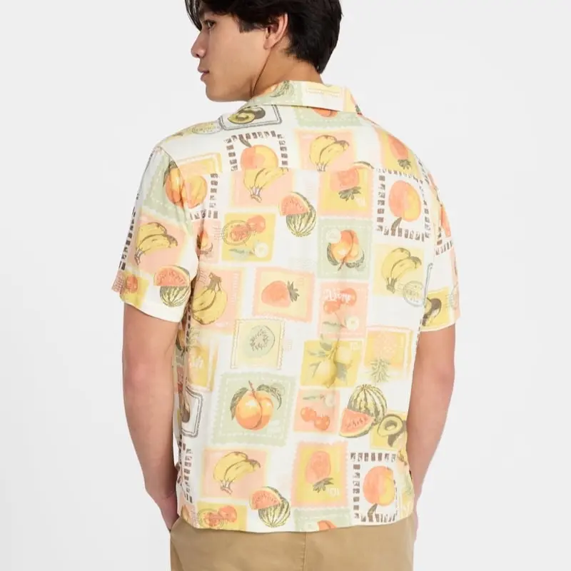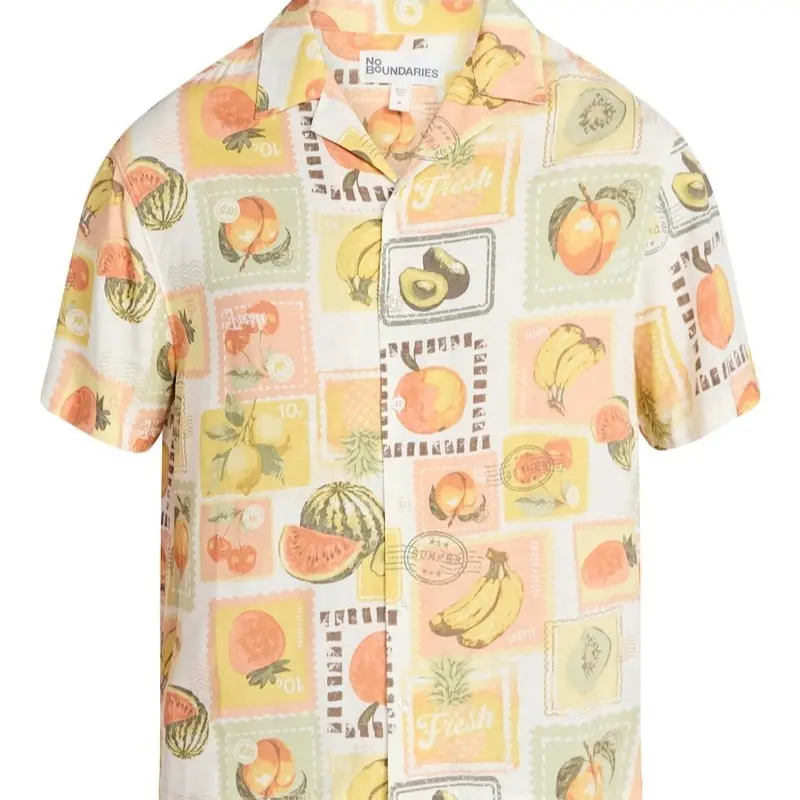 Cuban Collar ShirtFruit Print: Watermelon, peach, banana, avocado, and cherry.