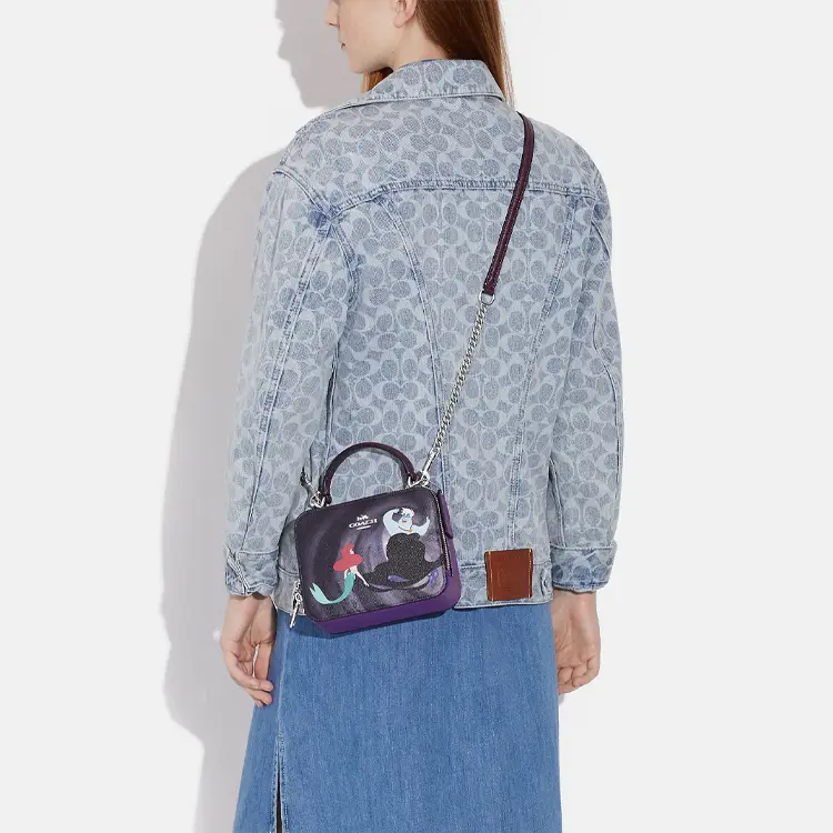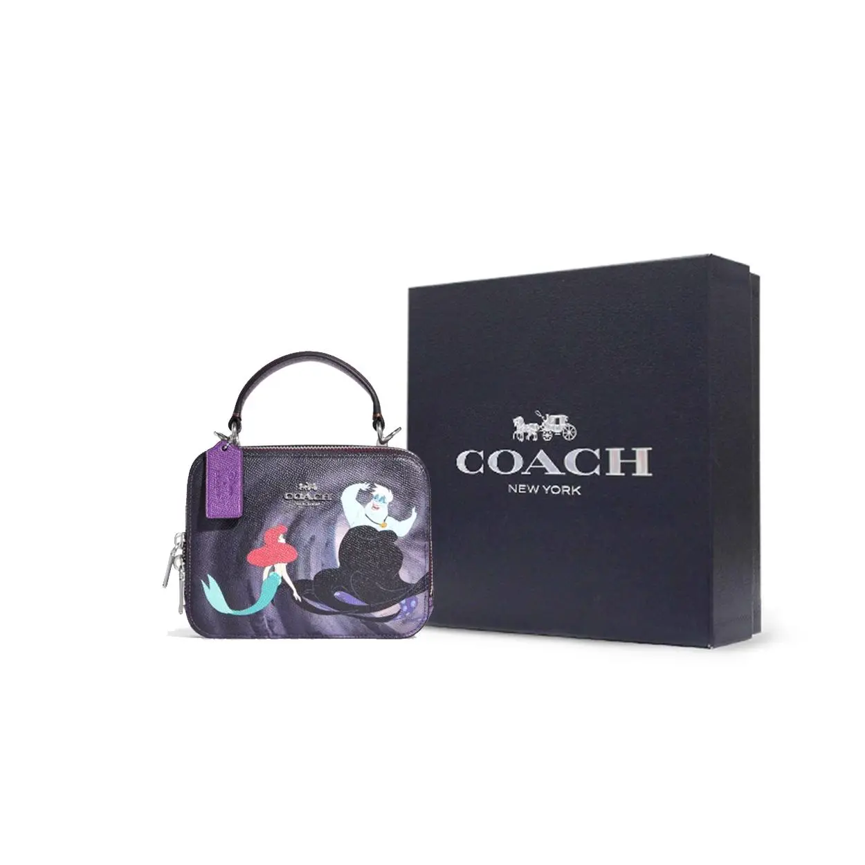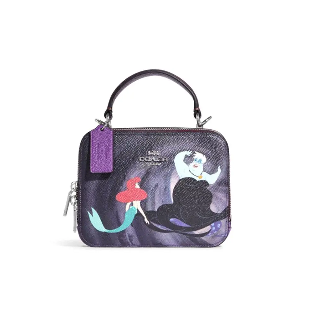 Design Concept: Inspired by Ariel’s adventurous spirit and oceanic elegance, the bag features playful yet refined cartoon prints of Ariel, Flounder, and Sebastian against a deep violet backdrop—blending whimsy with COACH’s signature minimalist sophistication.