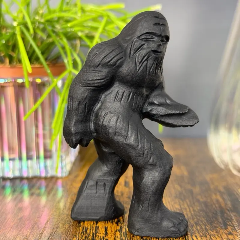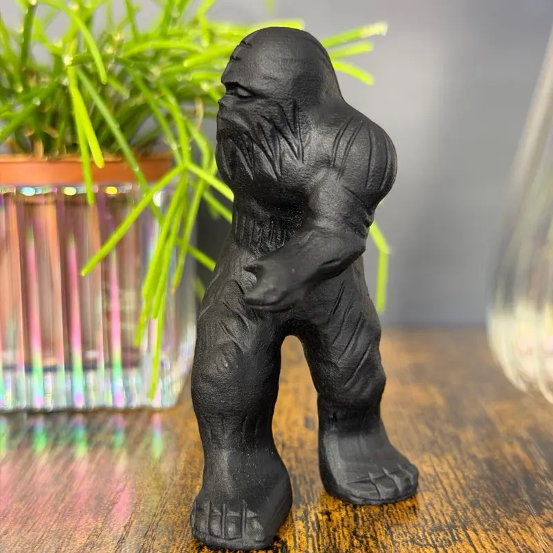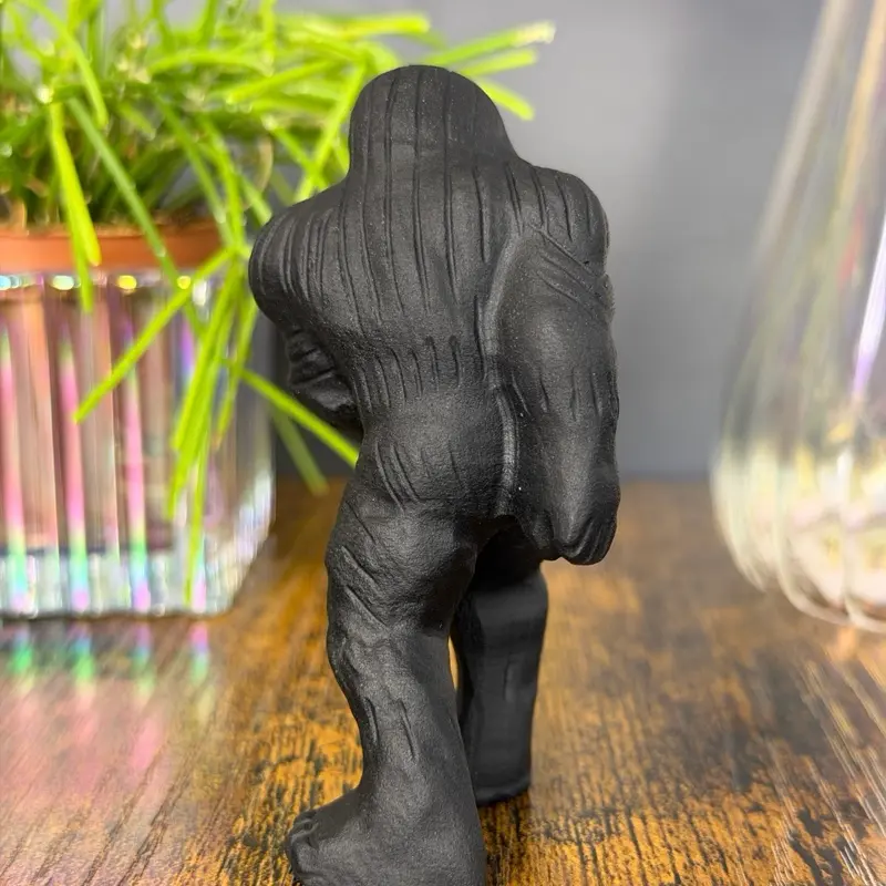 This unique Bigfoot (Sasquatch) carving is crafted from black obsidian, a natural volcanic glass formed from rapidly cooled lava. The piece features a matte, slightly textured finish that enhances the rugged, mysterious character of the legendary forest cryptid.