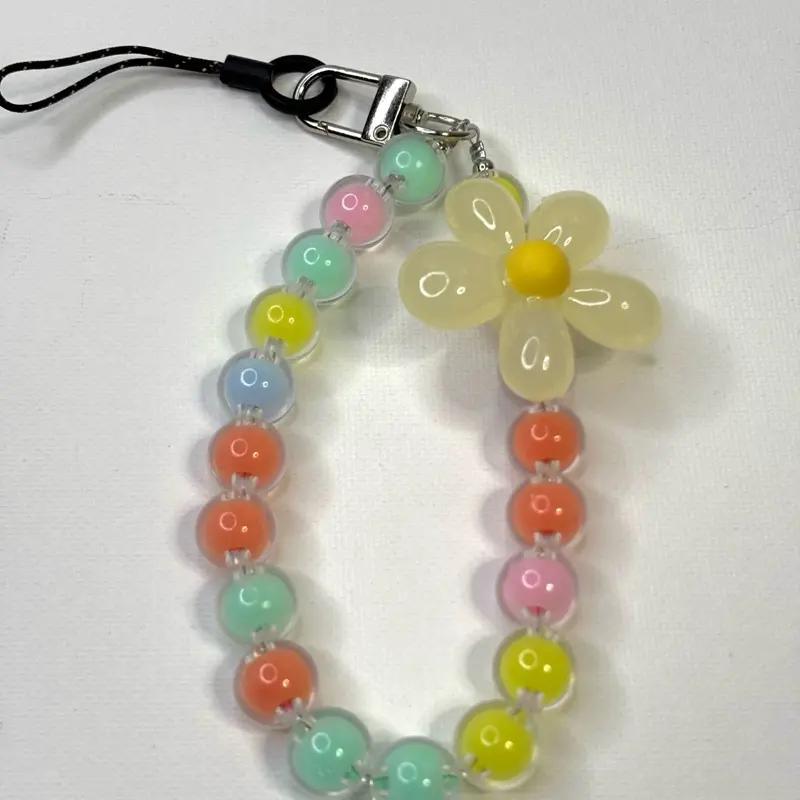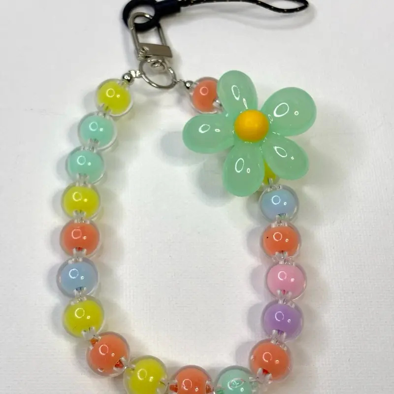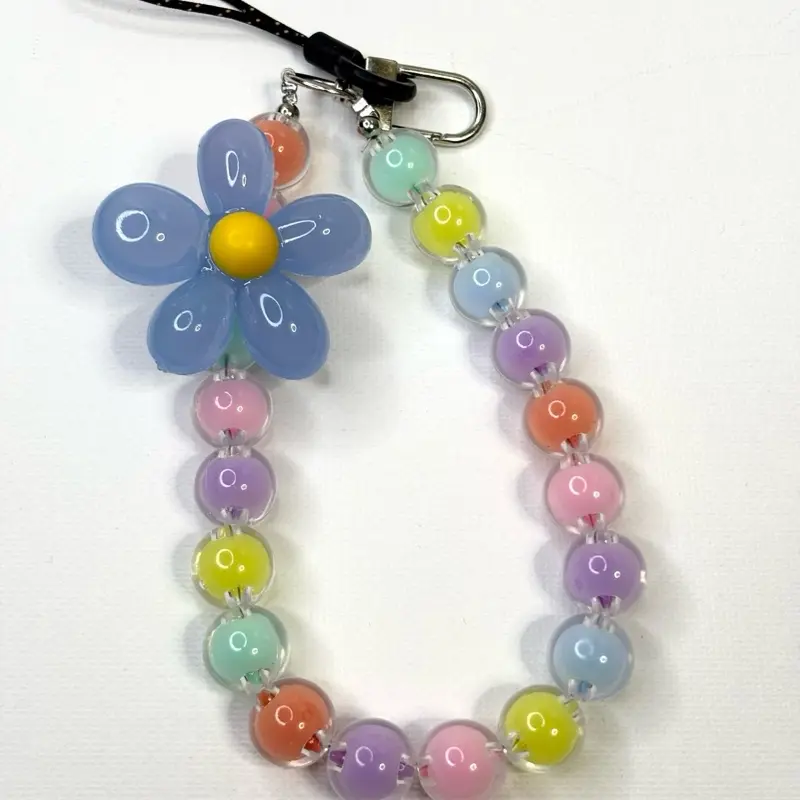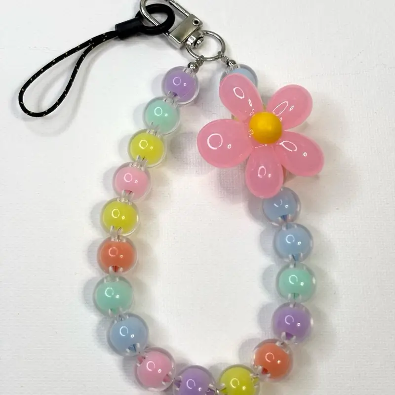 This lanyard features a beaded flower design, adding a touch of elegance to your phone. It includes a crystal charm keychain, making it a stylish accessory. Perfect for securing your phone with a fashionable twist.