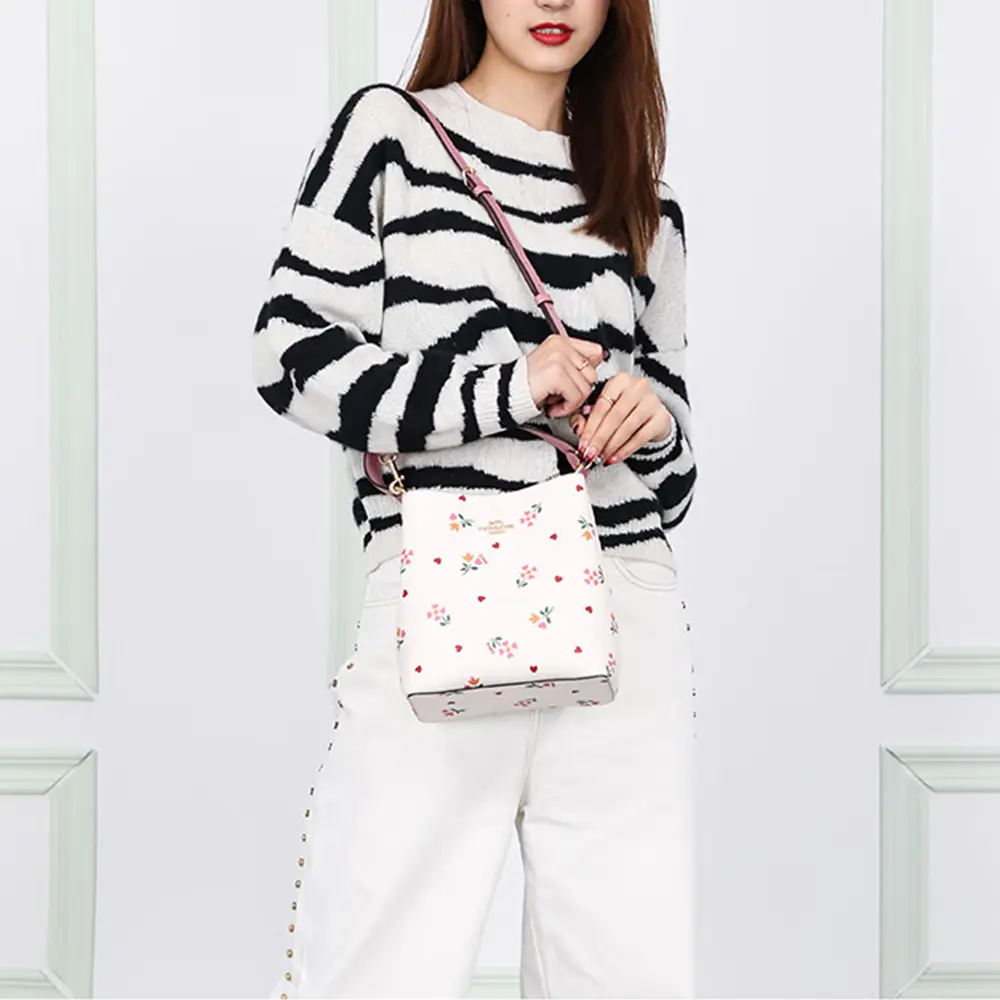 COACH Town 22 Metallic Carriage Logo Heart Floral Print Coated Canvas and Leather Bucket Bag for Women, Pink and White