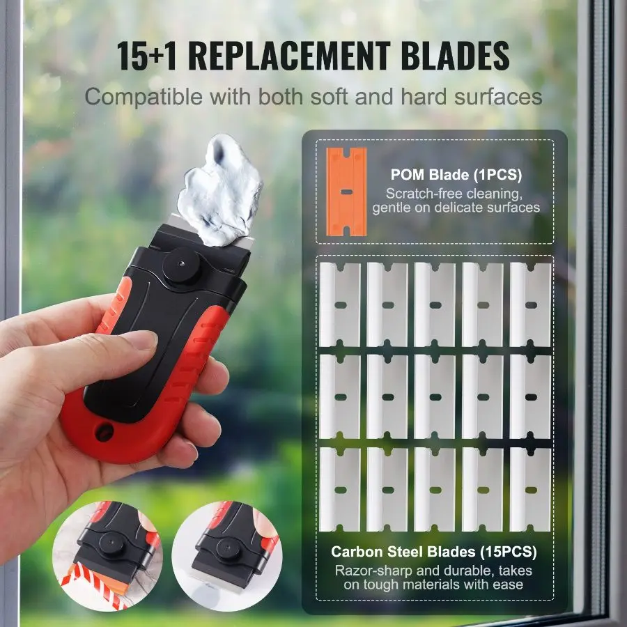 Our razor blade scraper tool comes with 15 carbon steel blades, suitable for cleaning tough, dirty marks and hard surfaces. Plus, the POM blade is suitable for cleaning stickers and surfaces without surfaces on hard and soft surfaces.