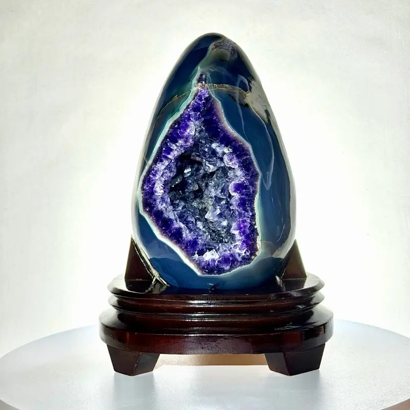 Natural Brazilian Amethyst Geode Standing Egg 10" Polished Agate with Custom Hardwood Display Stand for Home Decor at 8lbs | purple crystal natural amethyst supplier