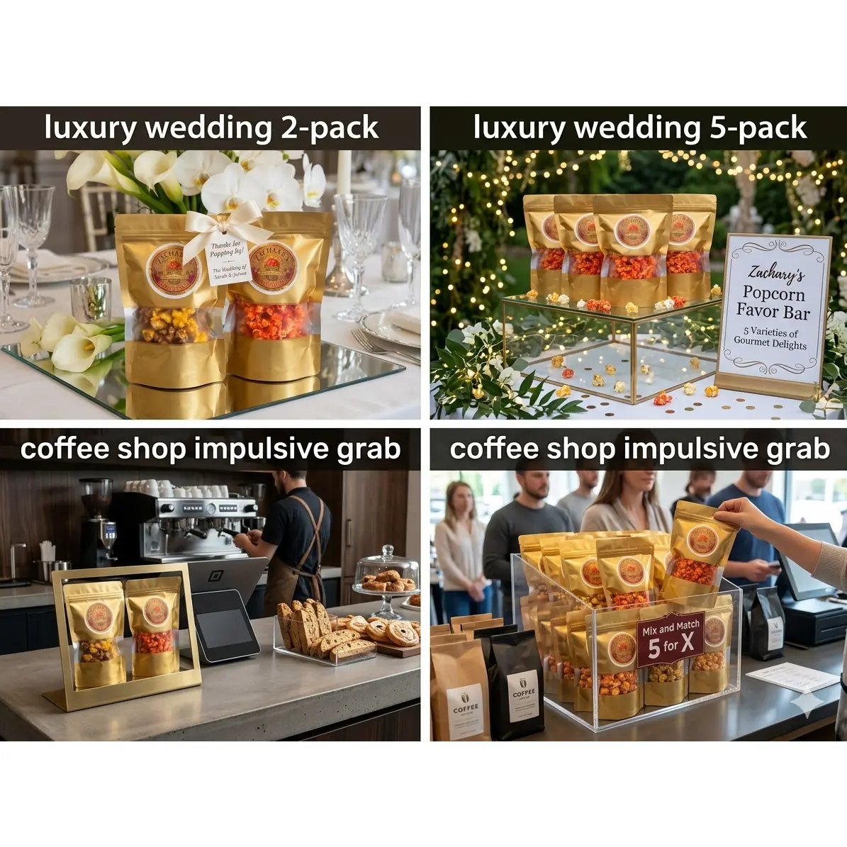 Zachary's Gourmet Snack Bags bring premium handcrafted popcorn in an elegant, portable size. Each 1.5oz (44g) gold matte bag is perfect for light snacking, lunchboxes, gift baskets, party favors, corporate gifting, or anytime you want gourmet popcorn without committing to a full bag. Nine bold flavors to choose from — including three exclusive blends available only in the snack bag lineup. Handcrafted in small batches in Chicago, IL and shipped fresh to your door.