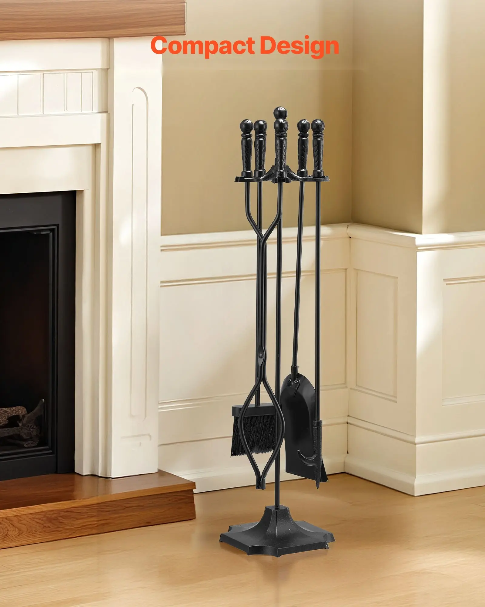 ·5-in-1 Fireplace Tool Set: This fireplace tool set includes a poker, ash shovel, brush, tongs, and tool stand. It easily handles fuel adding, fire adjustment, and ash cleaning. All parts work together, making fireplace use more efficient and convenient
