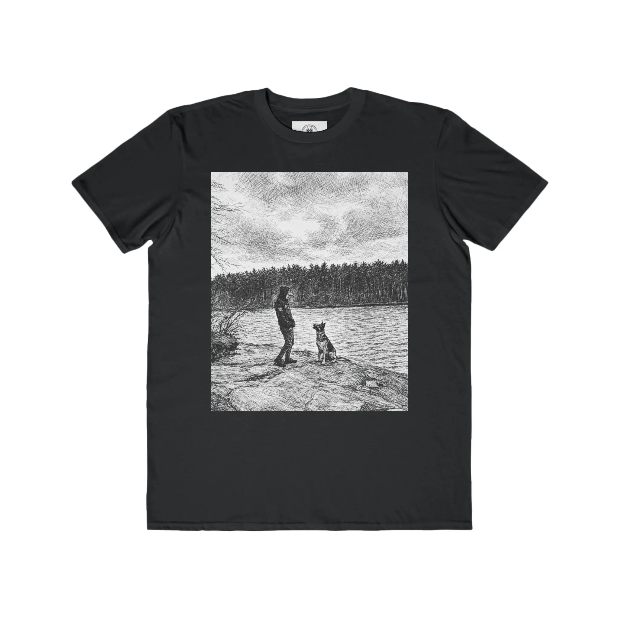 A lightweight, everyday tee that carries a quiet story — a solitary moment at the water’s edge, two companions framed against a wide, cloud-scattered sky. The soft, breathable cotton and modern classic fit make this shirt feel lived-in from the first wear. The monochrome, sketch-like print sits centered on the chest, giving the shirt a calm, reflective vibe that pairs easily with worn-in jeans or layered under a flannel for cooler mornings. This is clothing for those who choose slow mornings, lakeside walks, and honest conversation over noise — a simple piece that anchors a memory and wears like one.