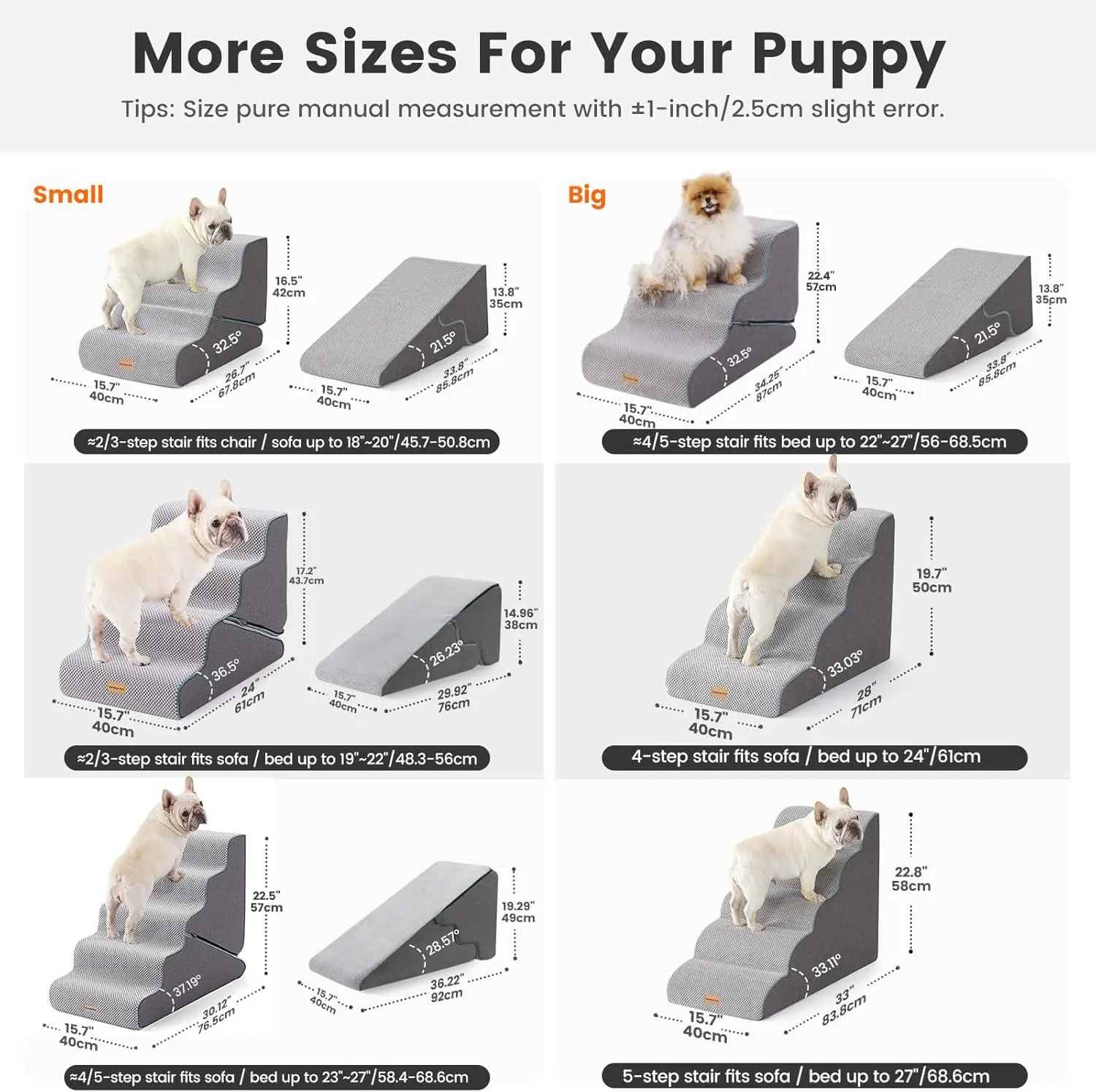 • VERSATILE 2-IN-1 TRANSFORMABLE DESIGN: Easily switch between a 3-step stair configuration and a smooth ramp to accommodate your pet's comfort and mobility needs. Perfect for helping small dogs, senior cats, or pets with joint issues reach couches and beds between 13-20 inches high without the risk of injury from jumping.