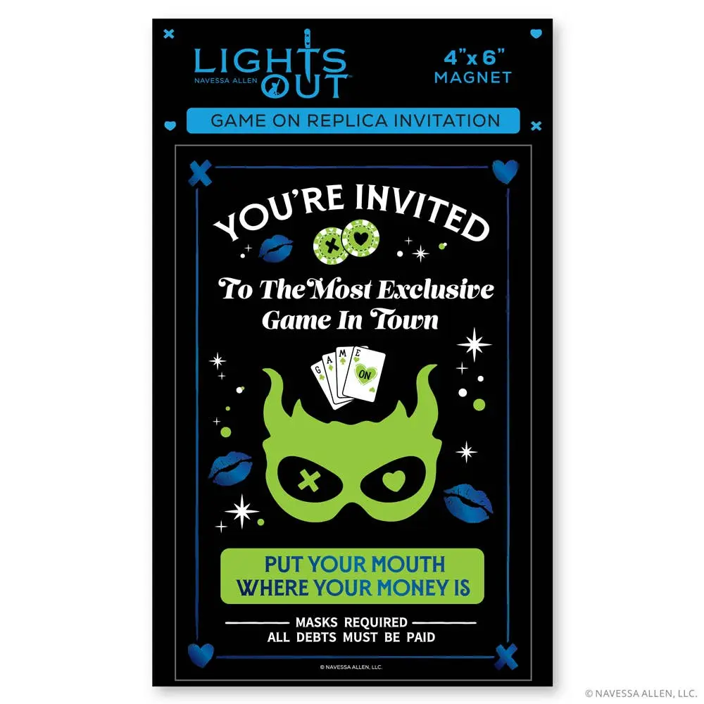 Crafted in full color with eye-catching foil details, this collectible magnet is designed to closely mirror the exclusive party invitation from Navessa Allen's Game On. The full-width, durable magnetic backing allows for easy display on any magnetic surface while keeping the piece flat and vibrant for long-lasting use. It's the perfect addition to any dark romance reader's fandom collection and makes an irresistible gift for fans who know what happens when someone RSVPs "Yes."