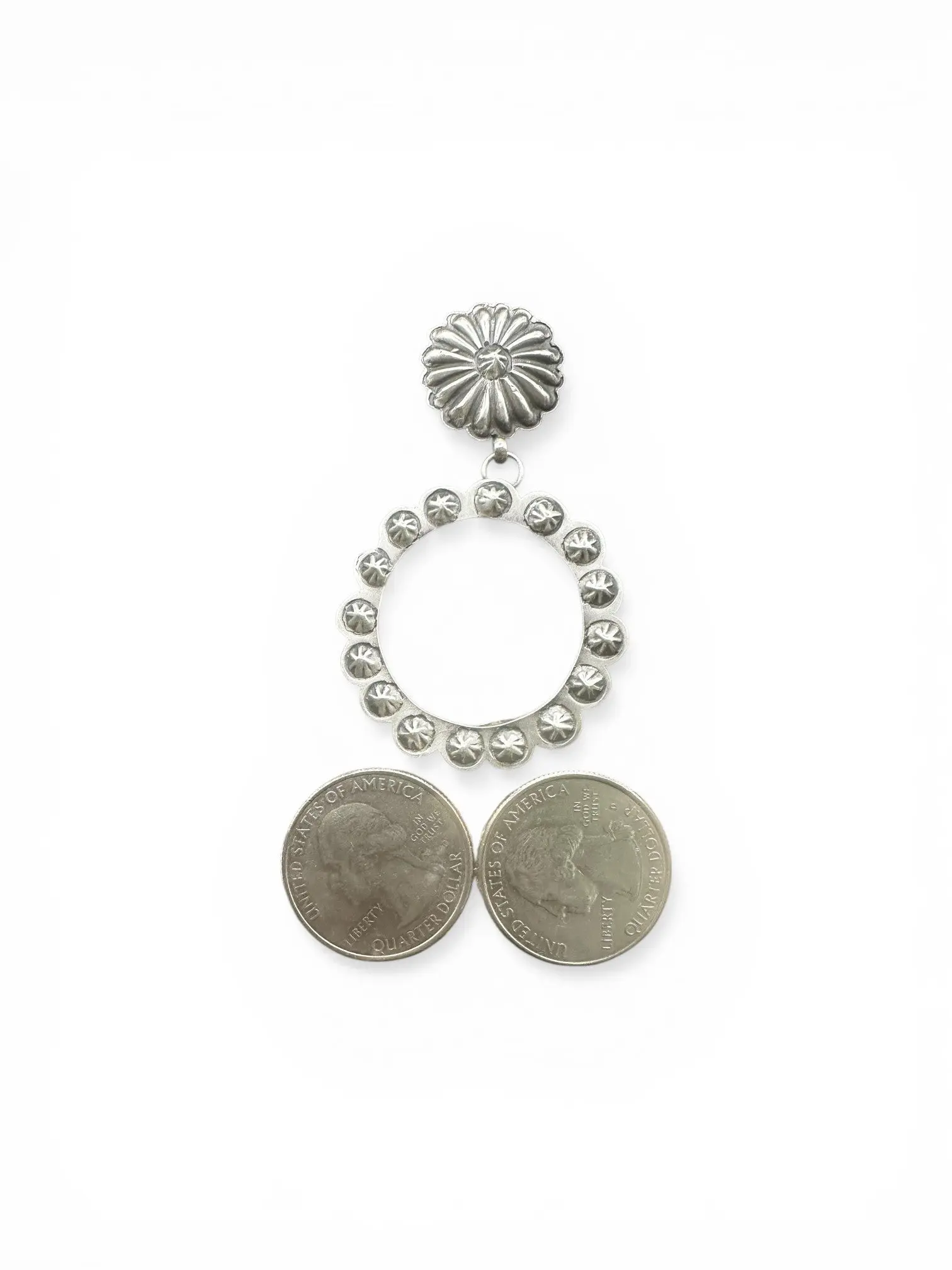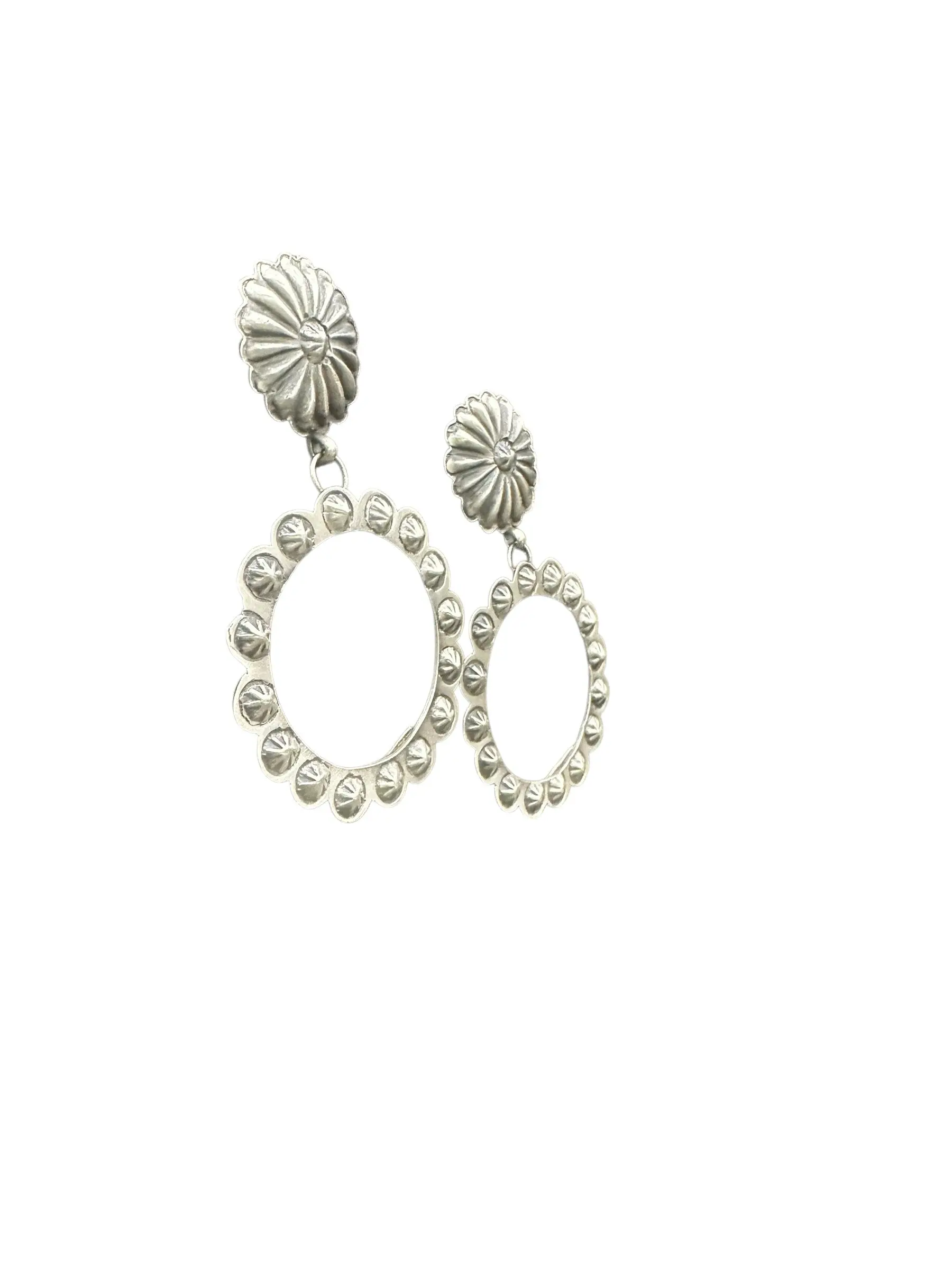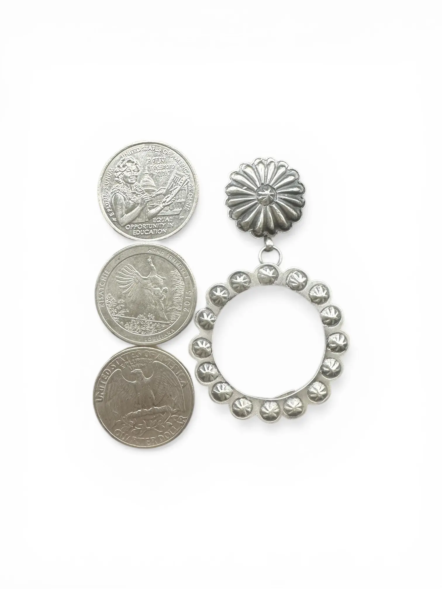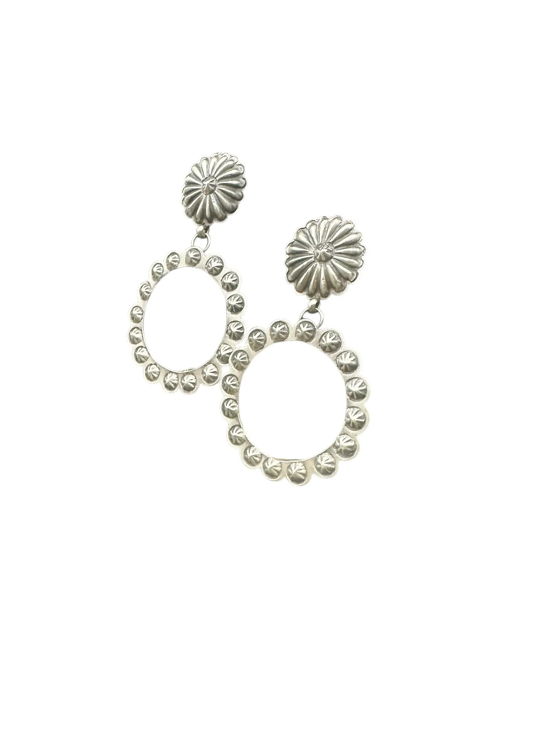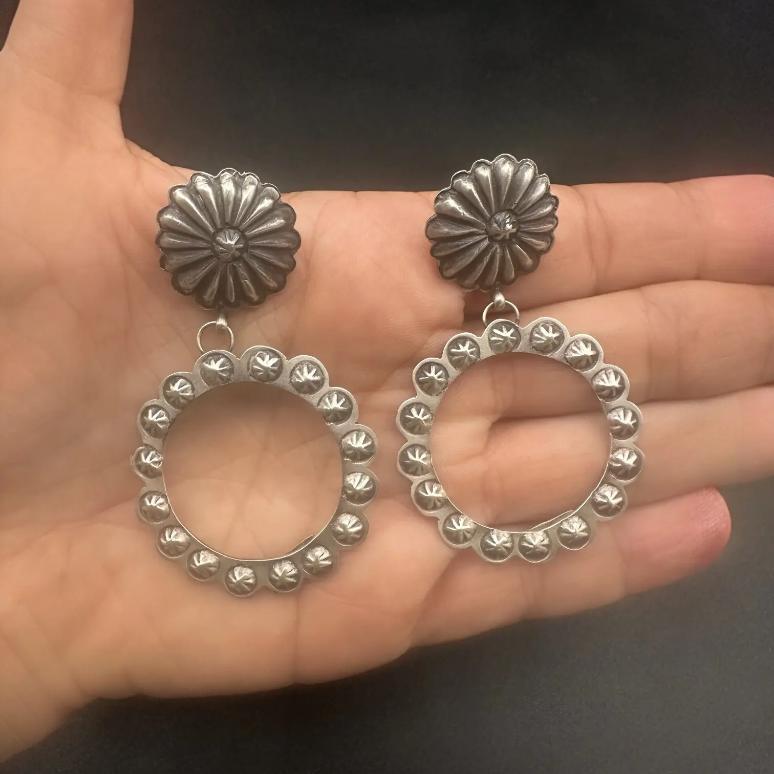 Floral Earrings; Concho Earrings; Stamped Earrings; Navajo Earrings; Native American Earrings; Western Earrings; Rodeo Earrings; Sterling Silver Earrings; Western Fashion; Rodeo Fashion; Handmade Earrings; Drop Earrings; Dangle Earrings; Turquoise Jewelry; Statement Earrings;