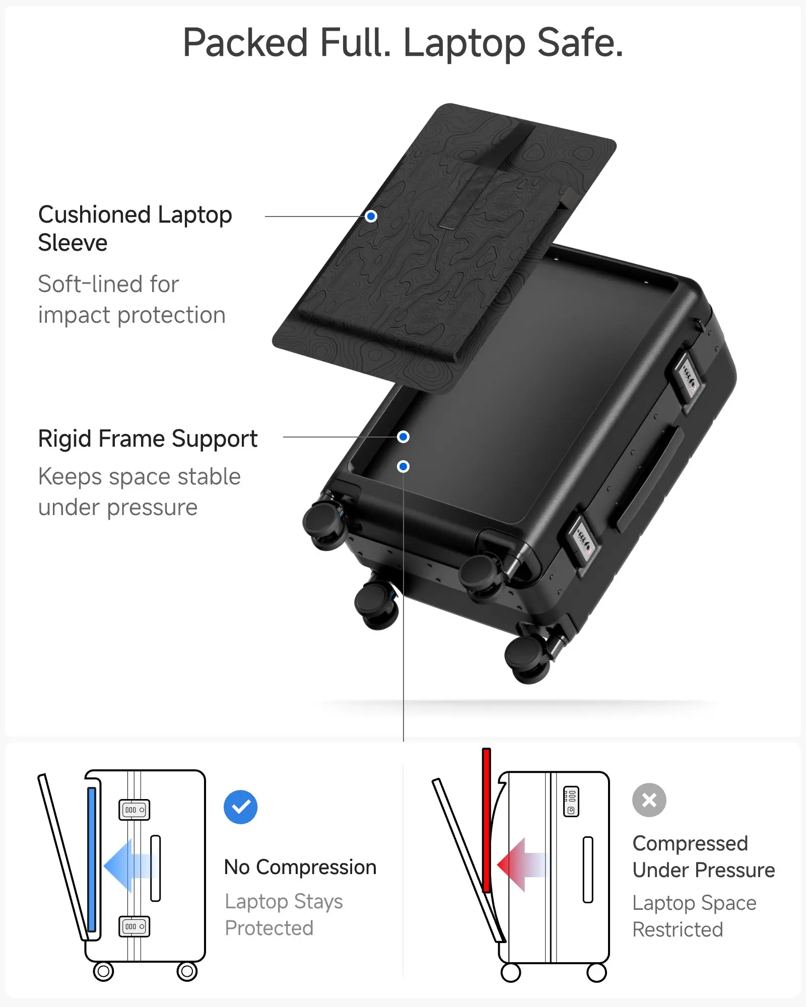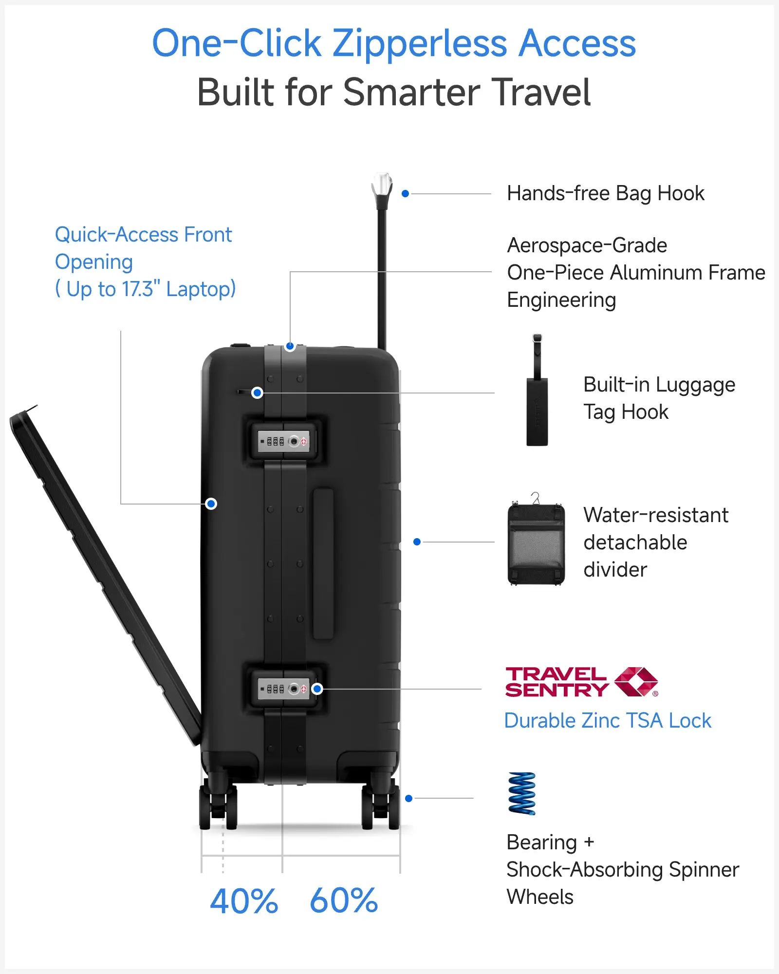 • Quick-Access Front Opening for 17.3" Laptops - TSA Approved Say goodbye to airport unpacking hassles! Our patented front-opening design lets you access your laptop in seconds. The padded compartment fits laptops up to 17.3 inches, making TSA security checks a breeze. Perfect for business travelers who value efficiency and convenience.