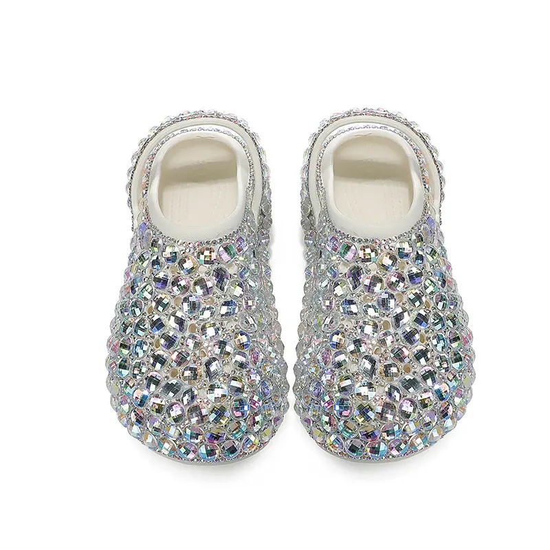 These FoamFam Clogs are perfect for transitioning from party to vacation. They feature a full rhinestone platform and thick sole, offering a light luxury look. Ideal for everyday glam and outdoor events, these shoes are handmade and custom. Bedazzled with crystals, they add a bling touch to any outfit.