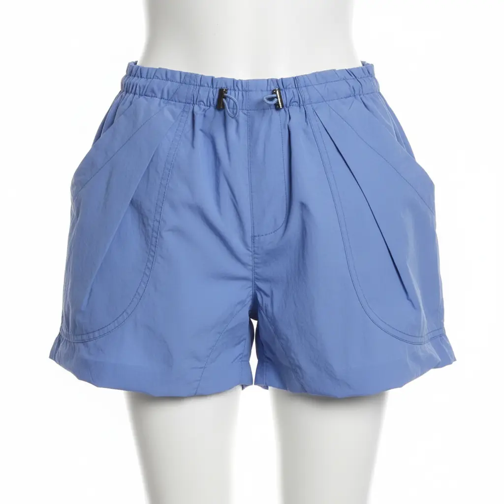 Pull-on design, bungee waistband, banded hemlines, oversized side pockets, sporty nylon fabrication
