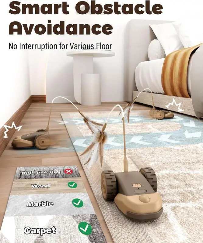 ·【Smart Obstacle Avoidance: No Interruption for Various Types of Floor】 Equipped with an obstacle avoidance timer, this automatic cat toy enables reverse, tumble or change direction every few seconds when crashing into the walls, sofa or other furniture without any break on various floors surfaces like wood, tile, marble and carpet. (Note: May not function well on high-pile rugs.)