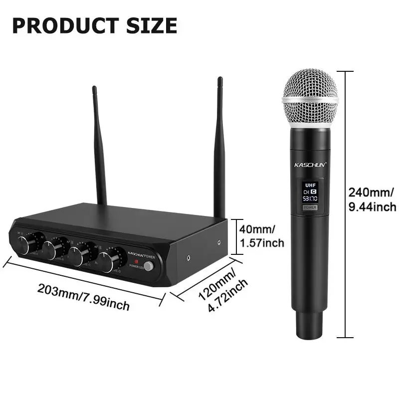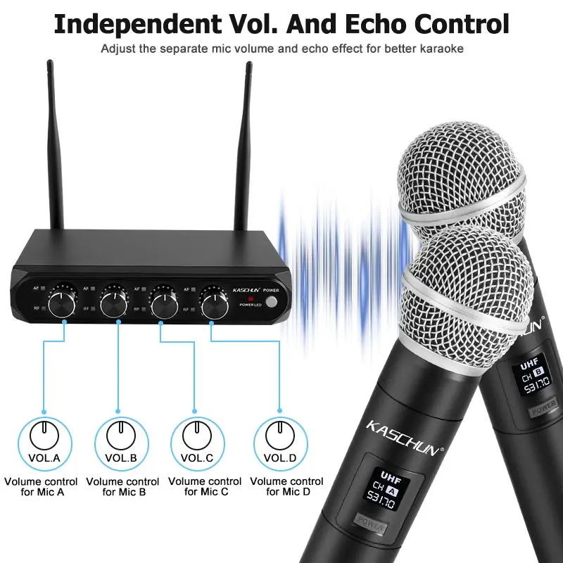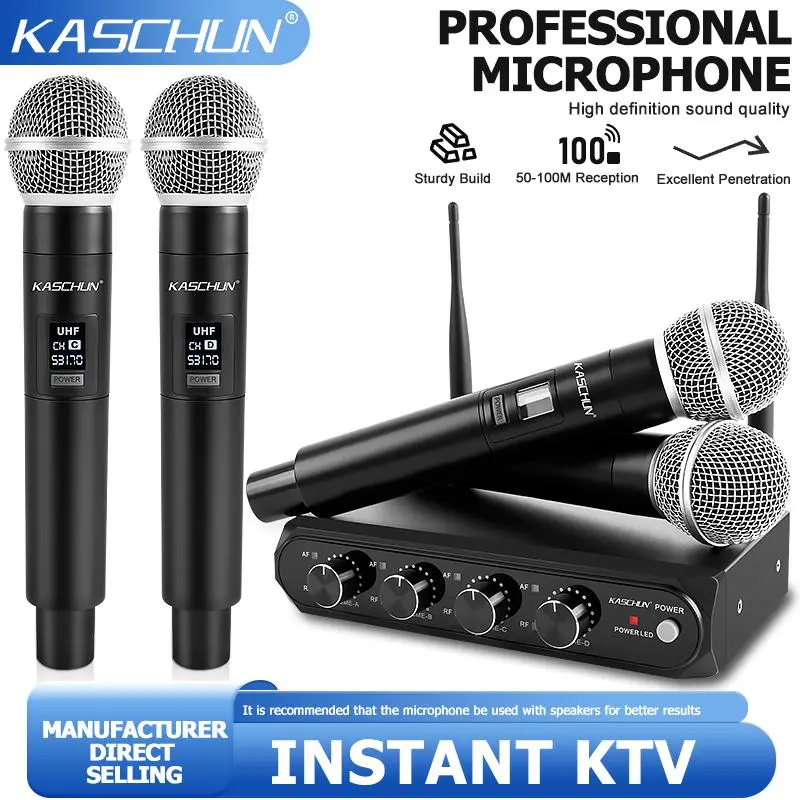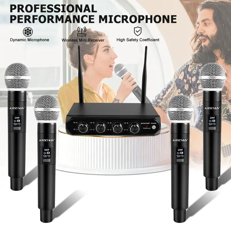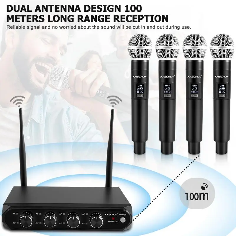 KASCHUN offers a 4-Channel UHF Wireless Microphone System with 4 handheld dynamic mics. Enjoy a 100M range with dual audio output. Ideal for karaoke, parties, church, weddings, and live performances. This system ensures seamless audio without interruptions.