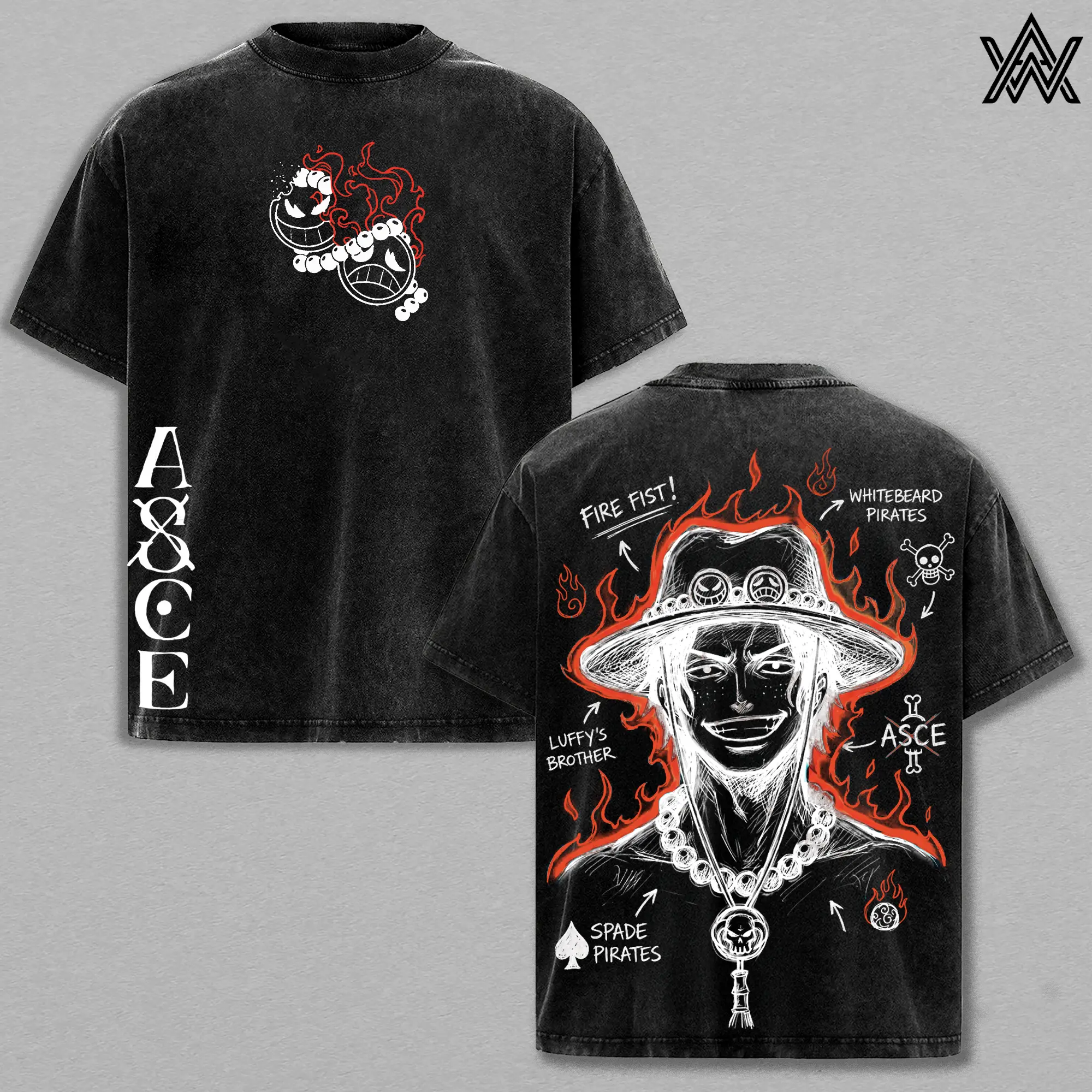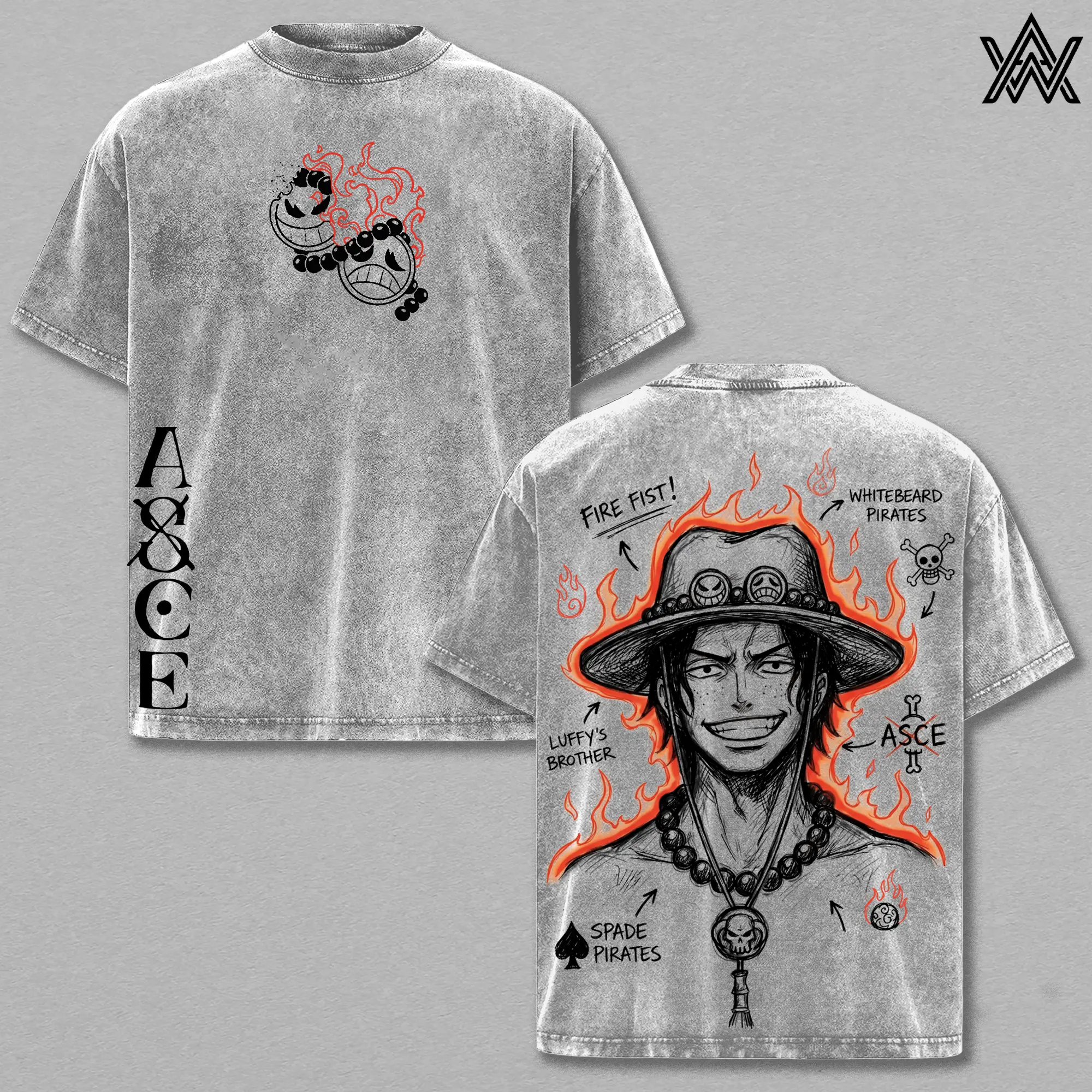 Portgas D. Ace Tee Wash – One Piece Washed Anime Manga T-Shirt, Vintage Washed Flame Fist Pirate Graphic Tee, Unisex Oversized Streetwear Shirt, Whitebeard Commander Anime Aesthetic Tee, Gift for One Piece Fans
