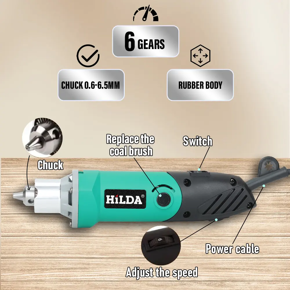 6 speeds. 0.6–6.5 mm chuck. Rubber grip. The HiLDA rotary tool does it all. Precision at your fingertips.
