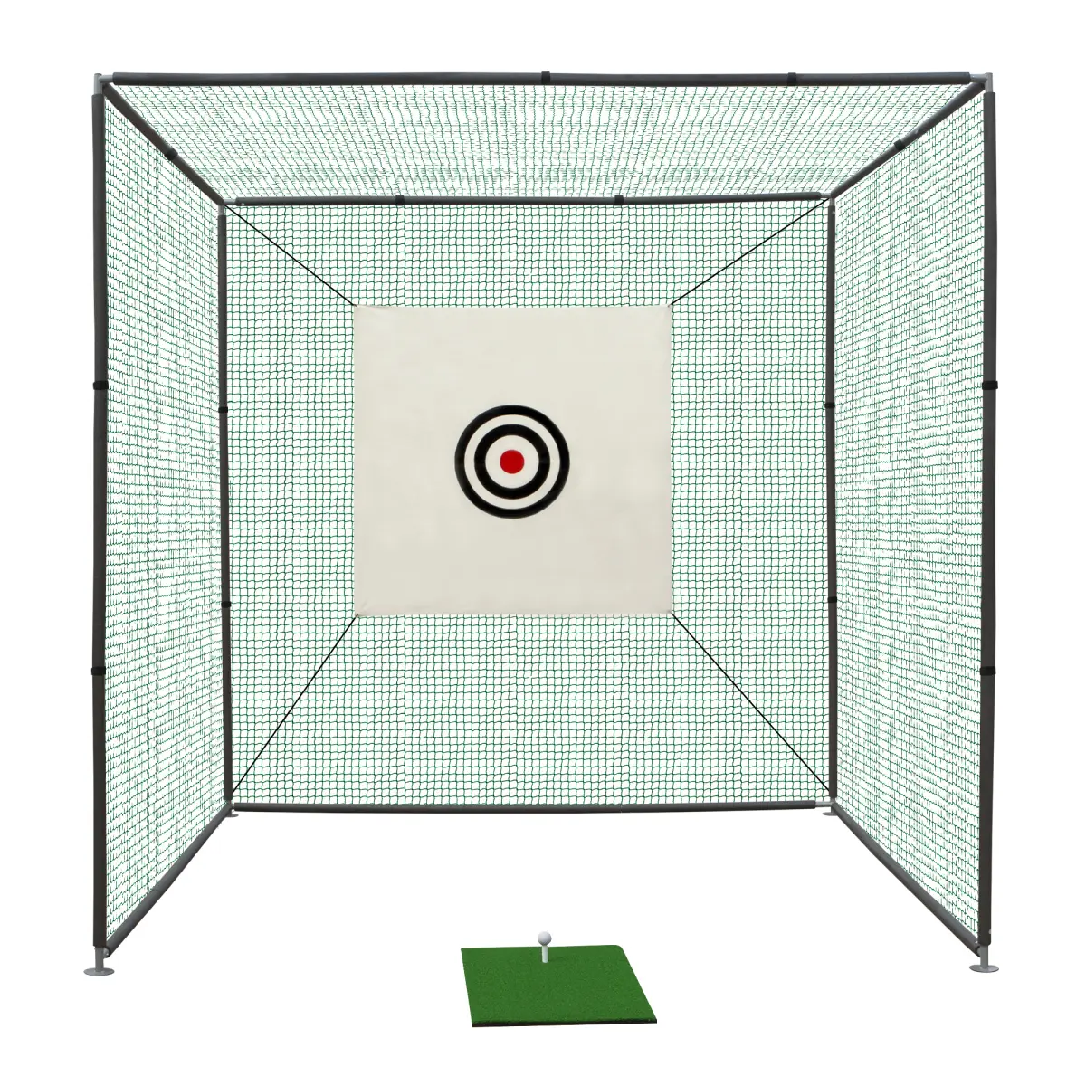 Material - Coated steel tubes, EVA foam, polyethyleneColor - Black frame & green meshSize - 118.11''x118.11''x118.11''Target - 59.05''x59.05'Dimensions of the mat - 31.5''x19.7''