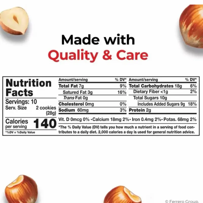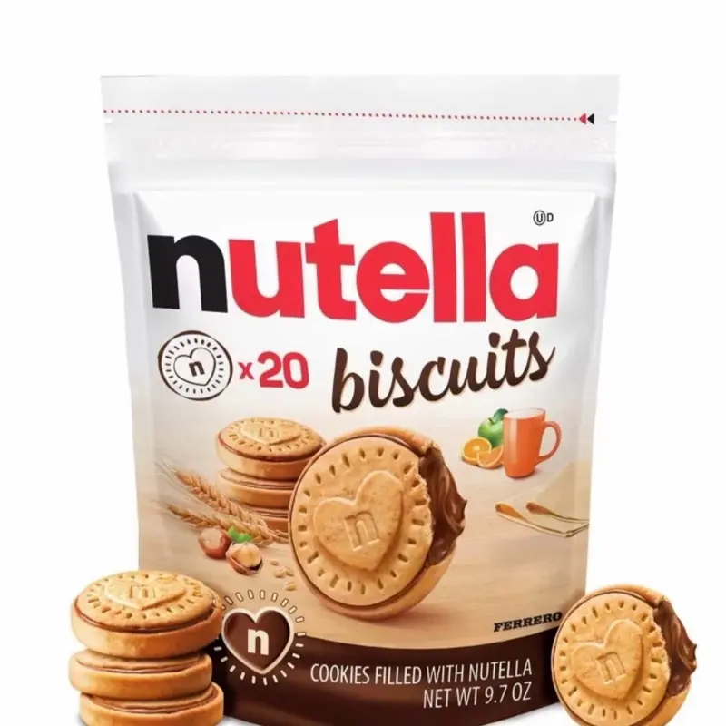 Nutella Biscuits are crispy, golden-baked cookies filled with the signature creamy hazelnut cocoa spread from Nutella. Each biscuit features a crunchy outer shell made from wheat flour and cane sugar, with a soft, rich Nutella center that delivers a smooth and indulgent chocolate-hazelnut flavor in every bite.