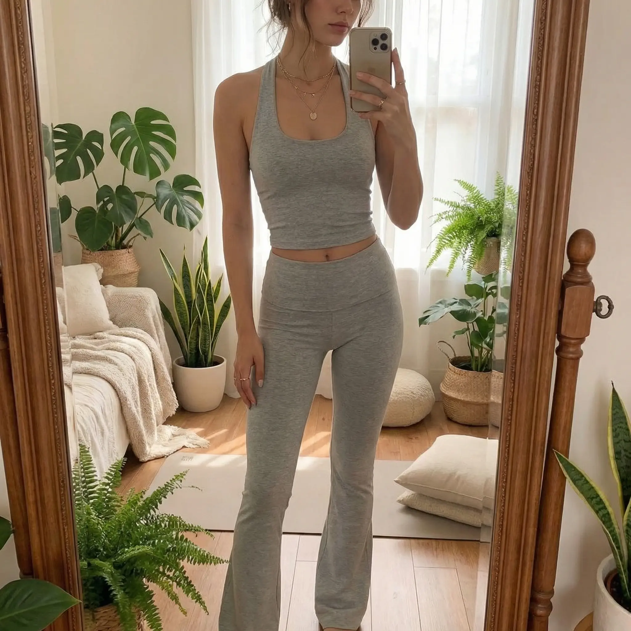 Soft, flattering, and easy to wear, this matching two-piece set is made for that effortless off-duty look you can wear on repeat. Featuring a halter crop top and matching flare pants, it gives you a sleek, body-hugging fit on top with a long, leg-lengthening silhouette on the bottom. The soft stretchy fabric feels comfortable against the skin while still keeping the look clean, fitted, and elevated. Perfect for casual everyday outfits, airport looks, coffee runs, travel days, weekend wear, lounging, and easy going-out styling.