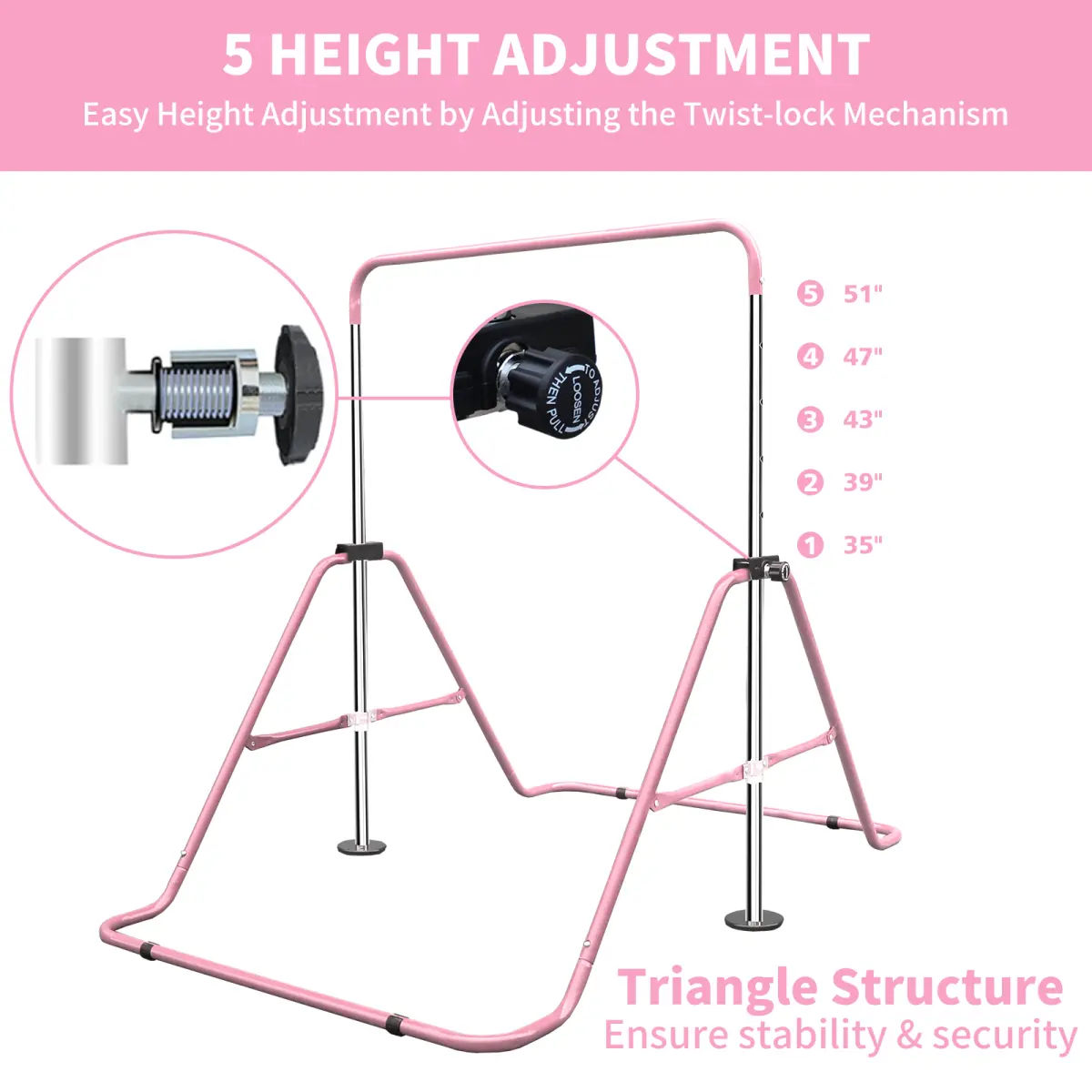 Pink Kids Adjustable Gymnastics Bar, 35–51 Inch 5-Level Height, Heavy-Duty Iron Folding Horizontal Bar, 140LBS Capacity, Stable Junior Training Bar for Indoor Home Gymnastics 3–9 Years Old