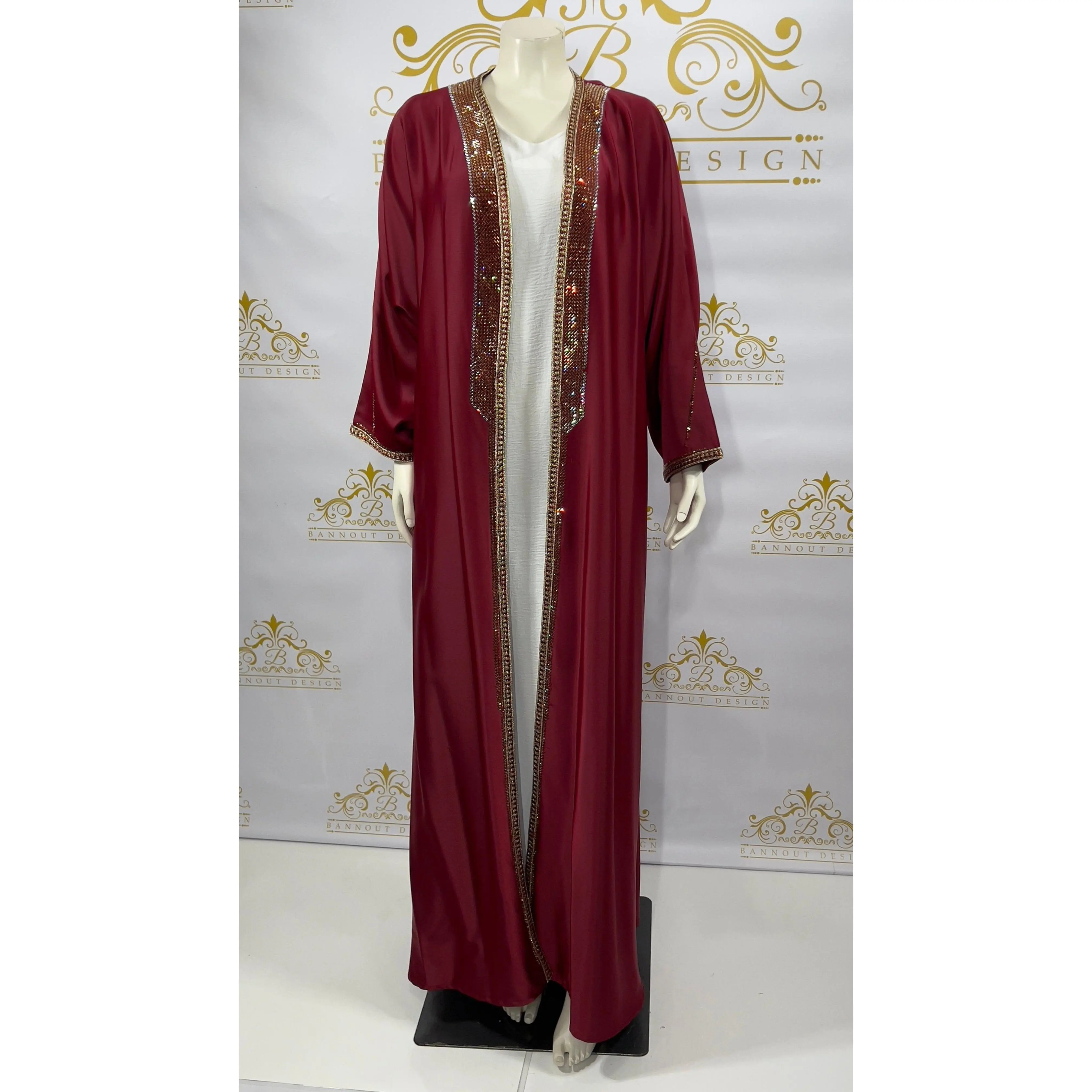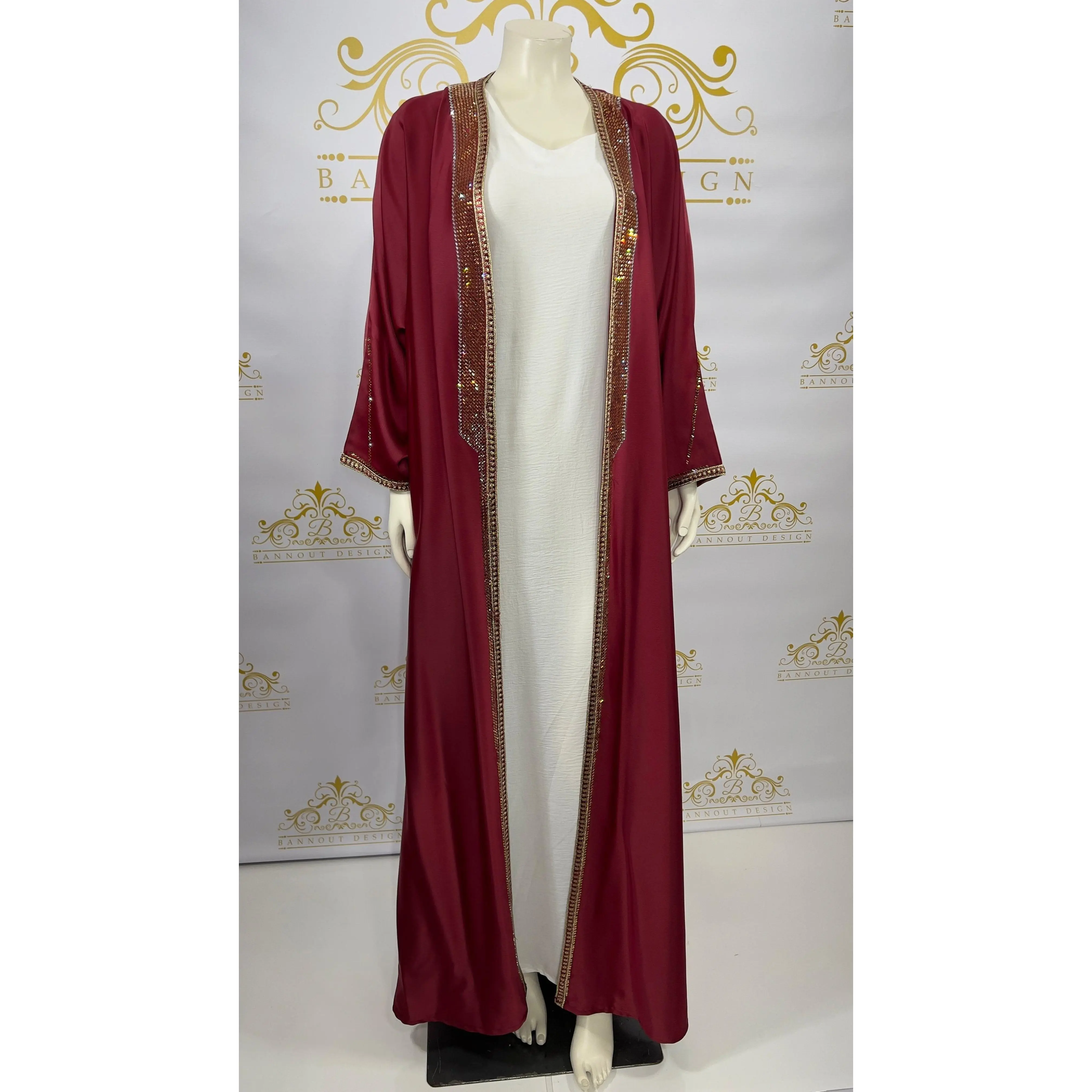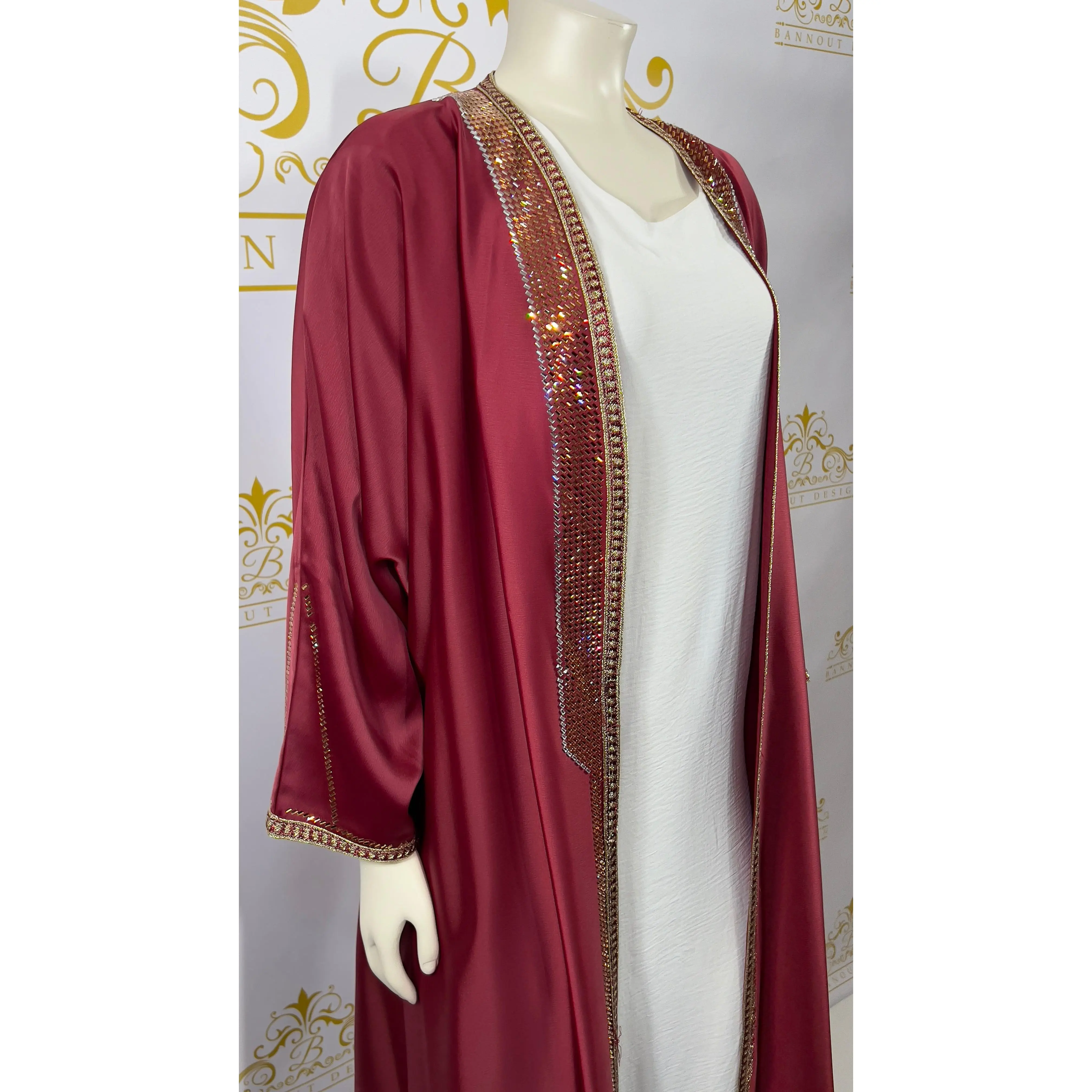 Indulge in luxurious style with our Satin Cardigan Open Abaya 2 Pc. Made with soft satin fabric, this abaya features an elegant open design and luxurious gold rhinestone detailing. Perfect for special occasions or adding a touch of glamour to your everyday look.