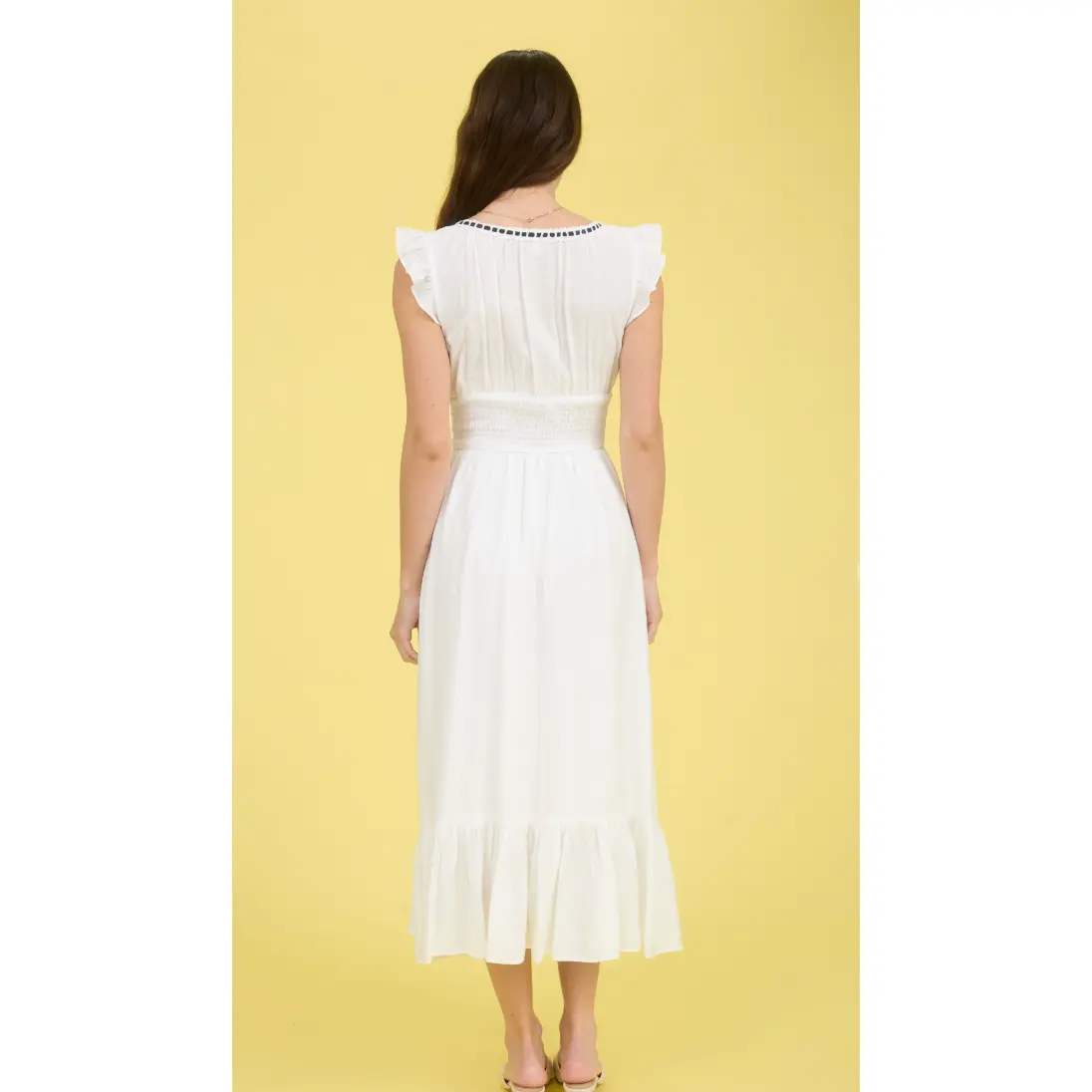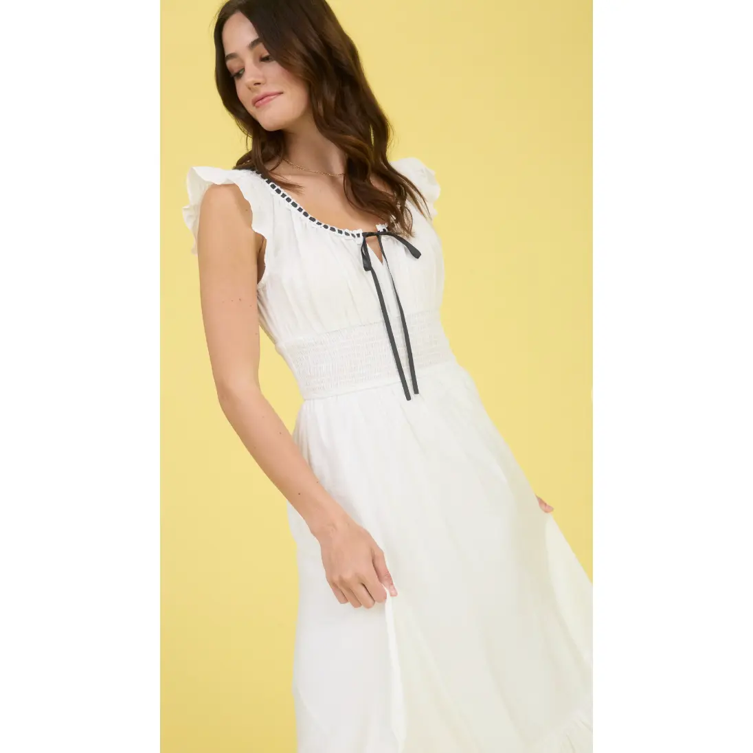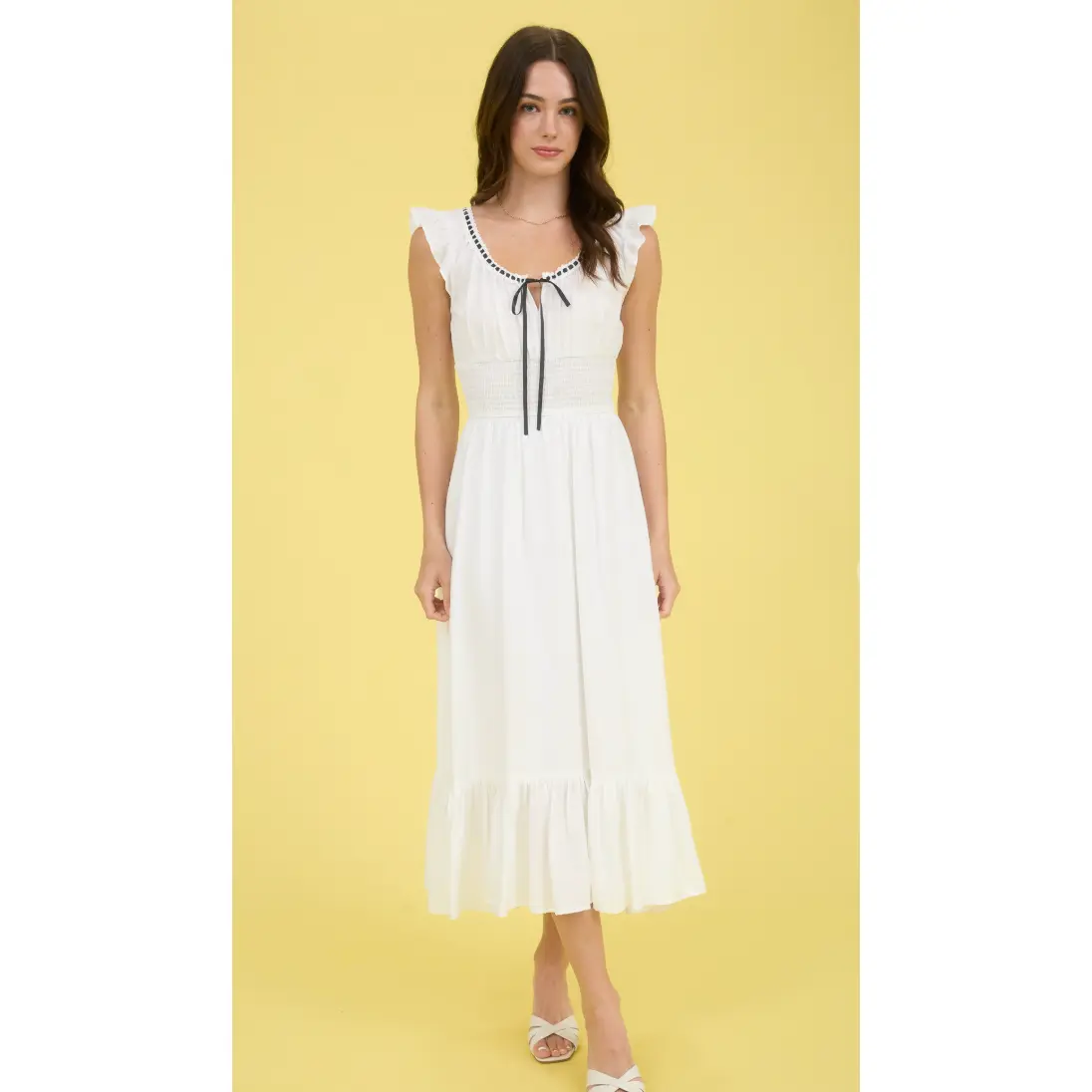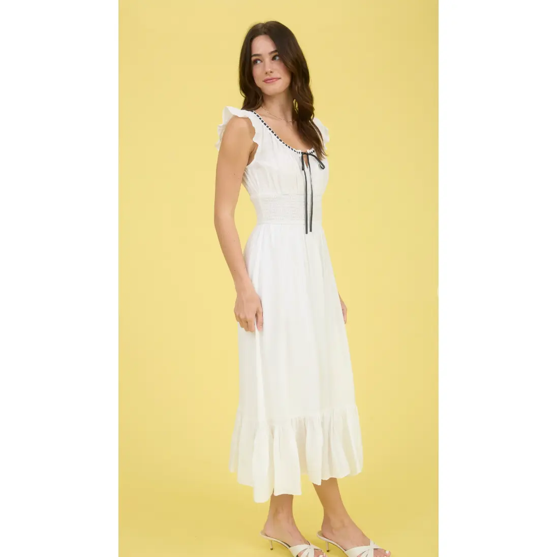 Contrast ribbon ruffle detail tie midi dress