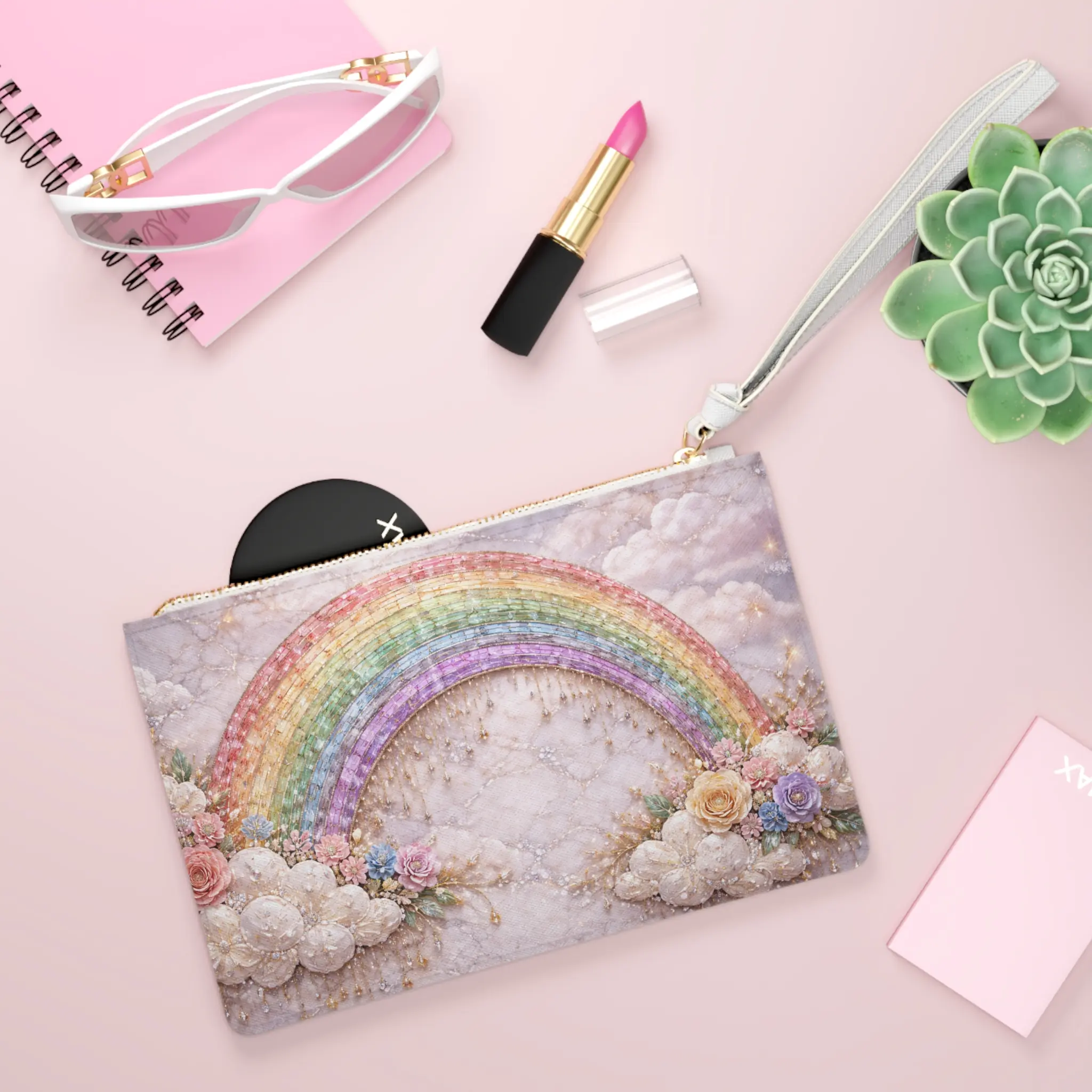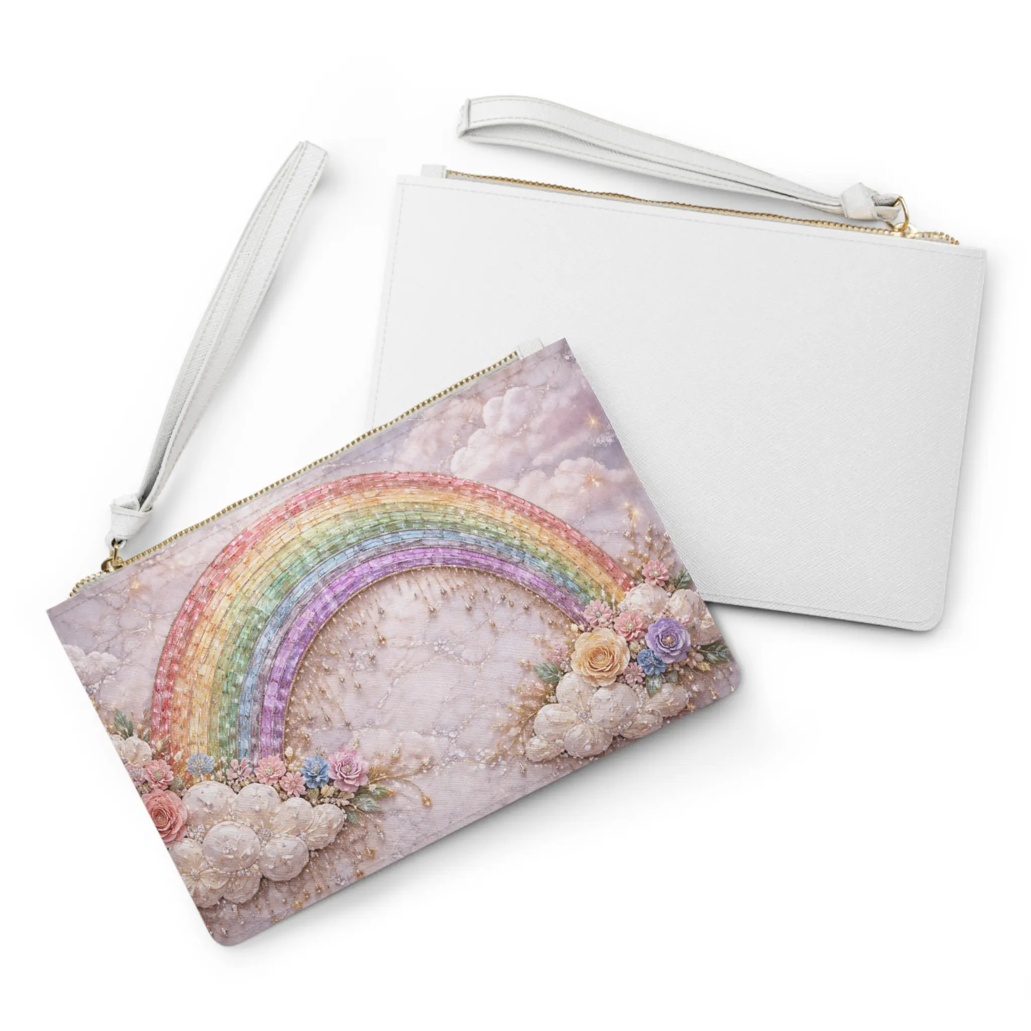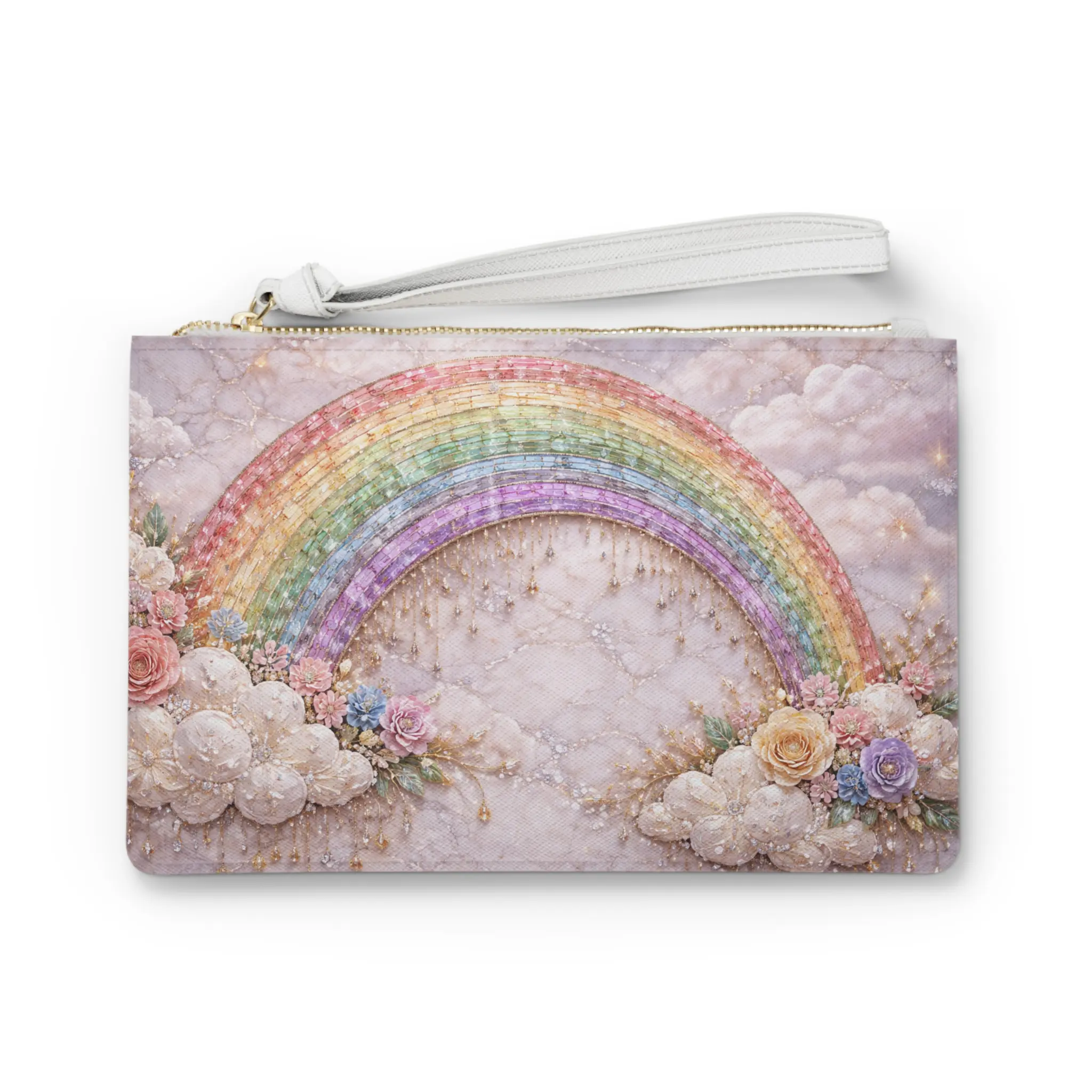 Soft, dreamy, and subtly glamorous — this clutch slides into your hand like a little moment of magic. A pastel rainbow arcs across a backdrop of cloudlike textures and delicate roses, finished with golden specks that catch the light. The saffiano faux-leather gives structure and a refined grain, while the wrist strap keeps it effortless to carry. Inside, two compartments and a small pocket keep essentials organized without fuss. Wear it when you want your outfit to feel whimsical yet polished — for garden parties, intimate brunches, or evenings when you want a gentle, luminous touch.