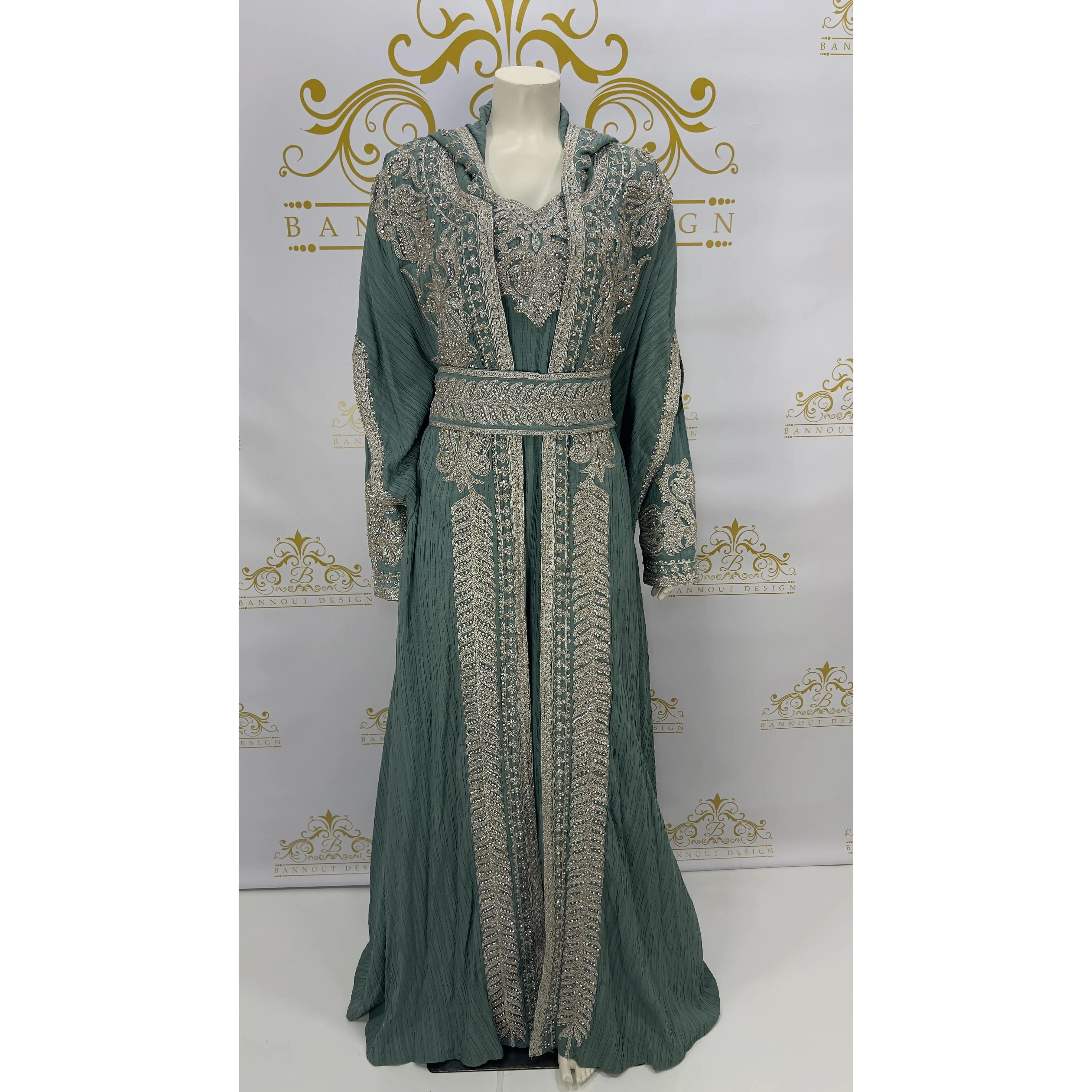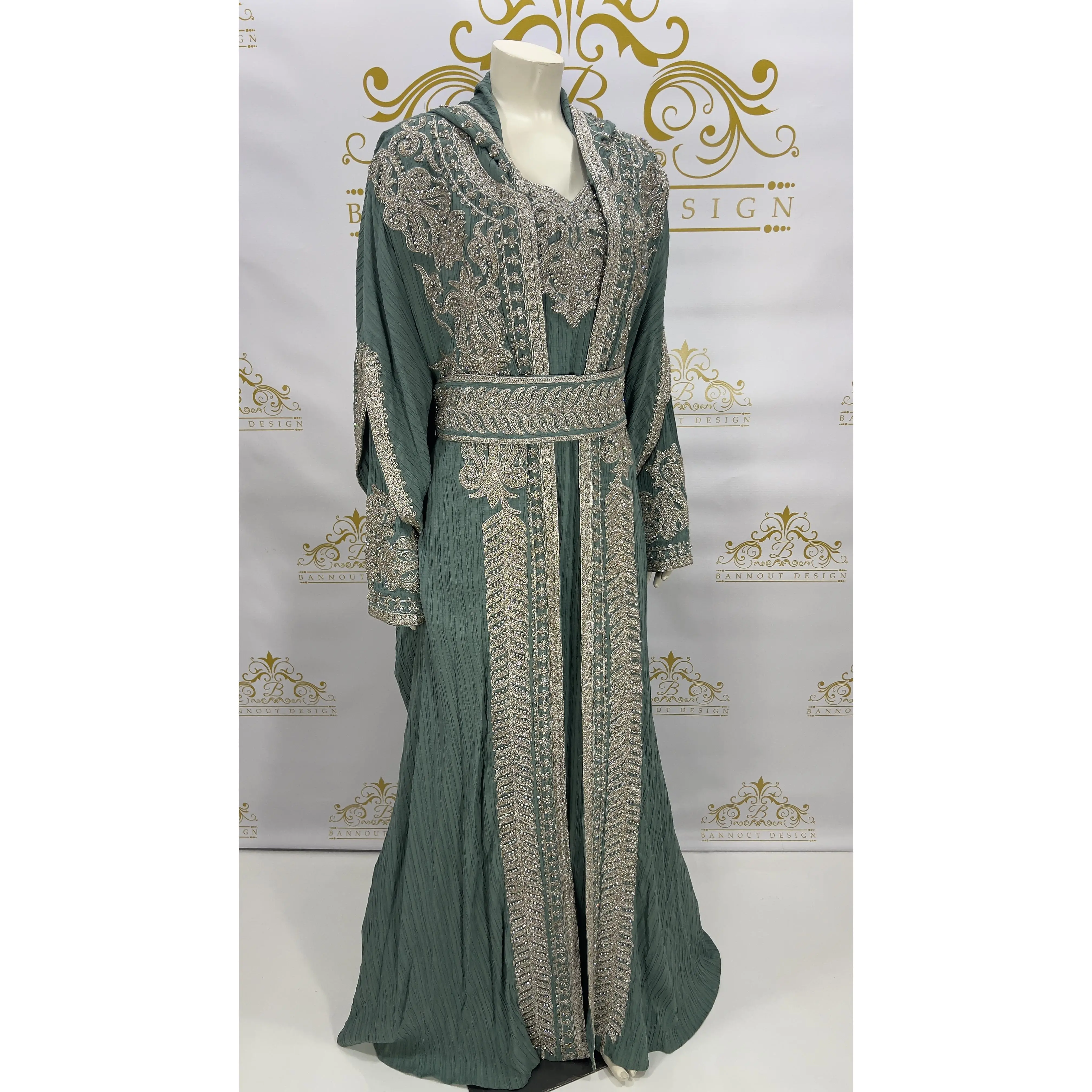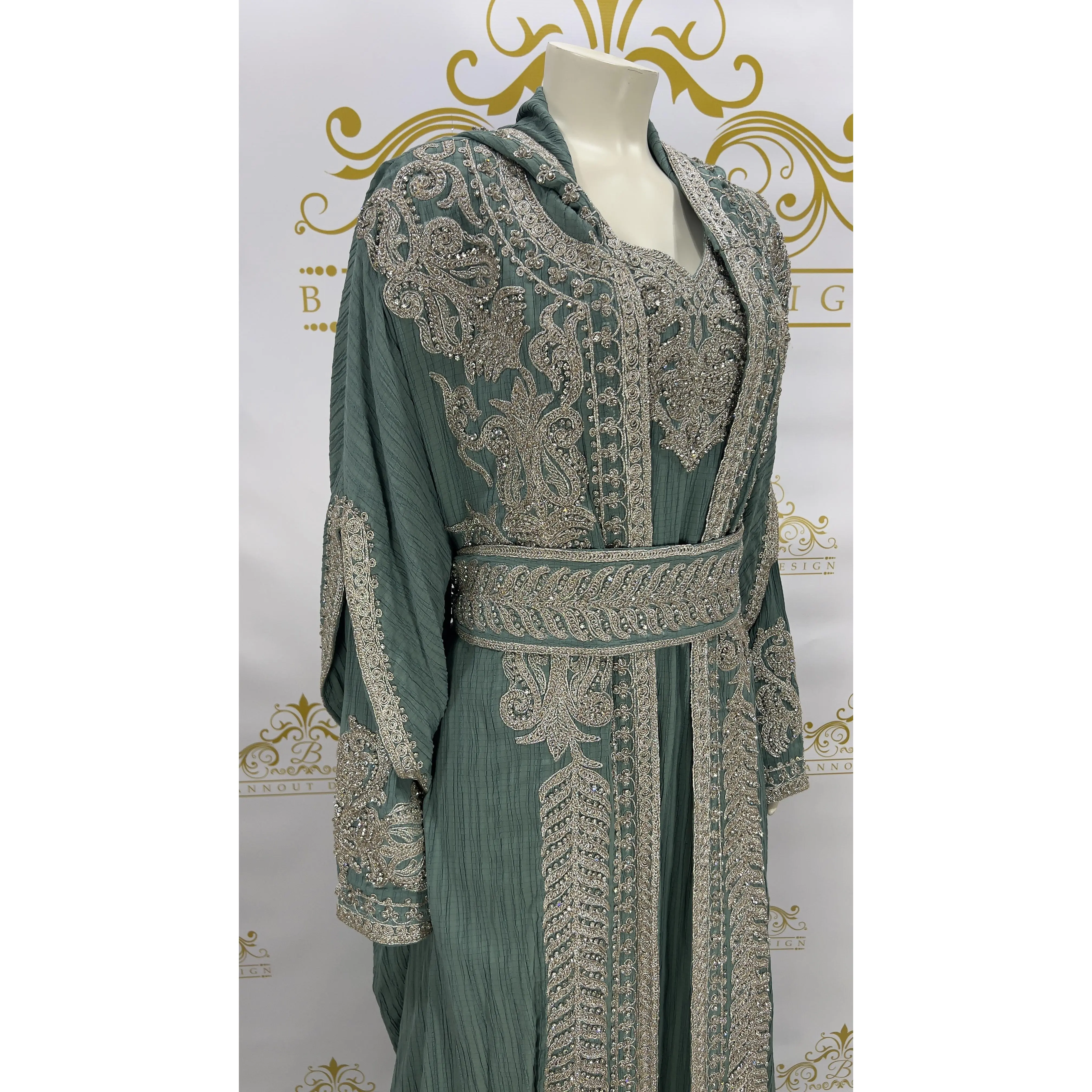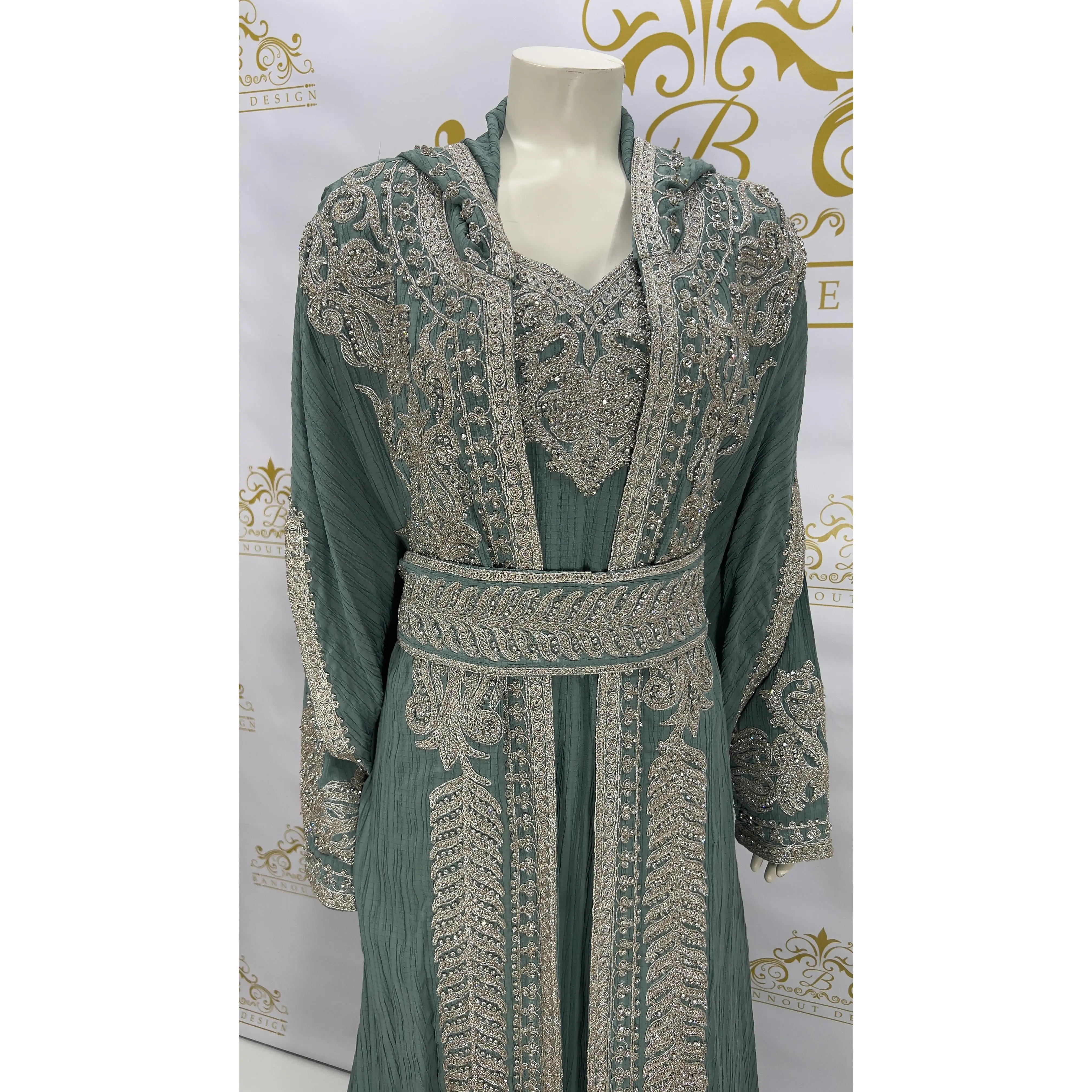 Hooded Butterfly Kaftan Abaya Set 3 Pcs Long Dress Silver Beads & Embroidery