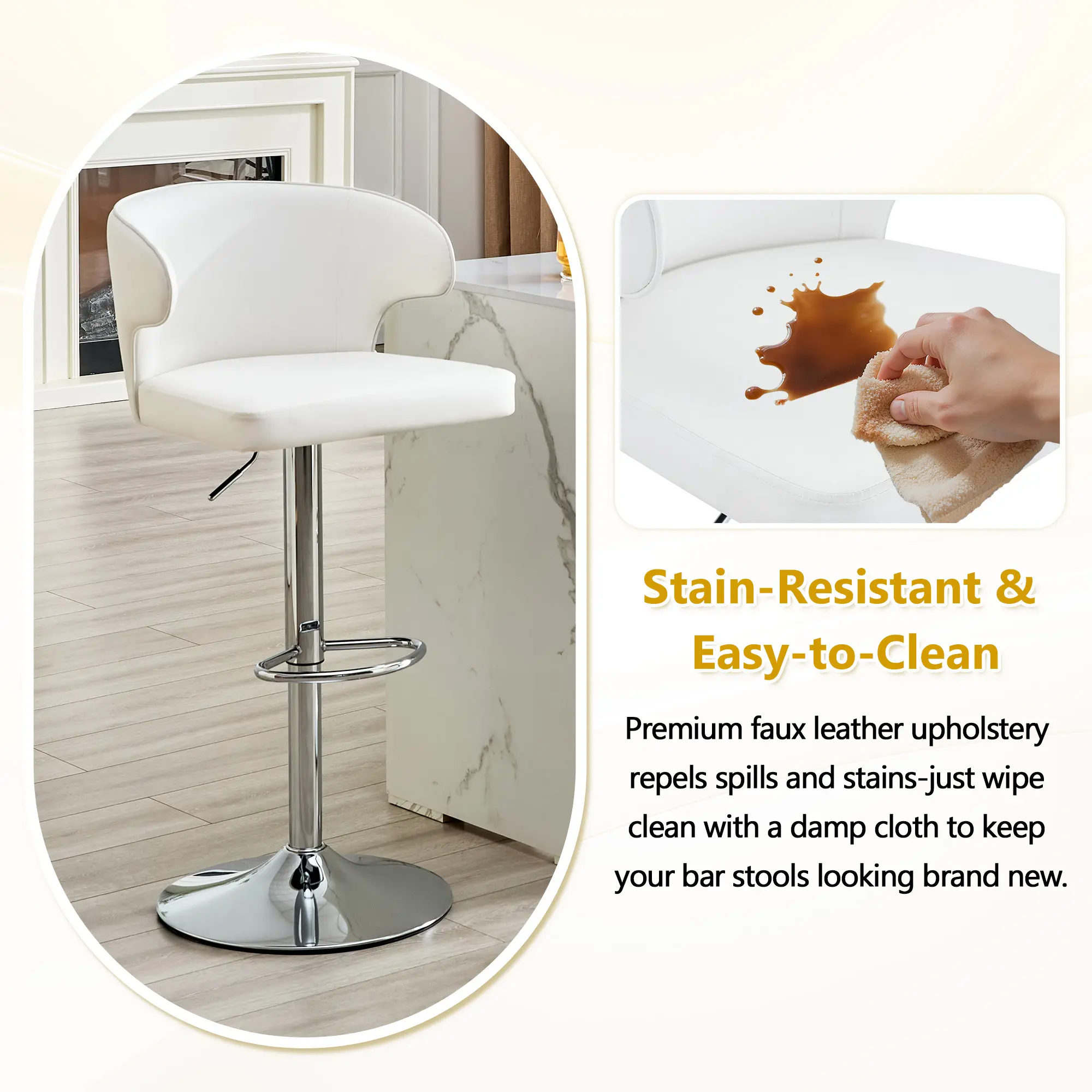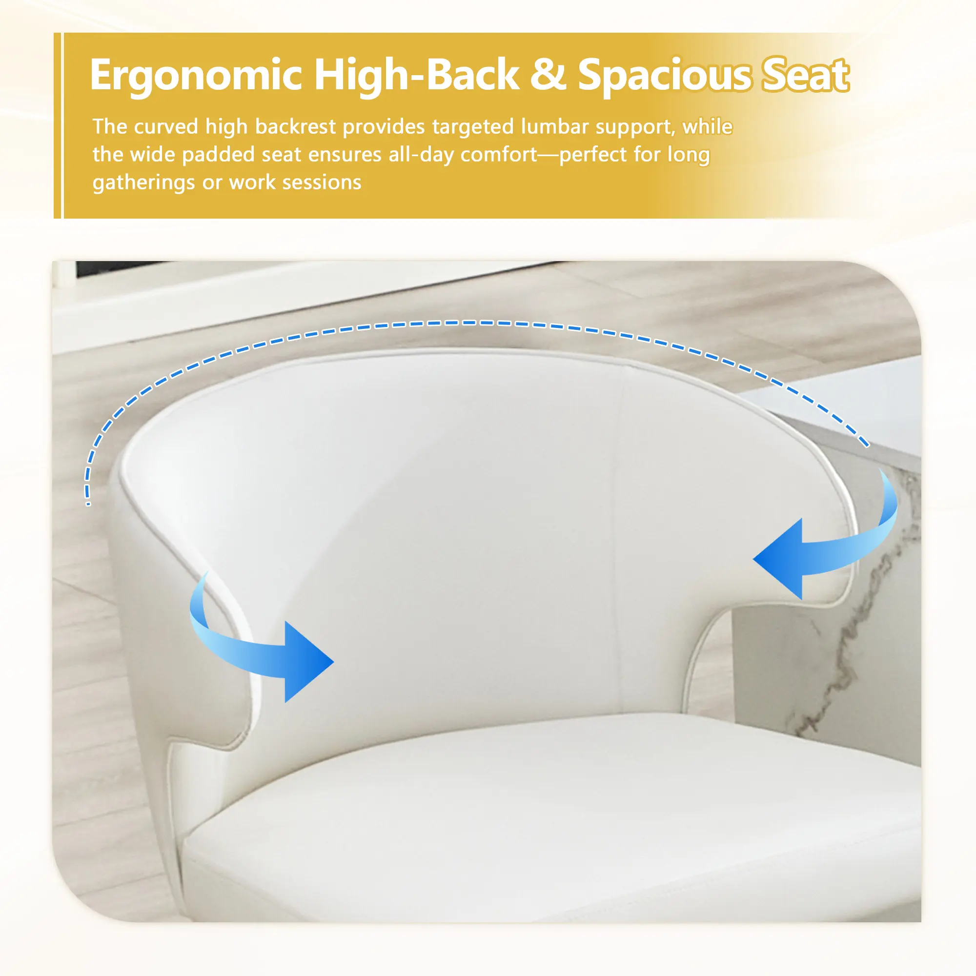 ·Spacious Seat Ergonomic High-Back Support:Featuring a generously sized padded seat and a stylishly curved high backrest, this bar stool delivers exceptional lumbar and back support. The elevated back design wraps around your body, reducing fatigue during extended sitting, making it ideal for long hours at your home bar or workspace.