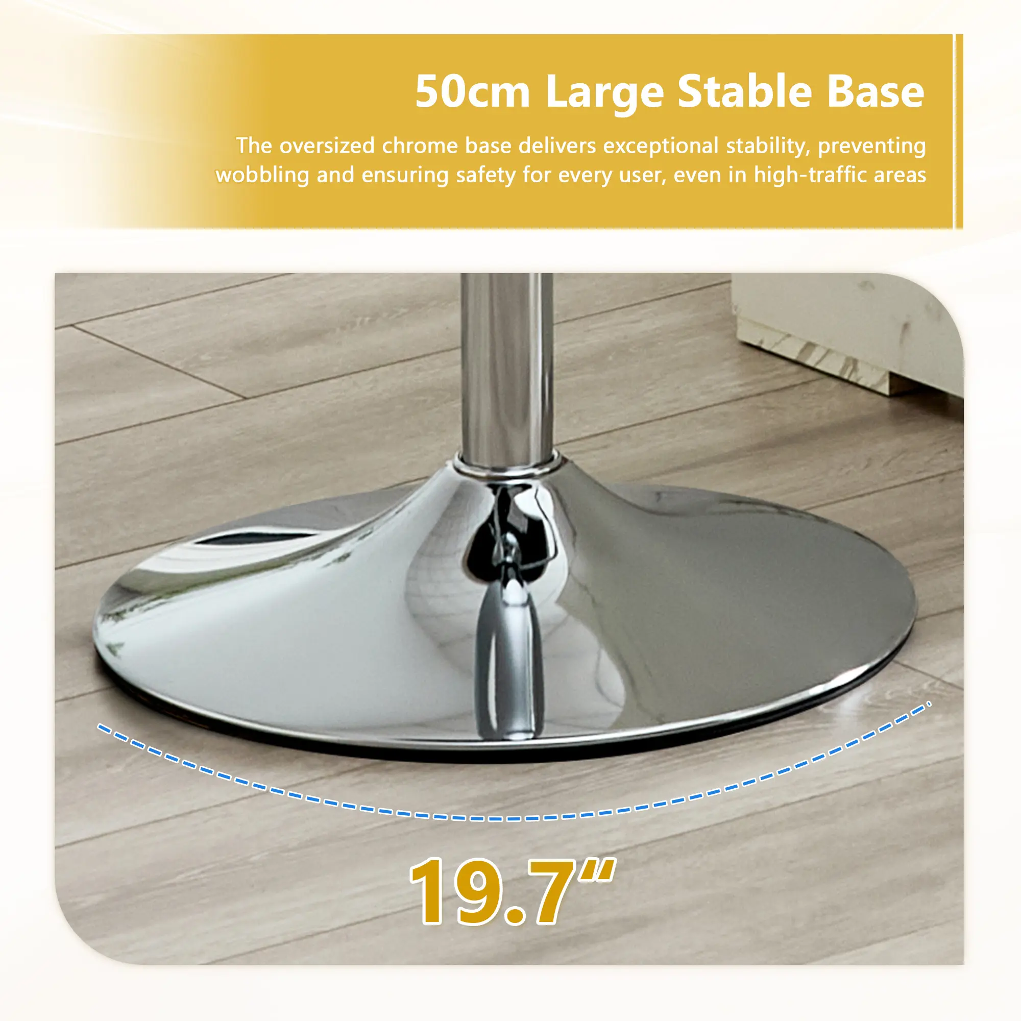 ·Sturdy 17.7in Large Base for Enhanced Stability:Built with a 17.7in extra-large chrome-plated round base, this bar stool offers superior stability and balance, preventing tipping even on uneven floors. The weighted base ensures it stays firmly in place, providing a safe and secure seating experience for adults and kids alike.