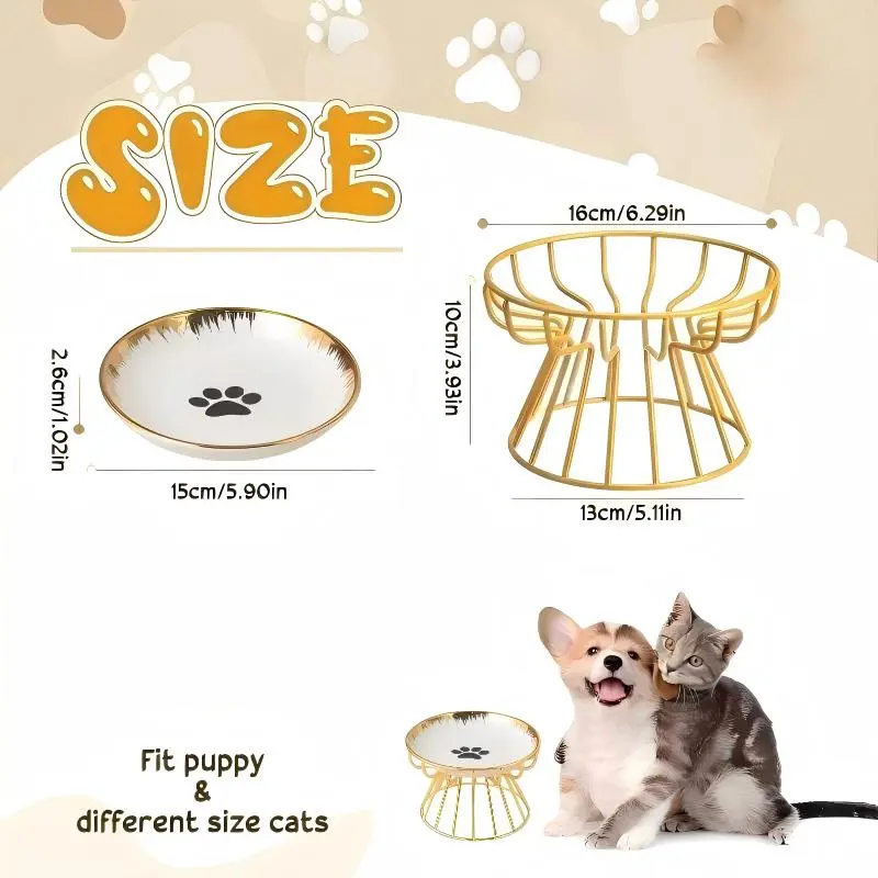 Elevated Cat Bowl with Iron Stand – Ceramic Water & Food Feeding Station for Cats and Small Dogs (Silver/Gold)