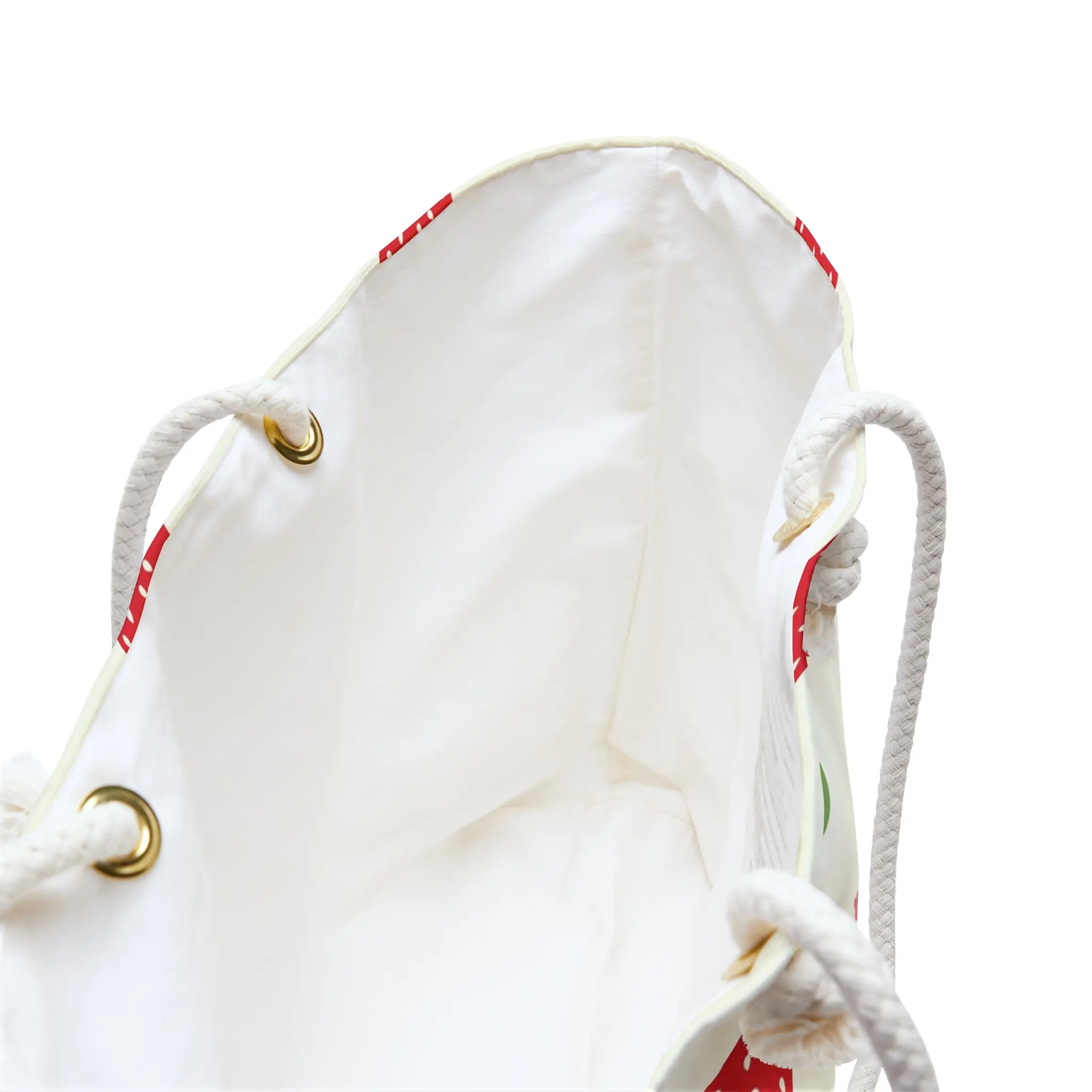 - Long 27" cream cotton rope handles threaded through gold-colored grommets