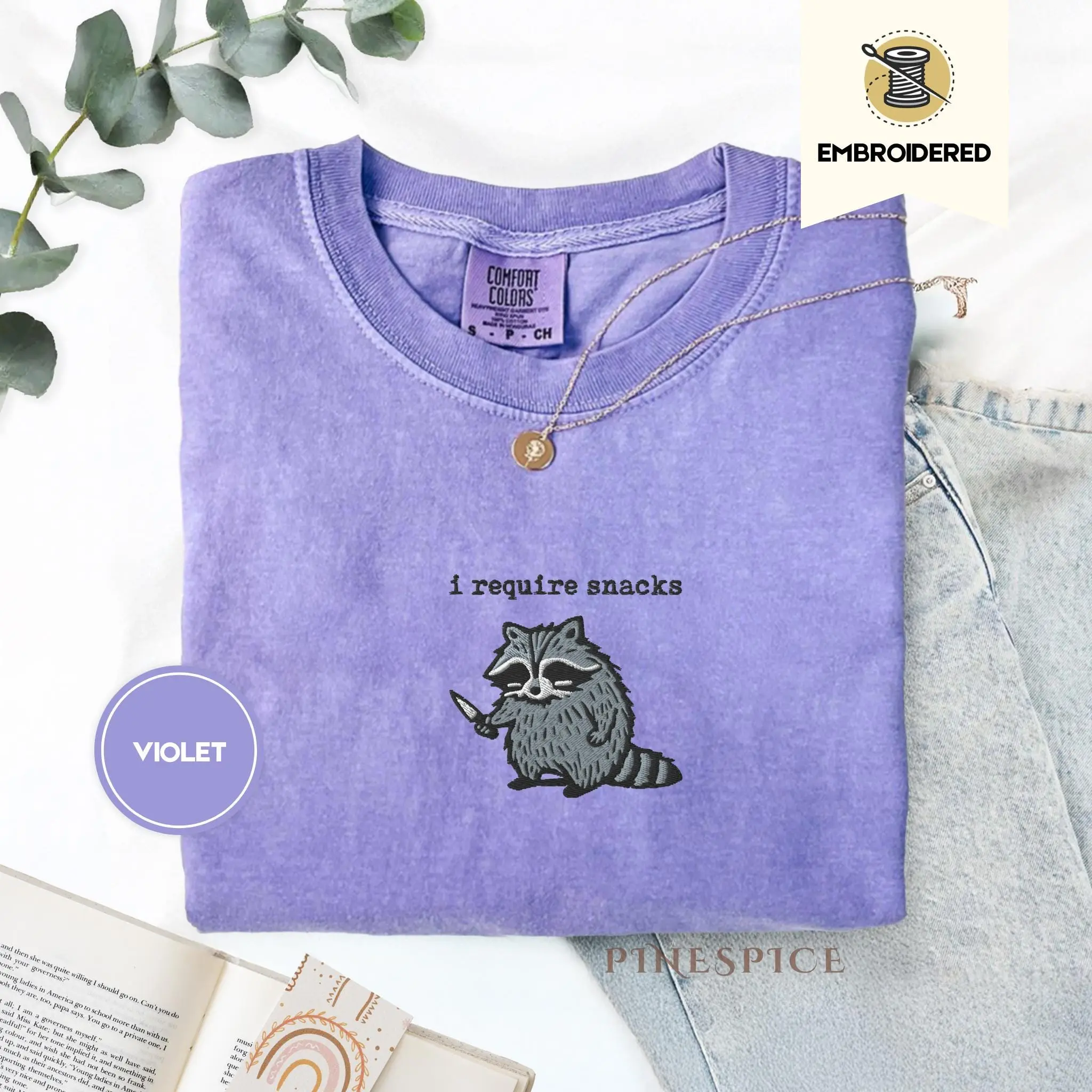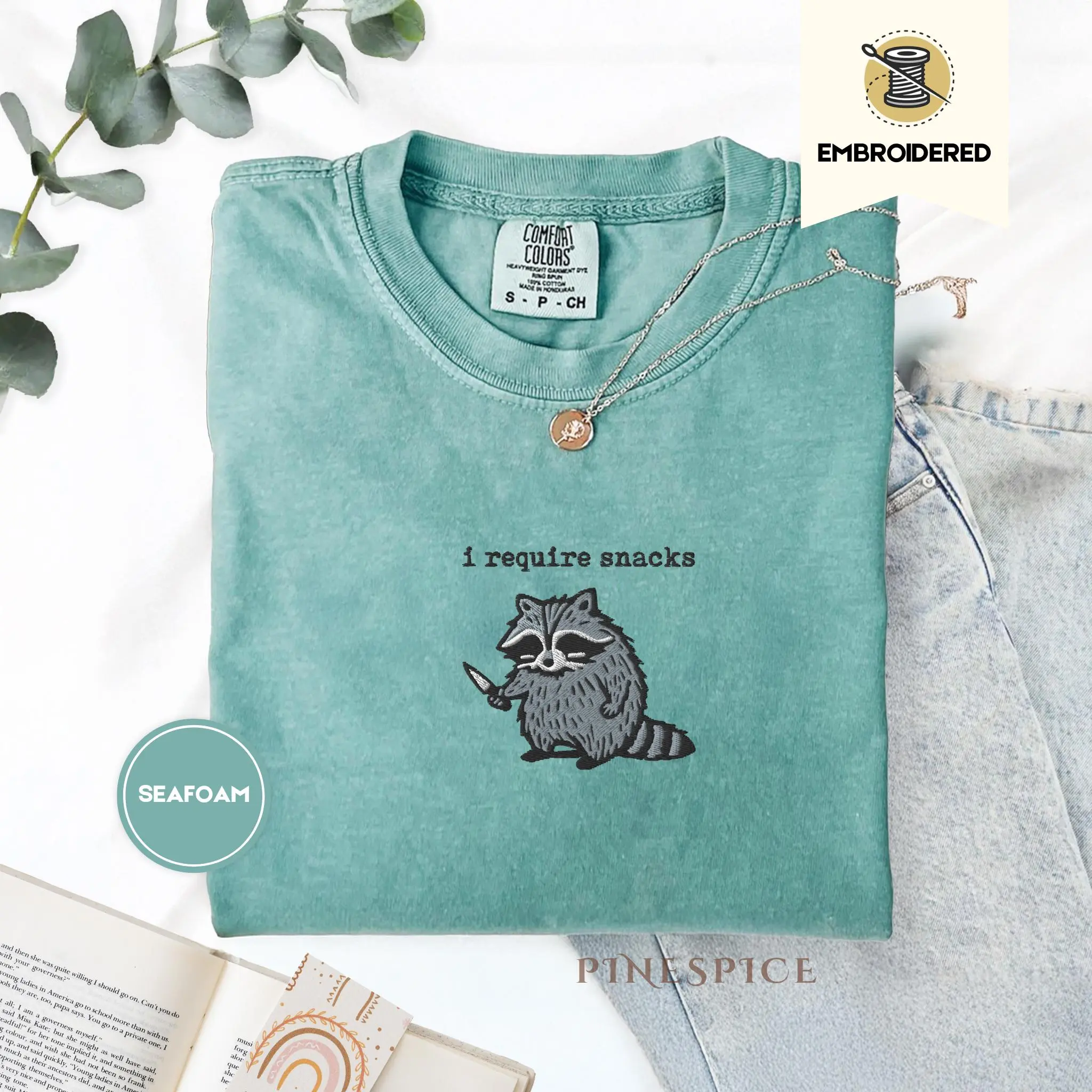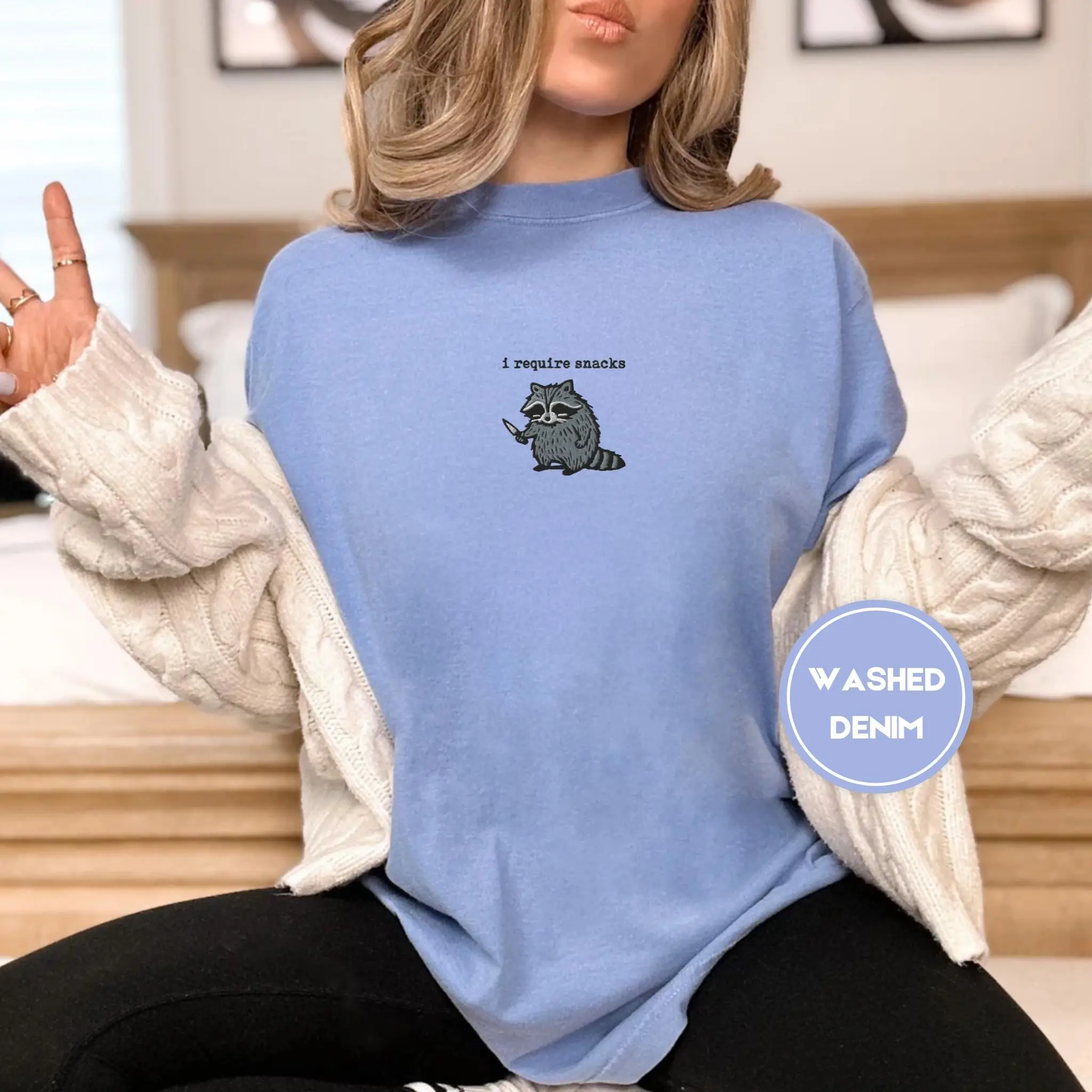 Comfort Colors I Require Snacks Embroidered Raccoon Tee – Funny Shirt, Goblincore Animal Lover Gift, Cozy Snack Gremlin Tee