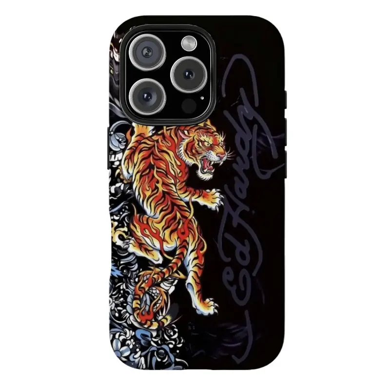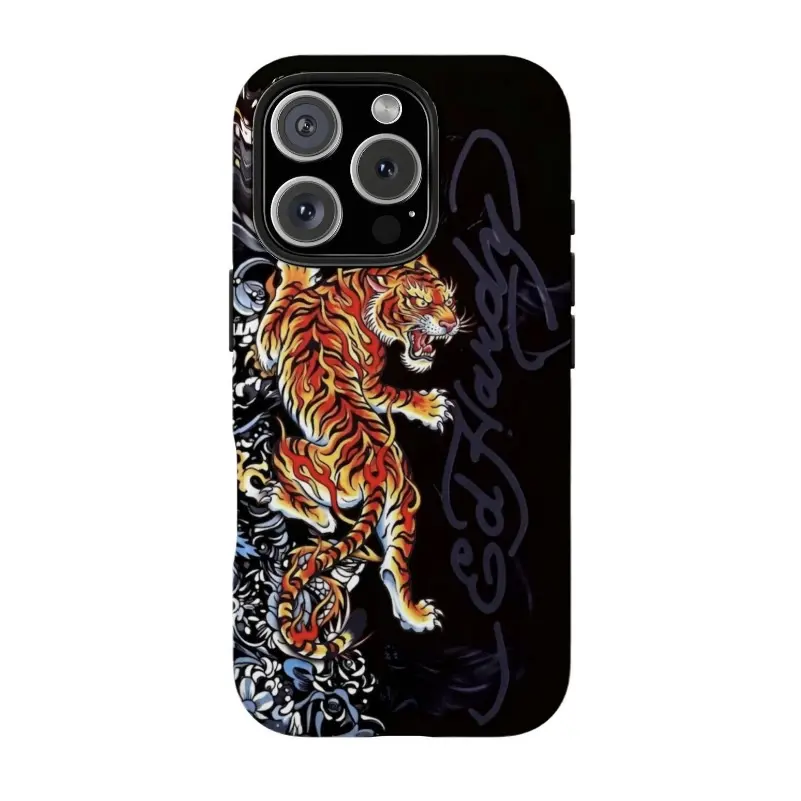 This iPhone case features a vintage skull and leopard tattoo design, perfect for Y2k enthusiasts. It's a trendy tiger collage phone case suitable for iPhone 16/15/14/13/12/11/17 ProMax Plus. Also compatible with Samsung phones. Ideal for both men and women. A perfect gift for fans of unique designs.