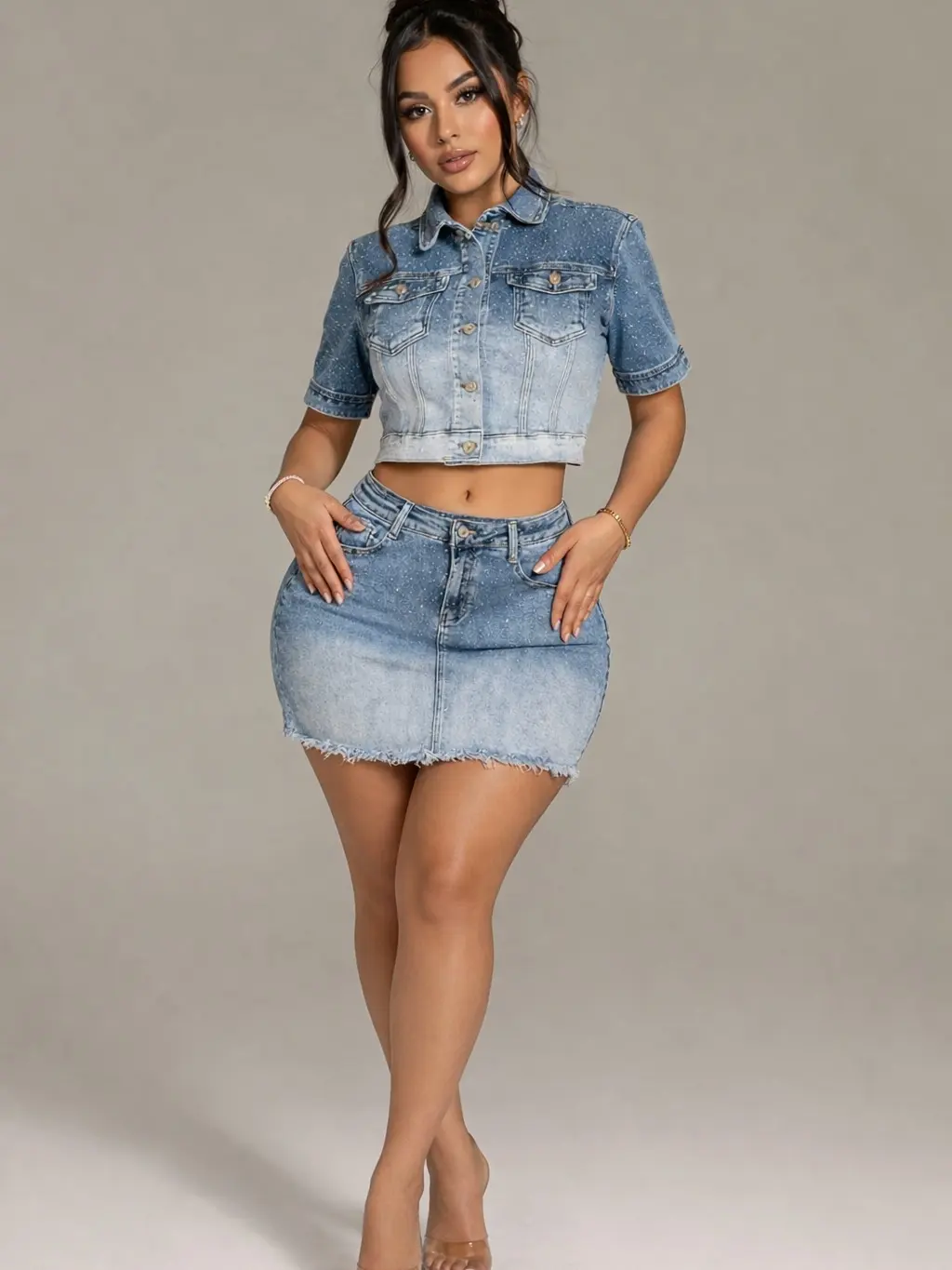 ✨ This jacket features a blended denim mix, perfect for a trendy look. The rhinestone embellishments add a touch of glamour. Ideal for those who want to stand out. The jacket is designed as a standalone piece, focusing on its unique style.