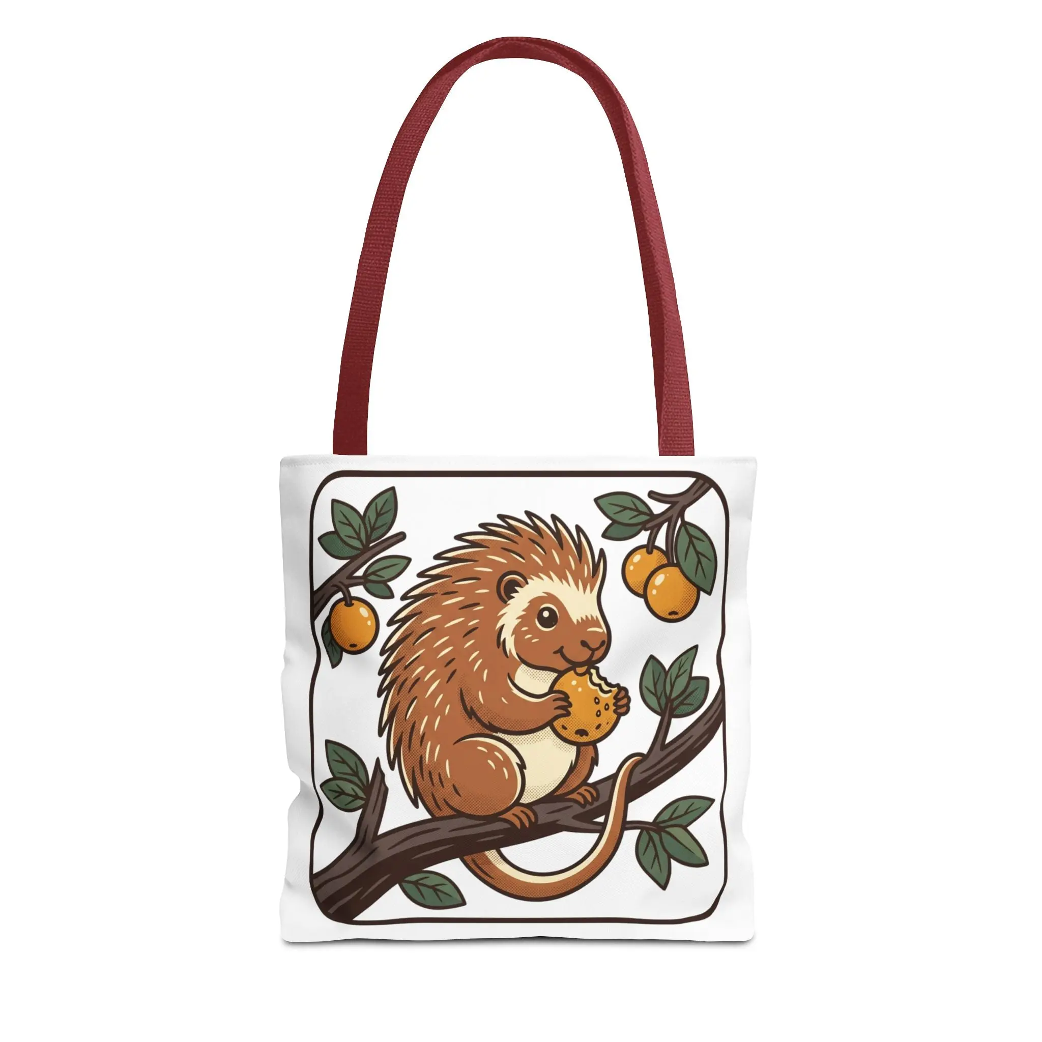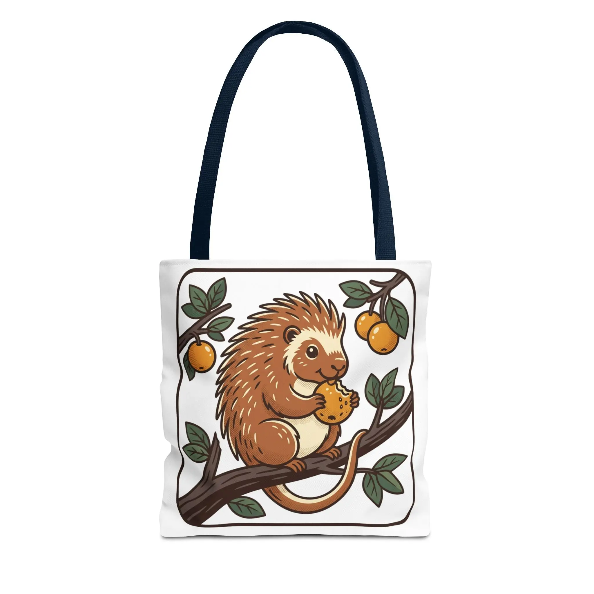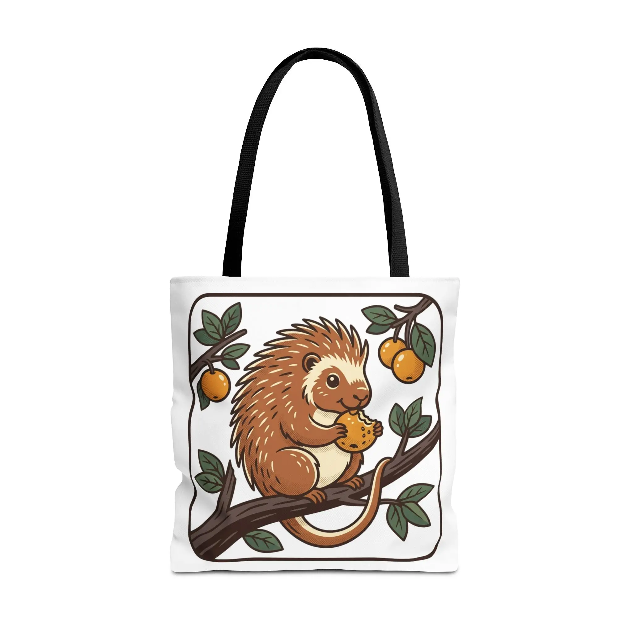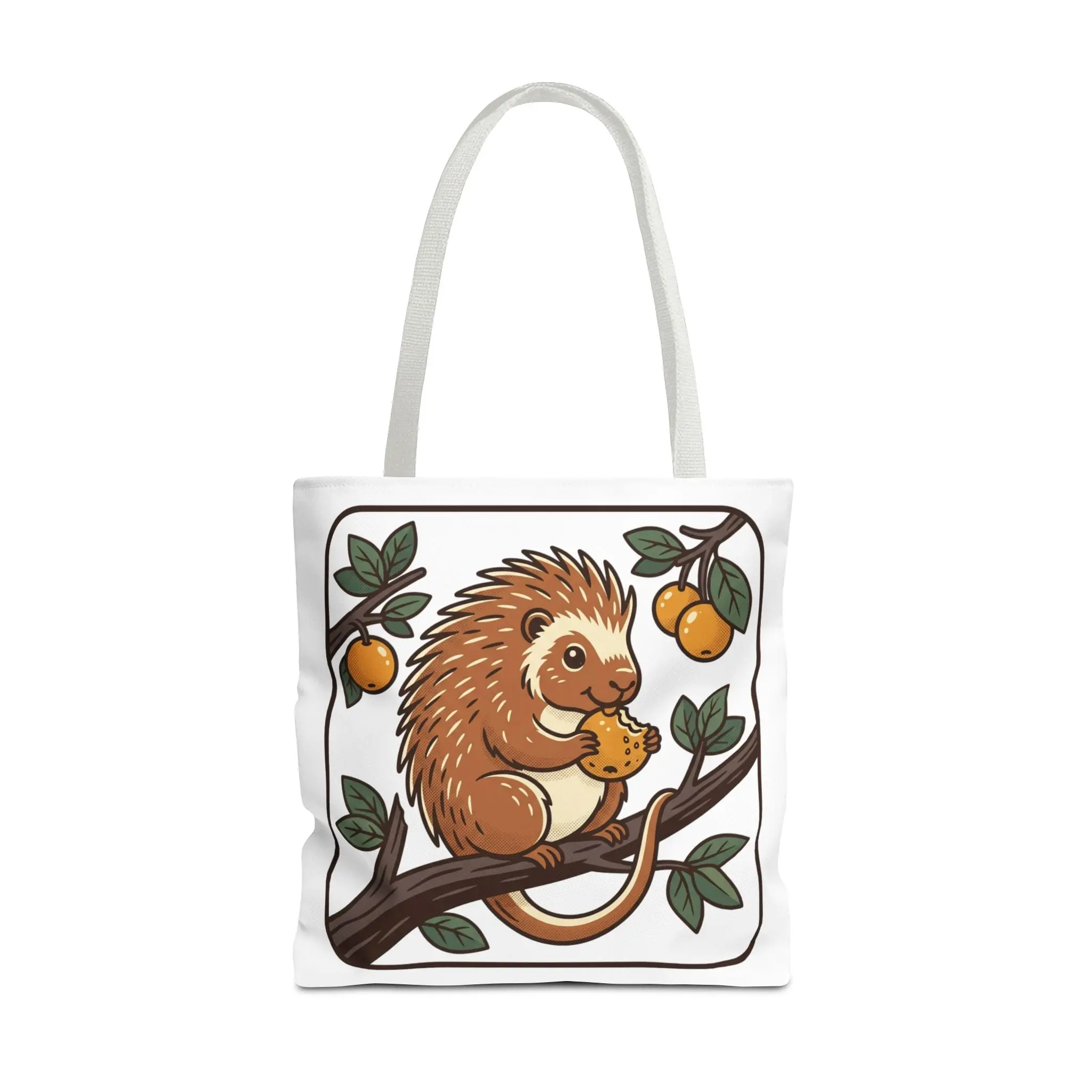 Carry a little story with you — a soft, sturdy tote printed with a whimsical porcupine perched on a branch, nibbling an orange under leafy boughs. The lightweight polyester holds its shape while the boxed corners add real carrying room for groceries, sketchbooks, or market finds. Reinforced handles and neat inner lamination keep this bag feeling dependable, and the illustrated panel brings a gentle, cheerful touch to everyday errands, library visits, or weekend picnics. It’s the kind of tote that sparks a smile when you reach for it and wears in beautifully with daily use.