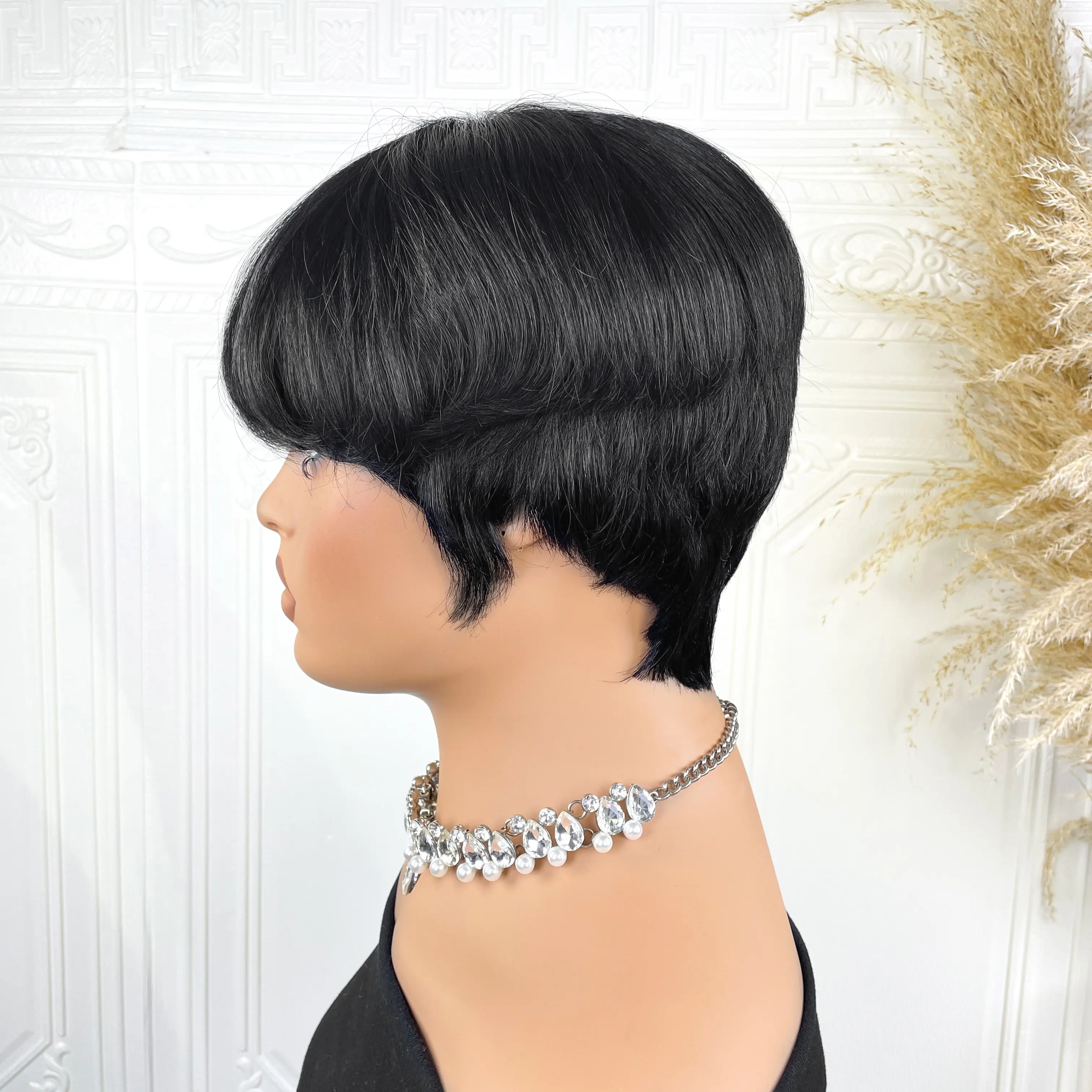 OPQHAIR Natural Black Straight Hair Women' Glueless Short Pixie Wig Human Hair Bob with Bangs Suitable for Summer, Music Festivals, Parties
