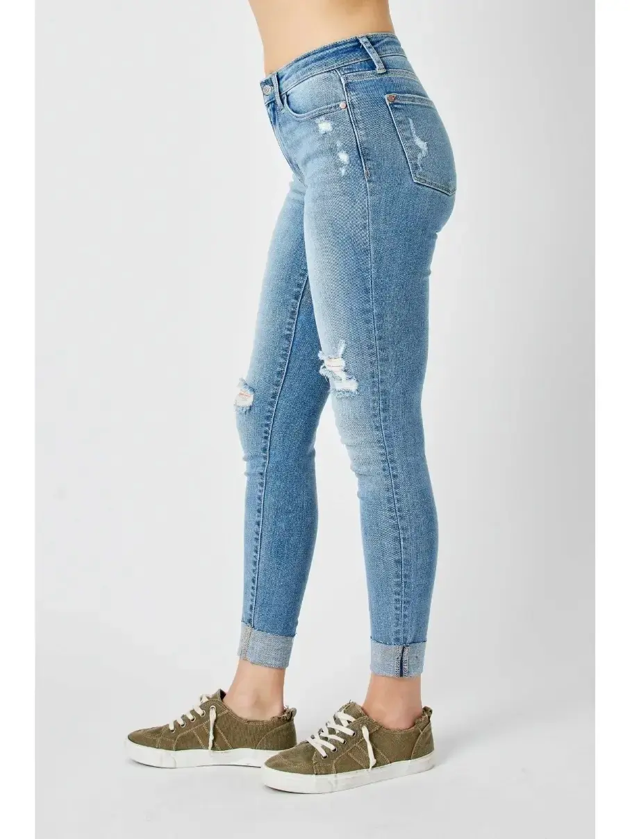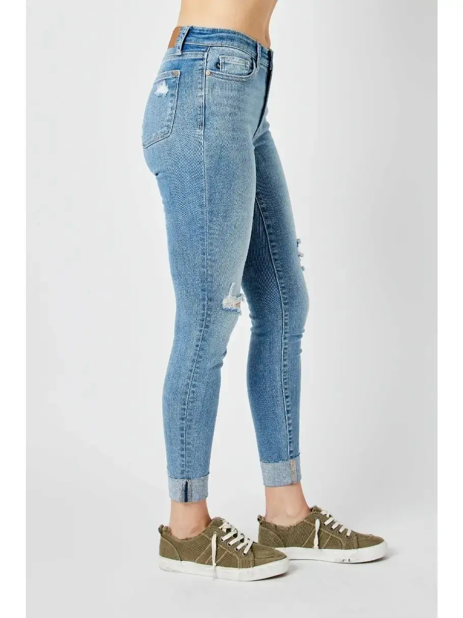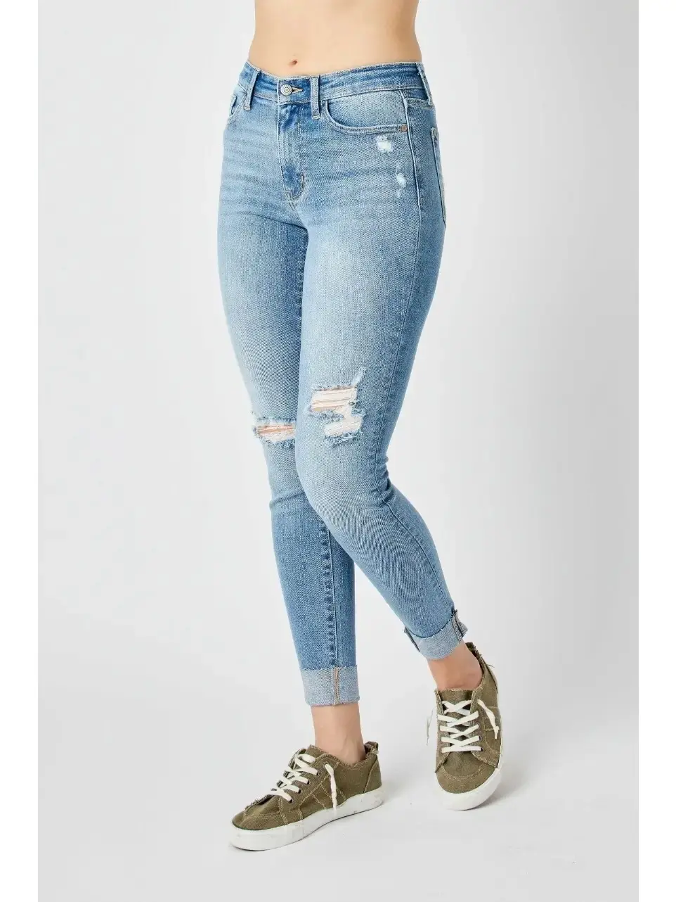 Step out in style with our MR Destroy & Cuff Skinny jeans, a contemporary offering from Judy Blue Jeans. Designed for the everyday woman, these jeans are perfect for casual wear, be it spring or summer. The medium wash and skinny fit offer a trendy look, while the ankle length adds a chic touch. Crafted from a blend of 92% Cotton, 6% Elastrell-Poly, and 2% Spandex, these jeans ensure a comfortable yet regular fit. With their unique destroy and cuff detailing, these jeans add a modern twist to your wardrobe. For care, a simple hand wash will keep them looking their best. FRONT RISE: 9.25" INSEAM: 29"/ 31" (cuffed/ uncuffed) *Due to different screen settings, actual color may vary slightly.
