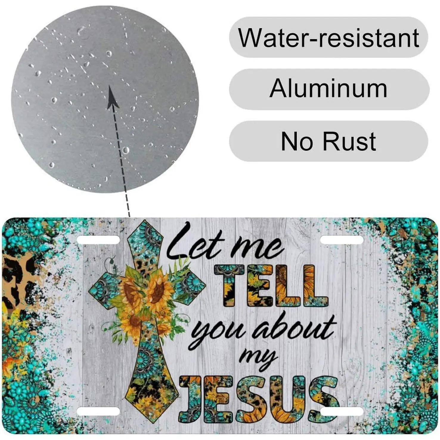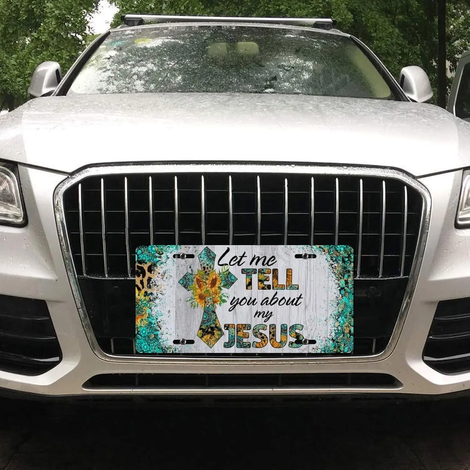 Share your testimony on the road!ThisChristian License Plate for Womenfeatures the inspiring message"Let Me Tell You About My Jesus"with a beautifulfloral crossdesign inturquoiseandrustic western style.Perfect for truck, SUV, or car owners who love Jesus and country charm.