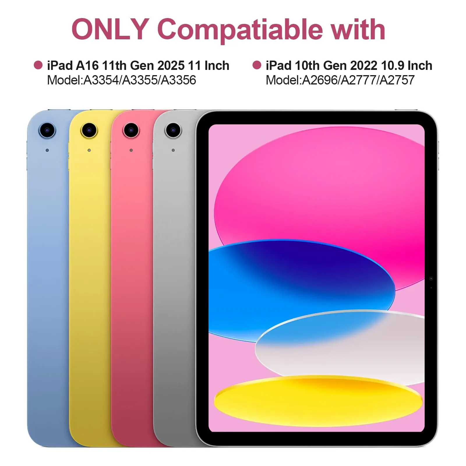 This keyboard case is compatible with iPad 11th Generation 11” 2025 (Model: A3354/A3355/A3356) and iPad 10th Generation 10.9” 2022 (Model: A2757/A2777/A2696). Not suitable for iPad Air 5/4th Generation. Check your iPad model before purchasing. It transforms your iPad into a laptop with a detachable Bluetooth keyboard. Connect once, and it auto-connects for future use. Enjoy a quiet, smooth typing experience.
