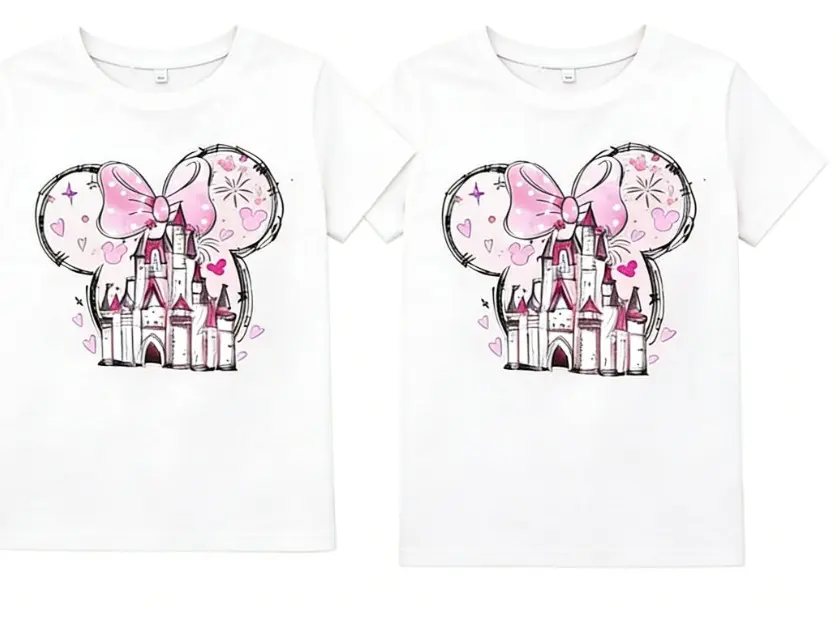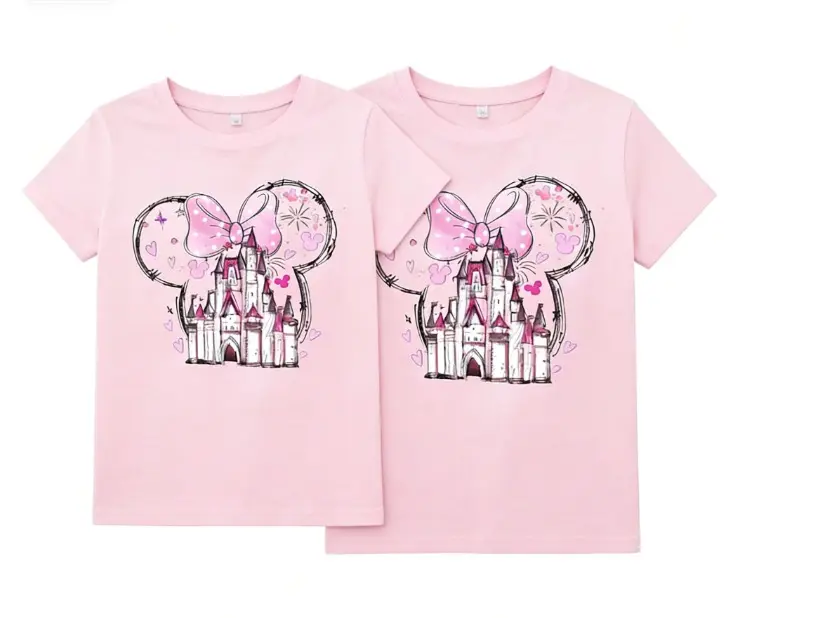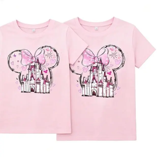 Magic Kingdom Pink Bow Castle Shirt is a themed family-friendly summer patterned T-shirt for vacation and travel. It includes a girl's travel casual top set, featuring a princess castle theme, a fairytale theme set, and a magic theme set.