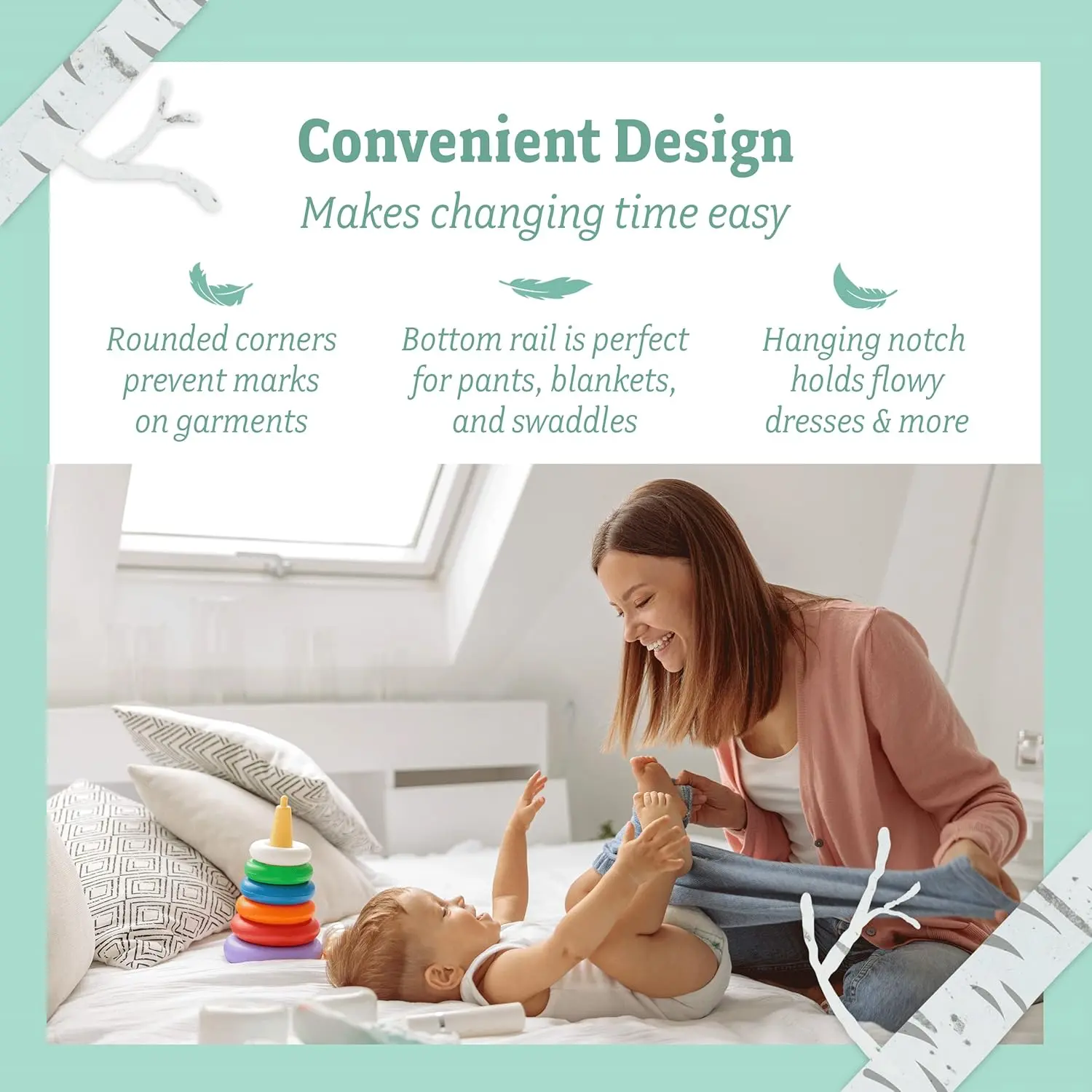 · Convenient Design: Round corners prevent marks on garments, bottom rail is perfect for pants,blankets,and swaddles, hanging notch holds flowy dresses and more.