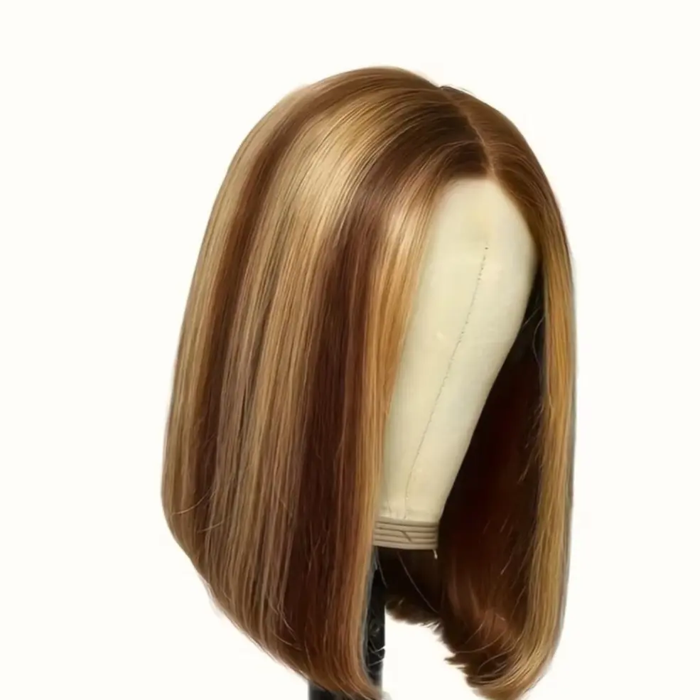 women natural looking mix color, dark brown to blonde. This piece is an ombre Bob wig.