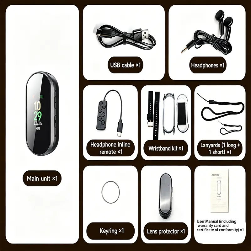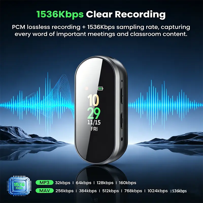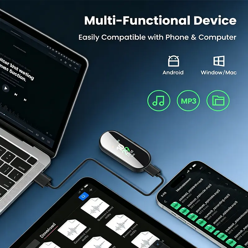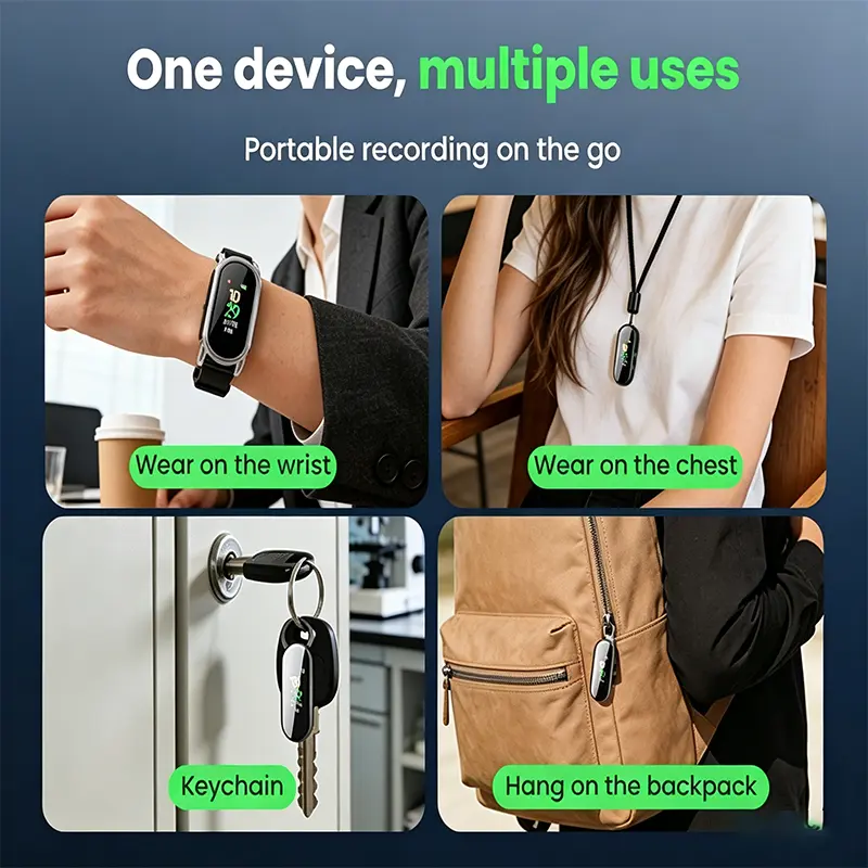 Slim and compact, it supports wristband, lanyard, keychain and magnetic attachment, portable for commutes, study and travels. One-touch operation: press to power on and record instantly, never miss important audio moments. It supports multiple audio formats; plug in headphones for music or language learning, serving dual purposes.