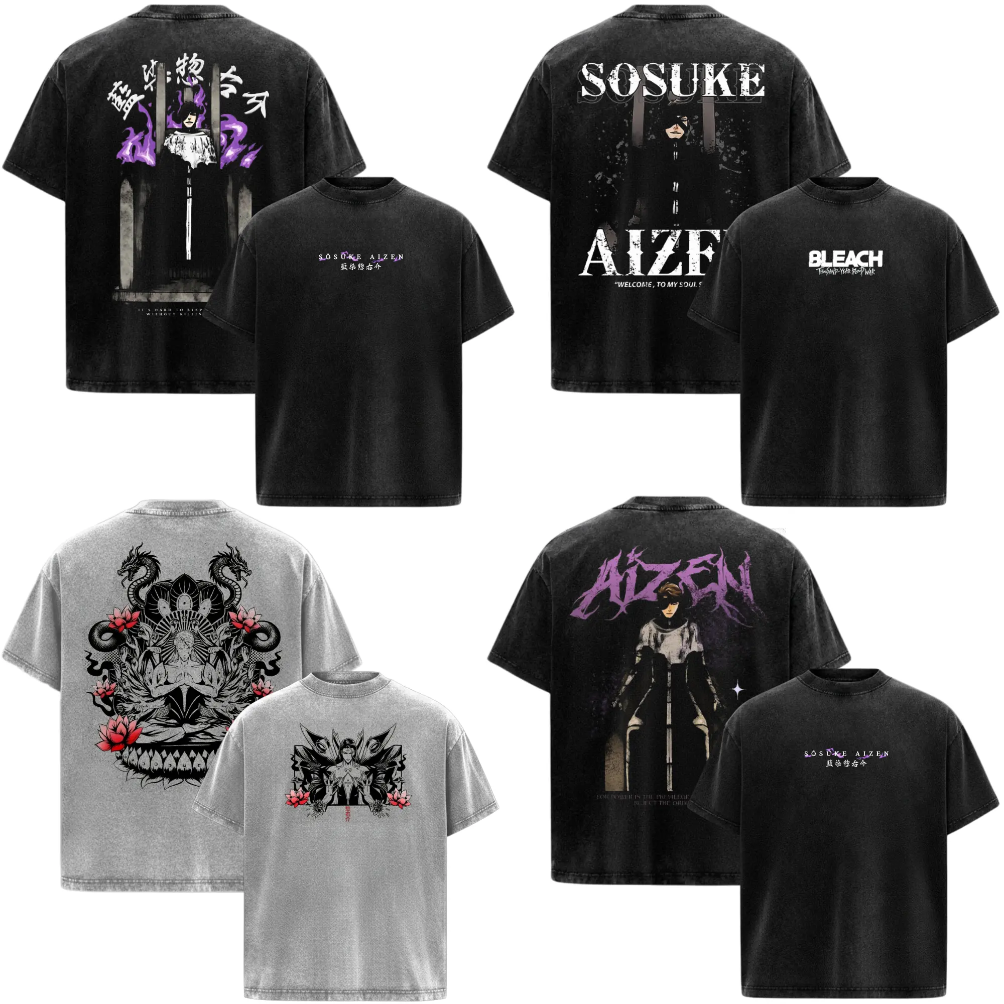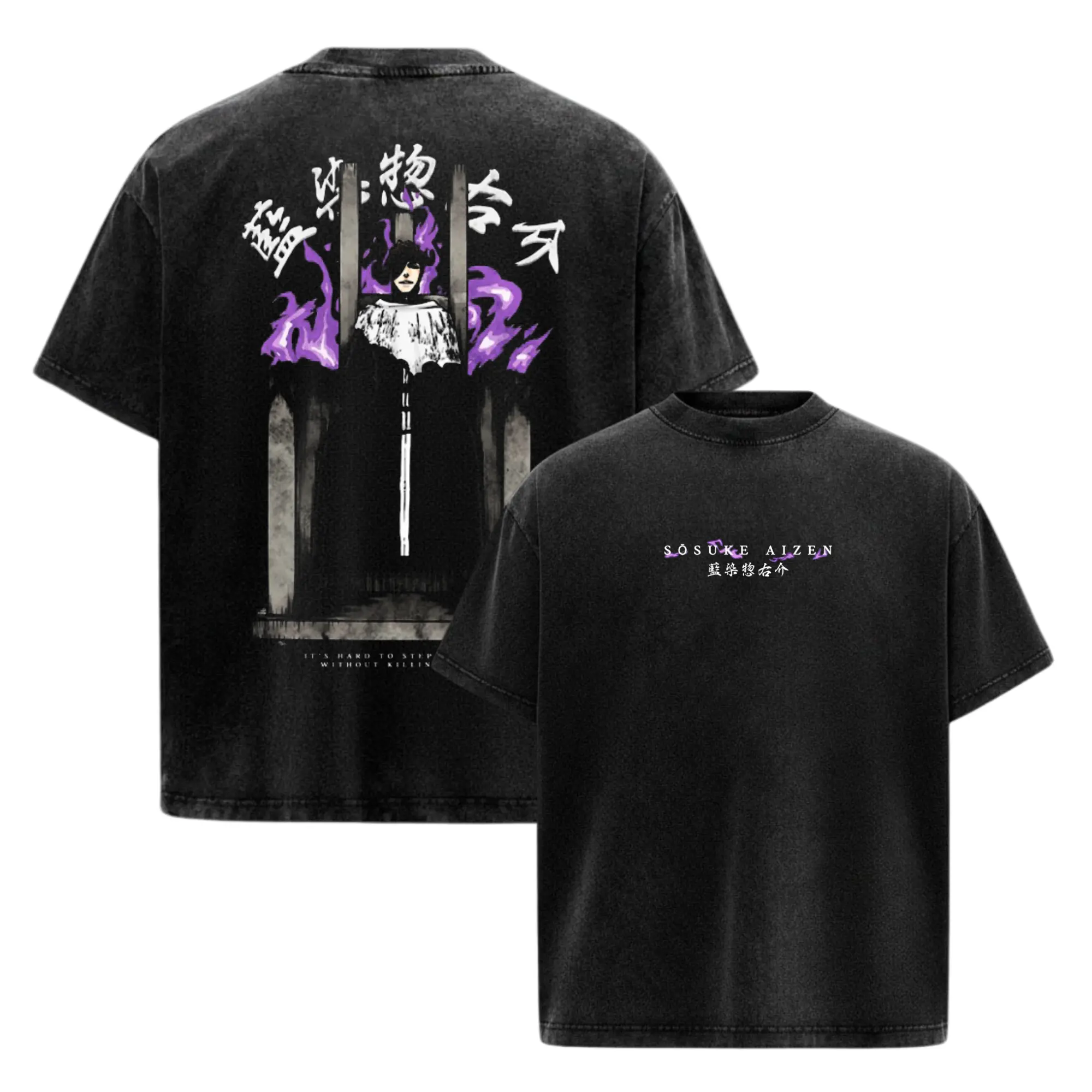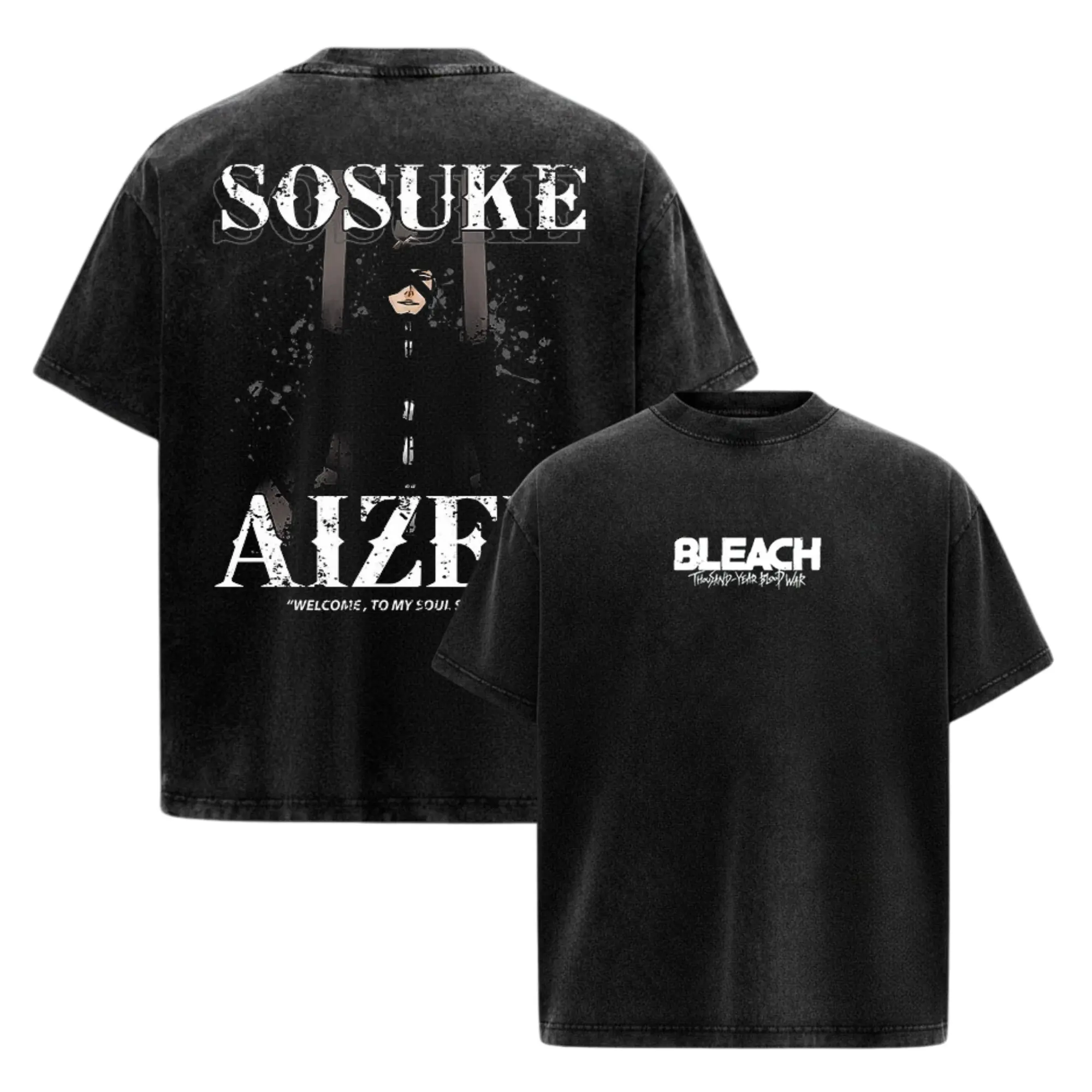 5. Aizen Sosuke Bleach Anime Manga Acid Washed 230GSM Heavyweight Cotton T Shirt Collection - Size S to 3XL - Unisex Vintage Streetwear Oversized Crewneck Merch - Gift for Anime Fans