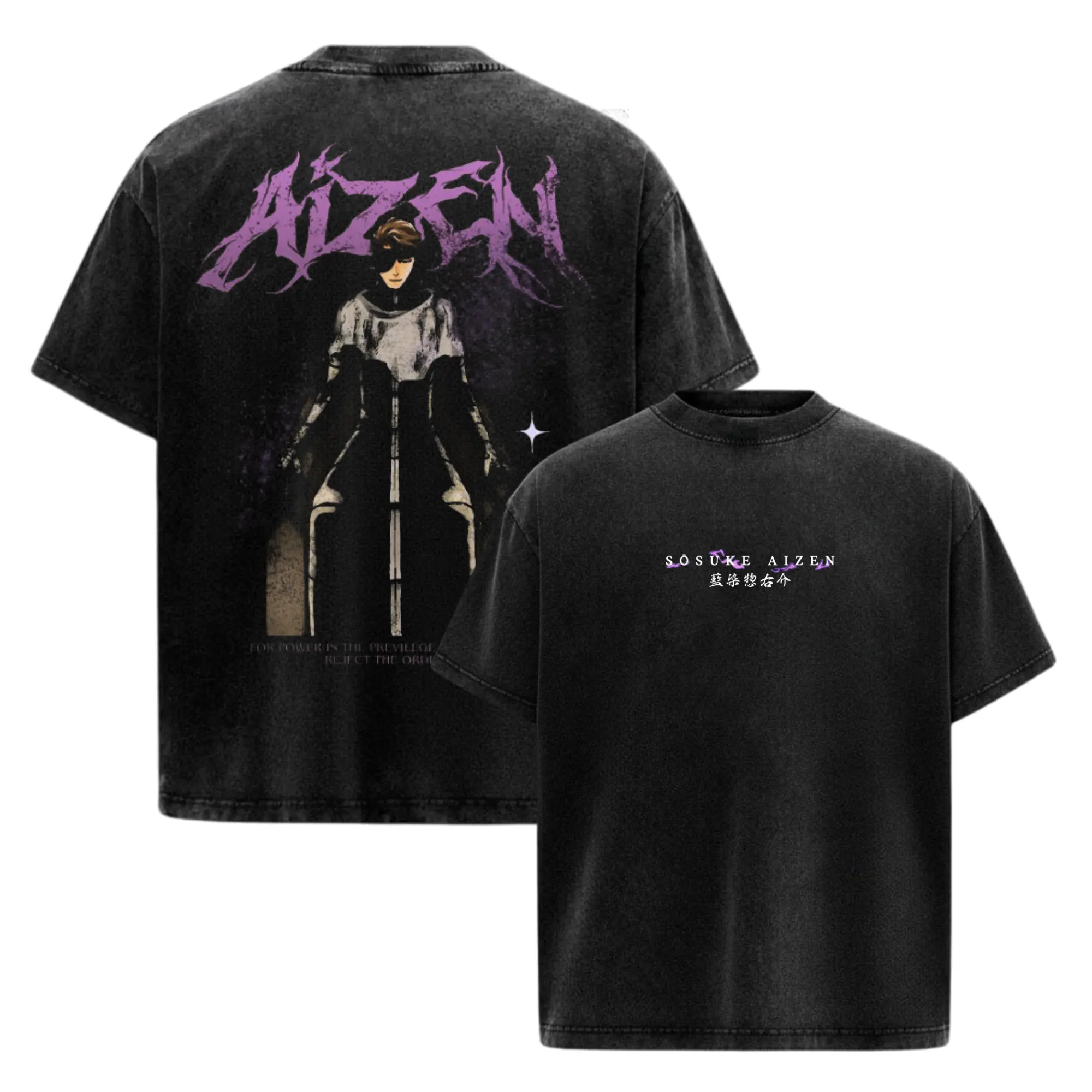 Aizen Sosuke Bleach Anime Manga Acid Washed 230GSM Heavyweight Cotton T Shirt Collection - Size S to 3XL - Unisex Vintage Streetwear Oversized Crewneck Merch - Gift for Anime Fans
